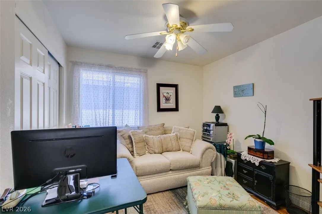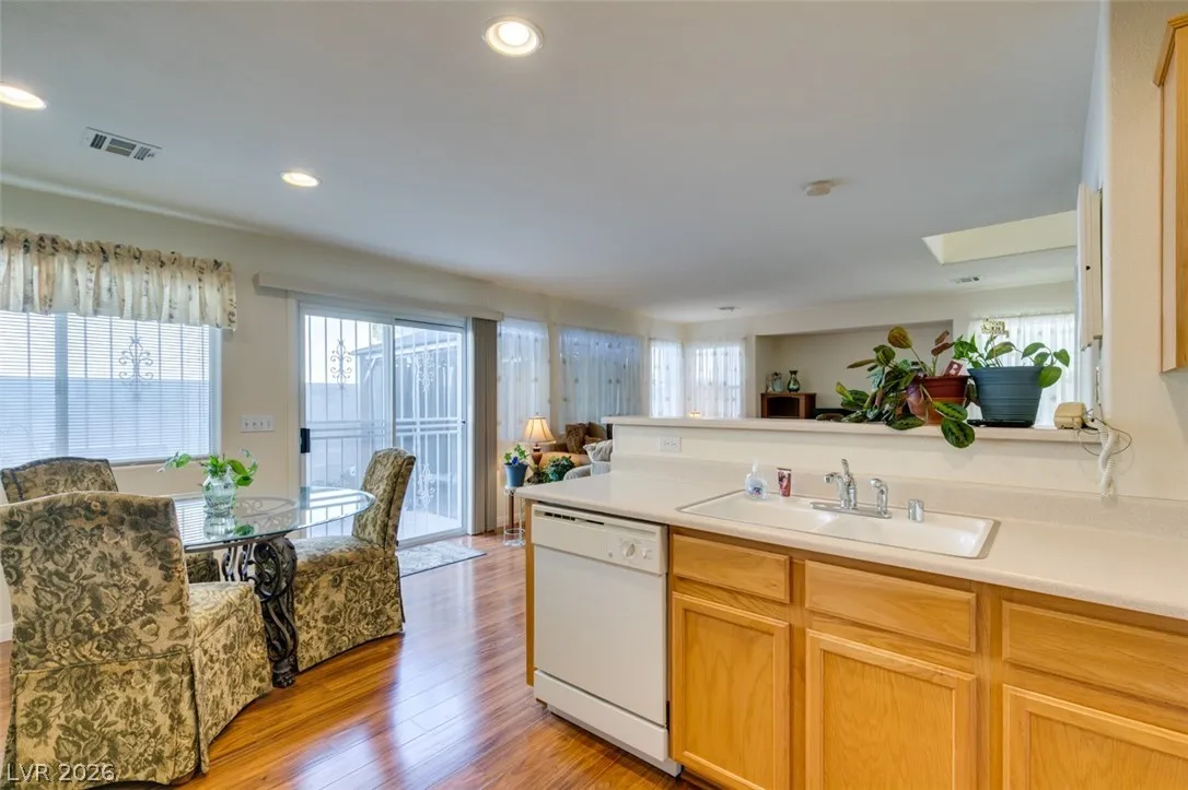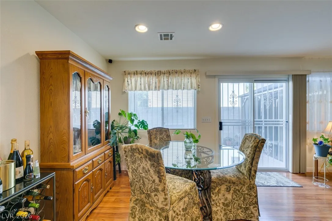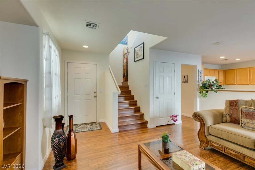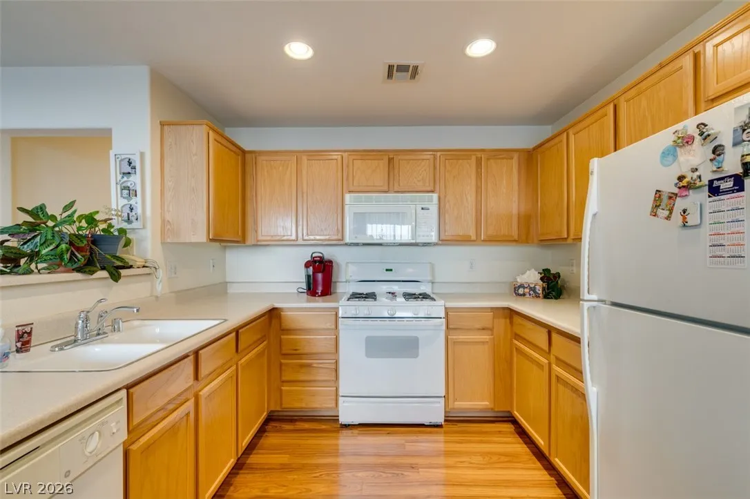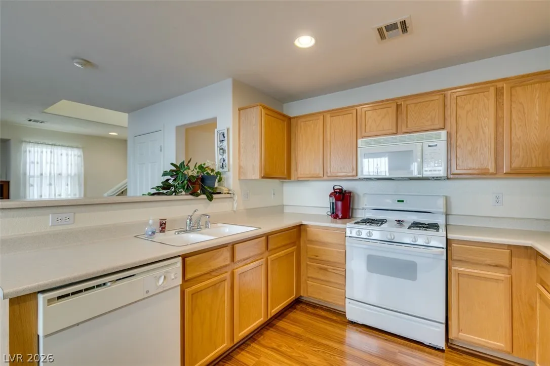 Beautifully updated and well maintained 4 bed, 3 bath, 2 story home located in the gated Silverado Courtyards community of Silverado Ranch. Upgraded wood-like laminate flooring throughout both levels and all 4 bedrooms. Primary bath features a custom shower with iridescent tile walls. The spacious primary bedroom has plenty of windows for natural light and comes complete with a walk-in closet. All four bedrooms have a ceiling fan with light. Separate laundry room conveniently located upstairs. The open concept downstairs connects a large living room to the dining area and kitchen. Low maintenance backyard featuring a gazebo for added shade and relaxation. All appliances convey with the sale. Convenient location near dozens of West Henderson amenities including restaurants, shopping, Costco, Chicken n Pickle and the future state of the art West Henderson Recreational Center.