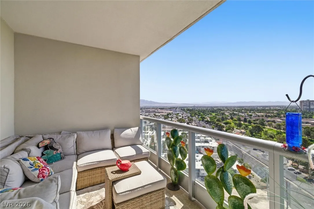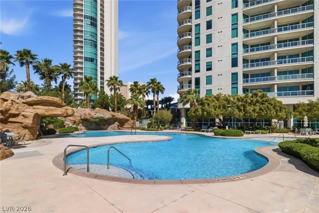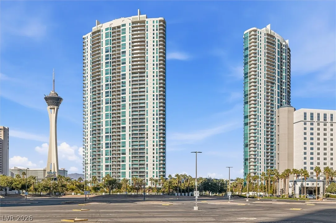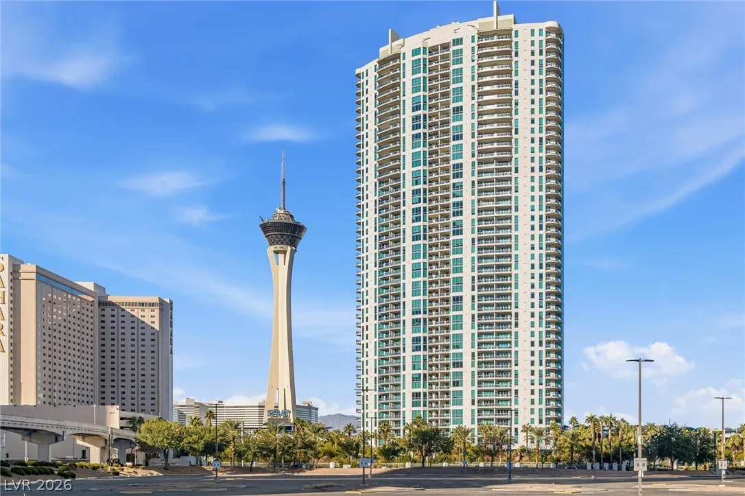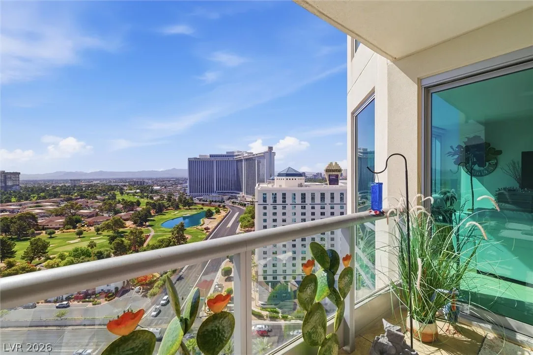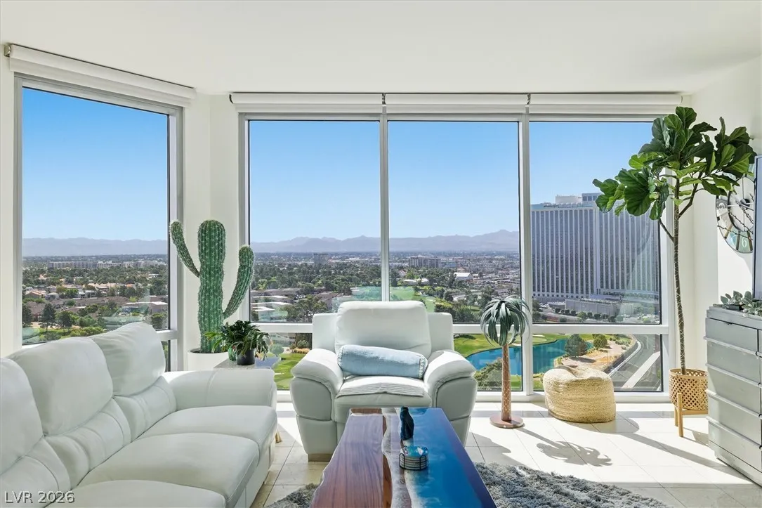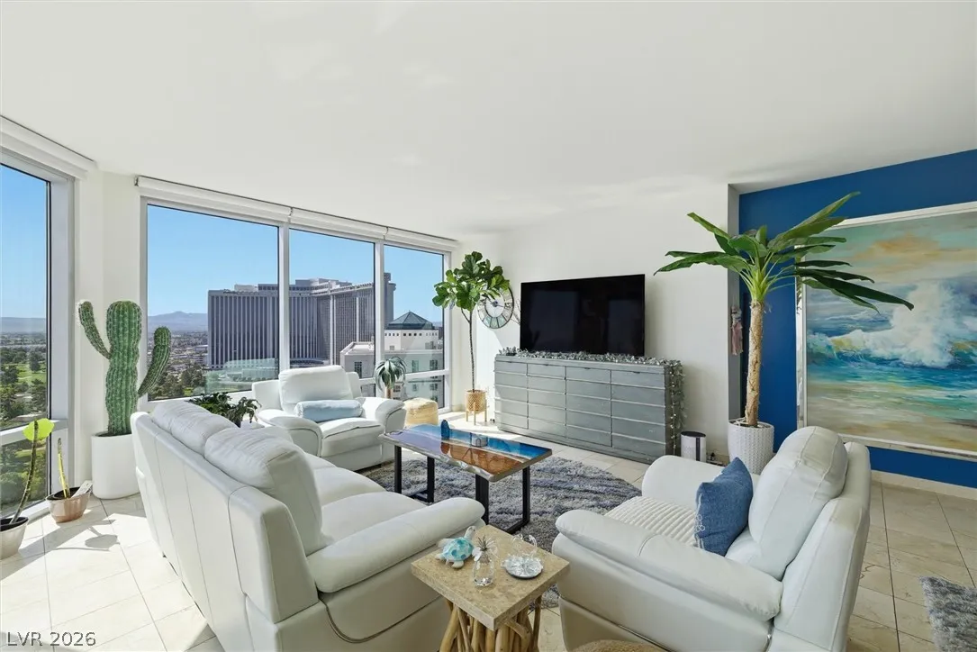 Welcome to Turnberry Towers, a luxury high-rise gated community just one block from the Las Vegas Strip. This residence features rare floor-to-ceiling windows that fill the space with natural light and showcase stunning views. Highlights include granite countertops, upgraded sink and backsplash, Bosch high-efficiency washer and dryer, Snaidero Italian cabinetry, a spacious walk-in closet, and elegant marble bathrooms. Enjoy two large terraces accessible from every room. One facing north toward downtown, the other overlooking the Strip and golf course. Additional upgrades include a new water heater and motorized smart shades. Community amenities feature 24/7 security, a fitness center, lagoon-style pool with waterfalls, jacuzzi, tennis courts, putting green, social room, pet park, valet parking, and 10 acres of lush grounds, all within walking distance to top attractions.