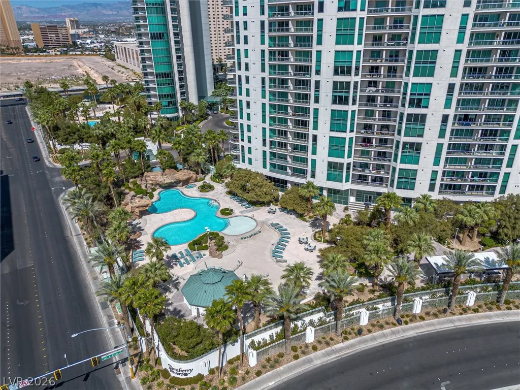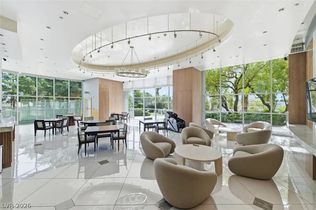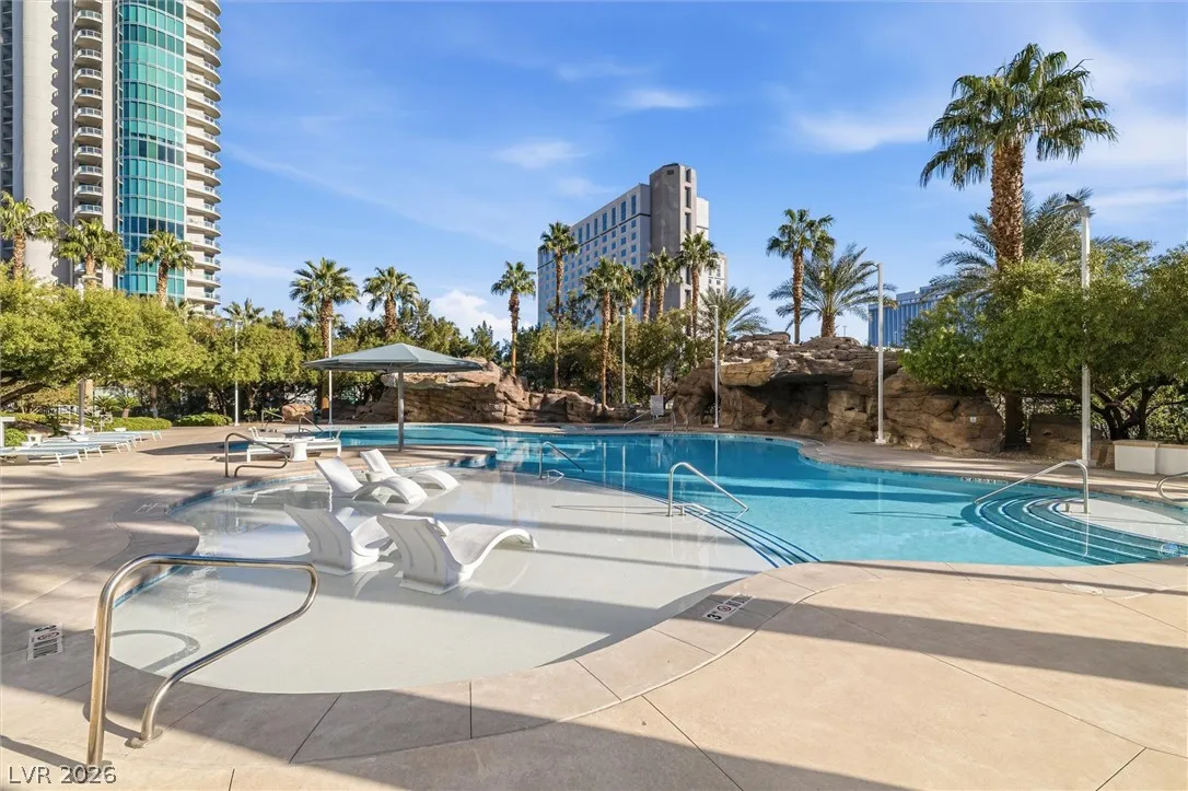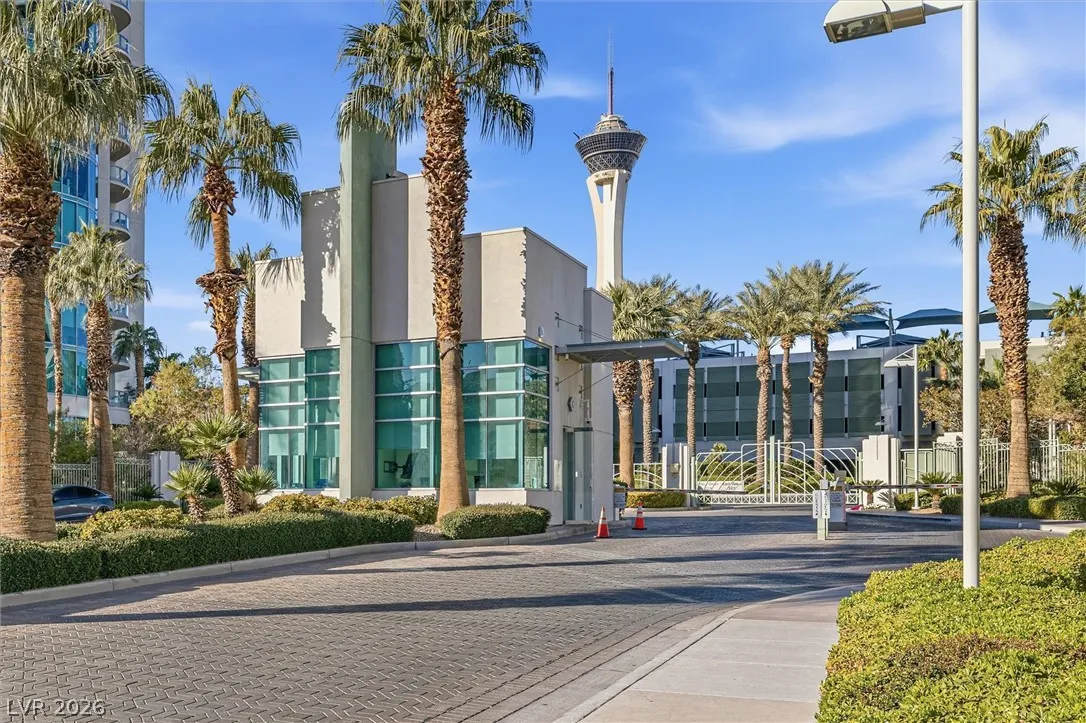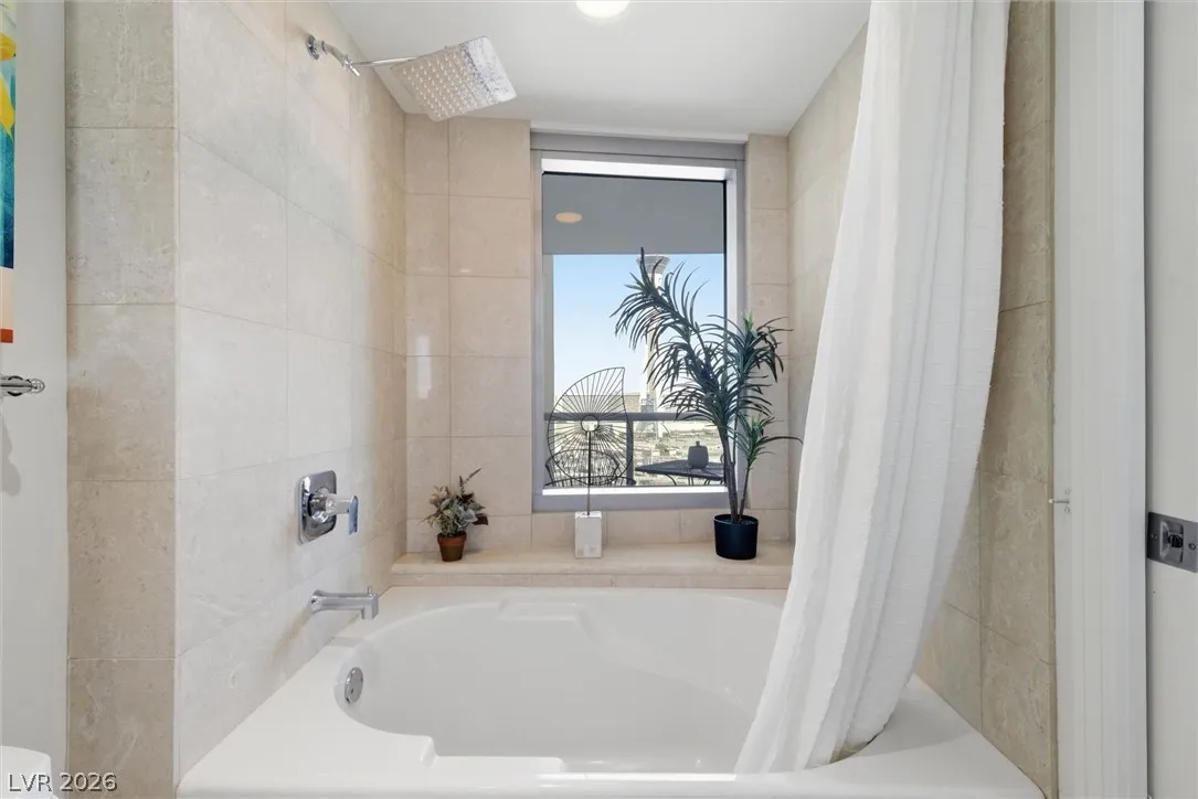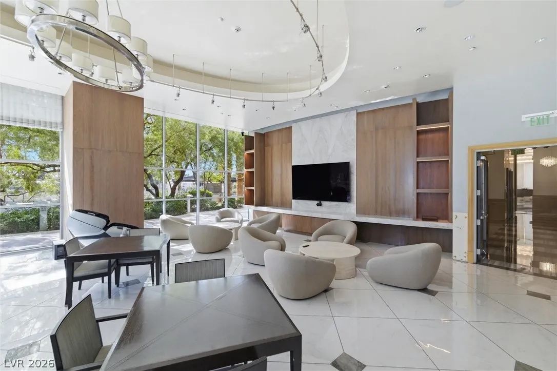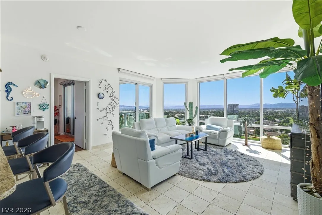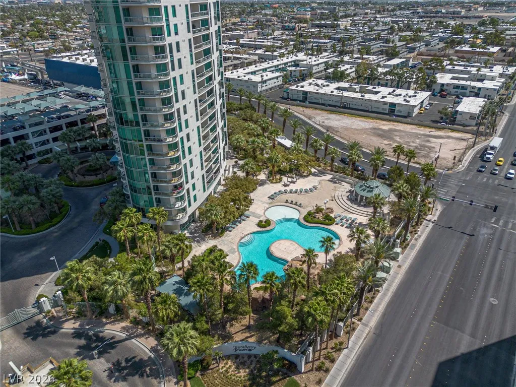 Welcome to Turnberry Towers, a luxury high-rise gated community just one block from the Las Vegas Strip. This residence features rare floor-to-ceiling windows that fill the space with natural light and showcase stunning views. Highlights include granite countertops, upgraded sink and backsplash, Bosch high-efficiency washer and dryer, Snaidero Italian cabinetry, a spacious walk-in closet, and elegant marble bathrooms. Enjoy two large terraces accessible from every room. One facing north toward downtown, the other overlooking the Strip and golf course. Additional upgrades include a new water heater and motorized smart shades. Community amenities feature 24/7 security, a fitness center, lagoon-style pool with waterfalls, jacuzzi, tennis courts, putting green, social room, pet park, valet parking, and 10 acres of lush grounds, all within walking distance to top attractions.