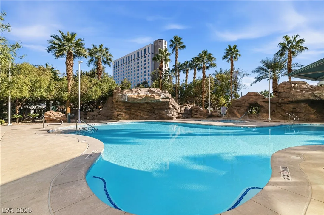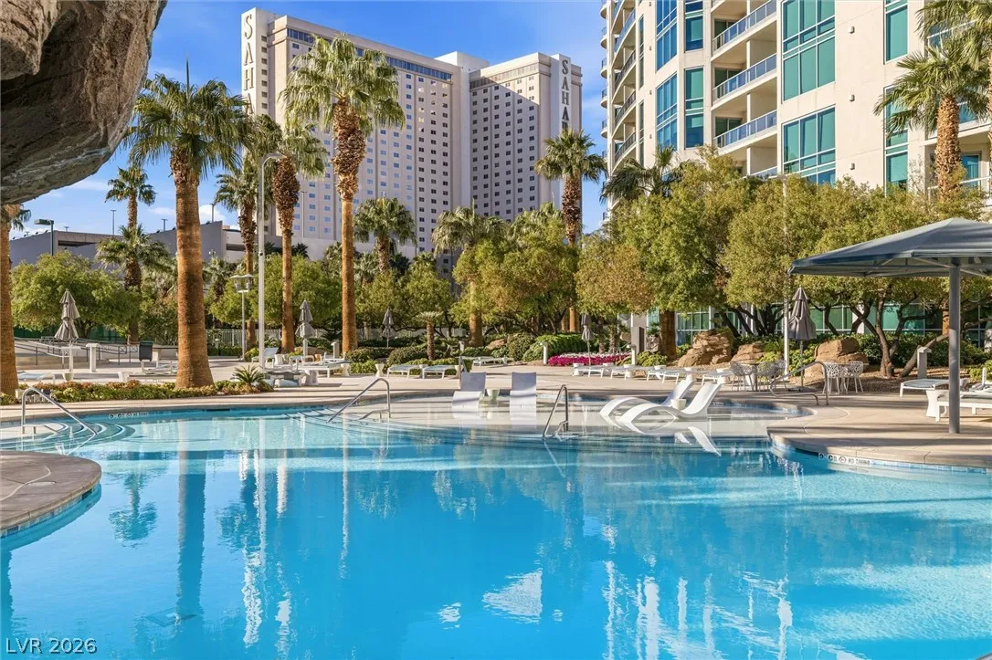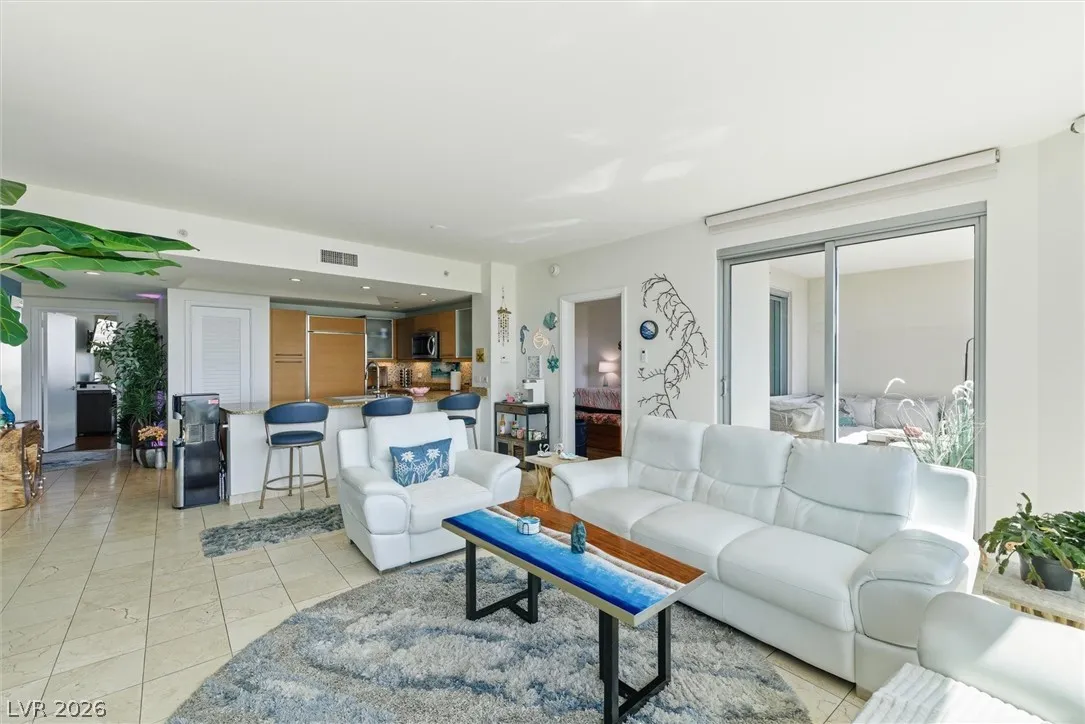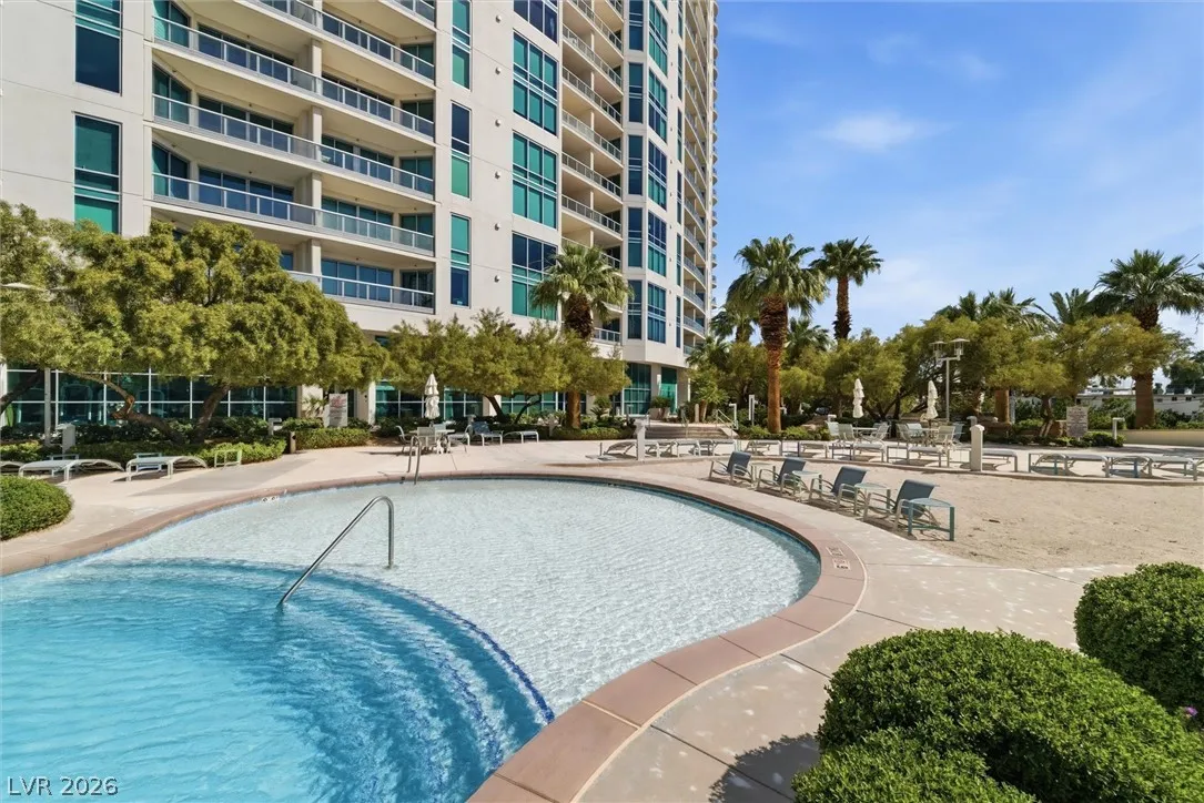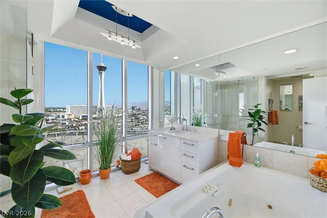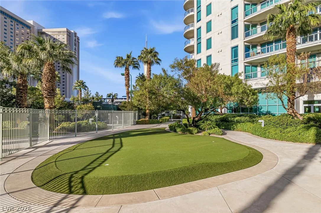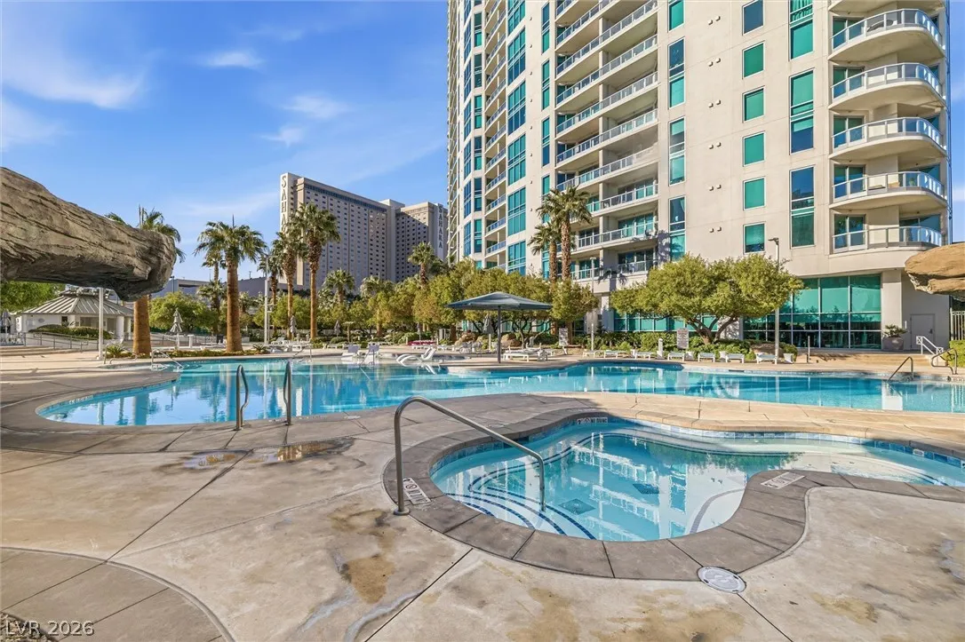Welcome to Turnberry Towers, a luxury high-rise gated community just one block from the Las Vegas Strip. This residence features rare floor-to-ceiling windows that fill the space with natural light and showcase stunning views. Highlights include granite countertops, upgraded sink and backsplash, Bosch high-efficiency washer and dryer, Snaidero Italian cabinetry, a spacious walk-in closet, and elegant marble bathrooms. Enjoy two large terraces accessible from every room. One facing north toward downtown, the other overlooking the Strip and golf course. Additional upgrades include a new water heater and motorized smart shades. Community amenities feature 24/7 security, a fitness center, lagoon-style pool with waterfalls, jacuzzi, tennis courts, putting green, social room, pet park, valet parking, and 10 acres of lush grounds, all within walking distance to top attractions.