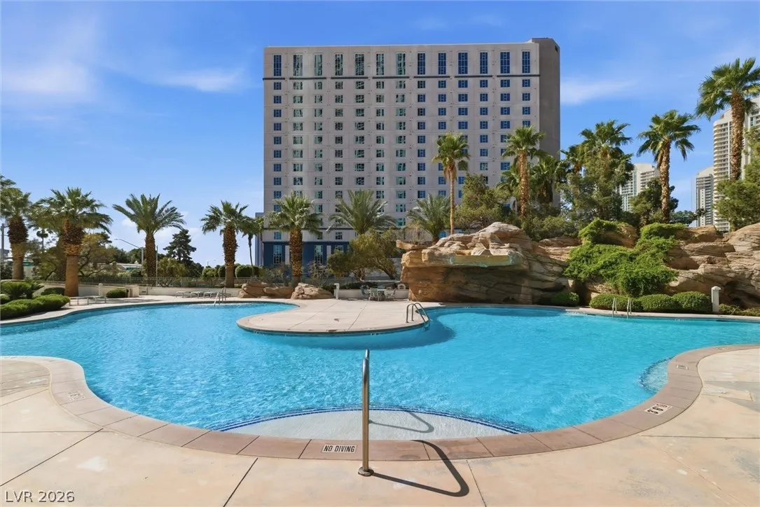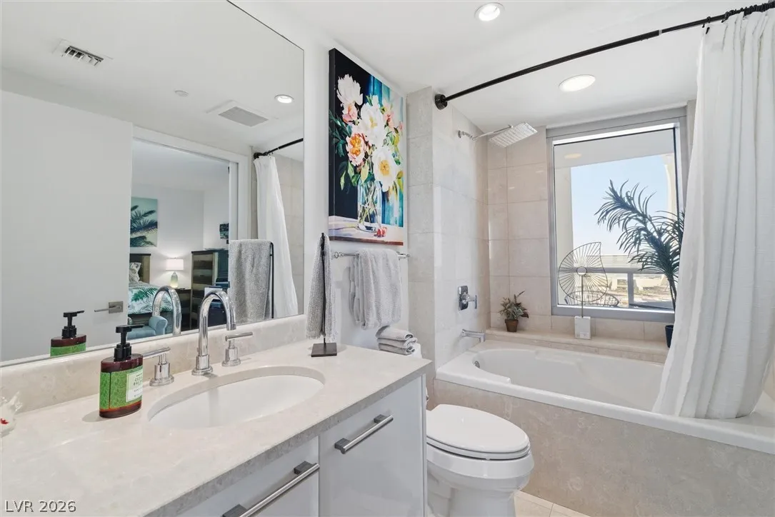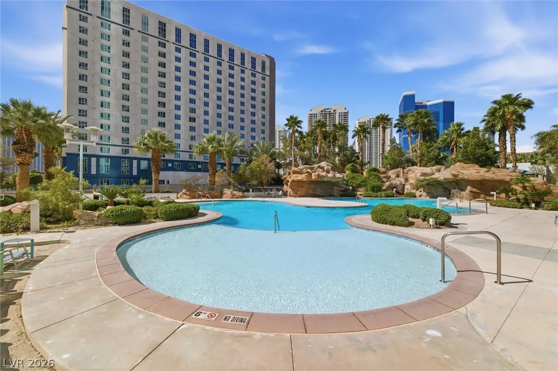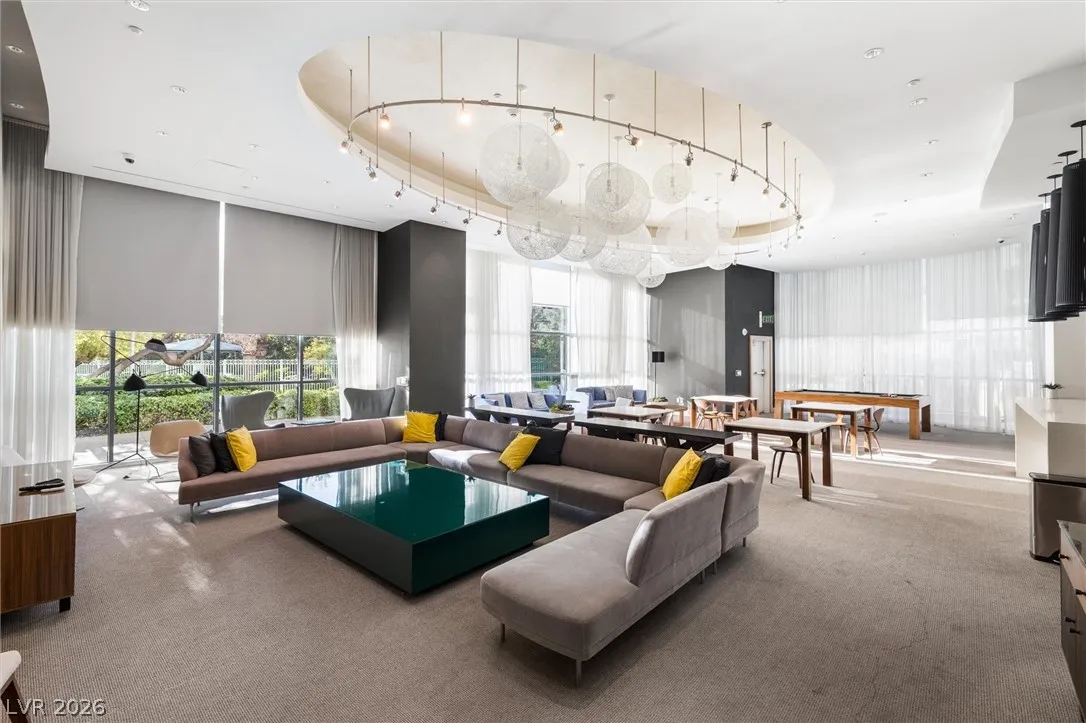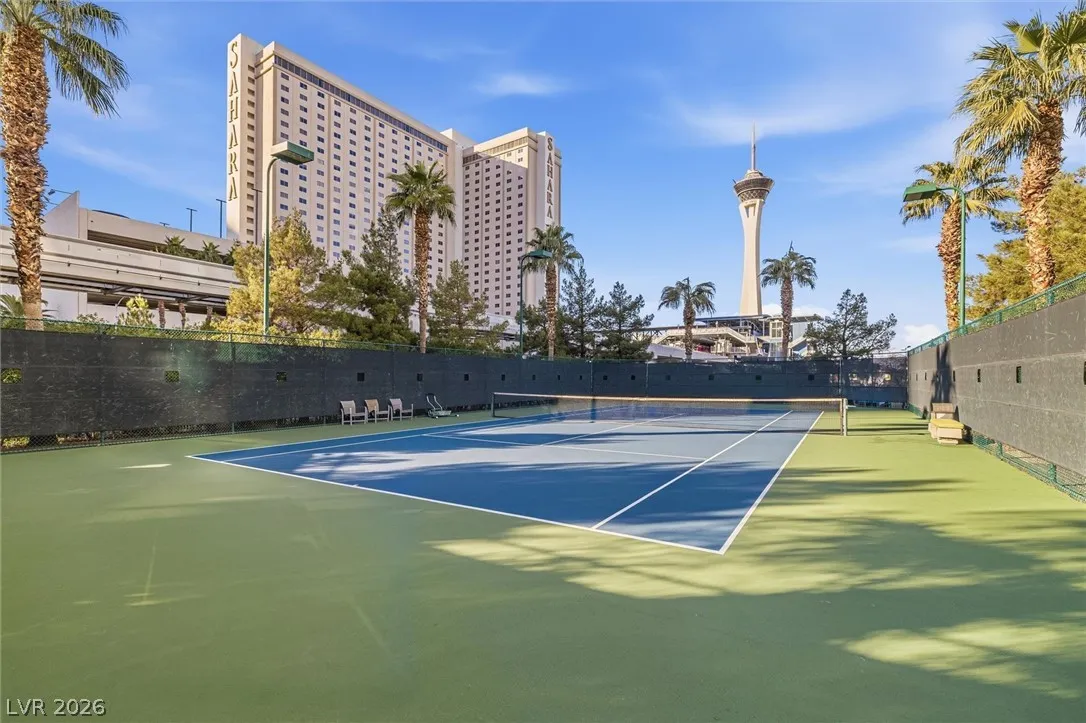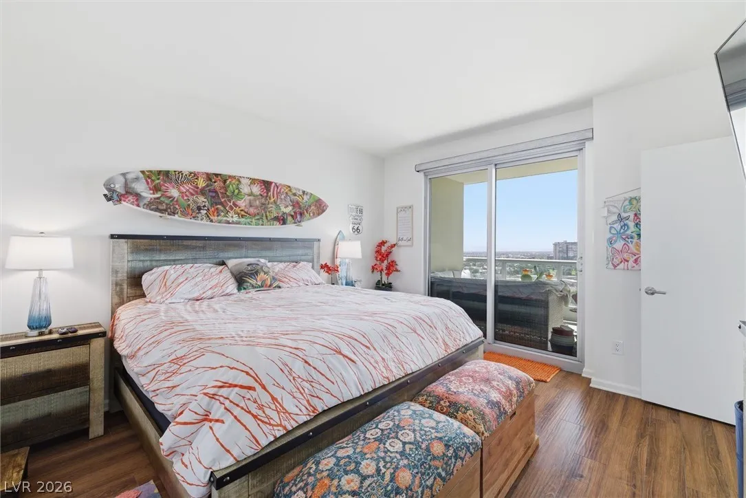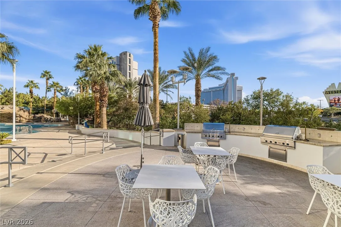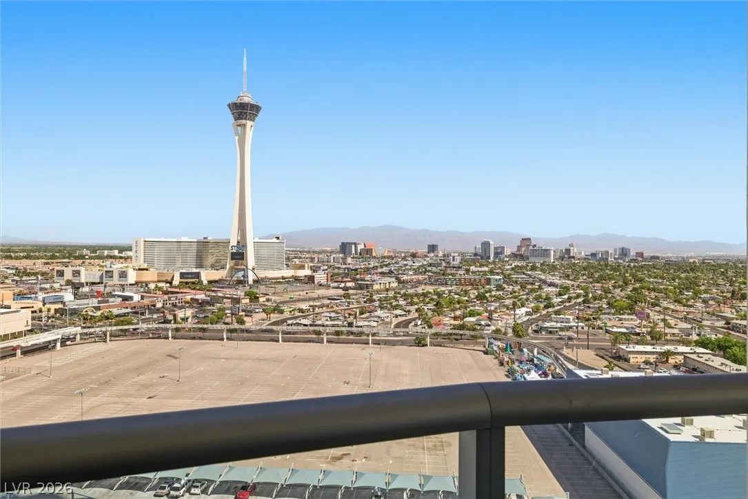 Welcome to Turnberry Towers, a luxury high-rise gated community just one block from the Las Vegas Strip. This residence features rare floor-to-ceiling windows that fill the space with natural light and showcase stunning views. Highlights include granite countertops, upgraded sink and backsplash, Bosch high-efficiency washer and dryer, Snaidero Italian cabinetry, a spacious walk-in closet, and elegant marble bathrooms. Enjoy two large terraces accessible from every room. One facing north toward downtown, the other overlooking the Strip and golf course. Additional upgrades include a new water heater and motorized smart shades. Community amenities feature 24/7 security, a fitness center, lagoon-style pool with waterfalls, jacuzzi, tennis courts, putting green, social room, pet park, valet parking, and 10 acres of lush grounds, all within walking distance to top attractions.