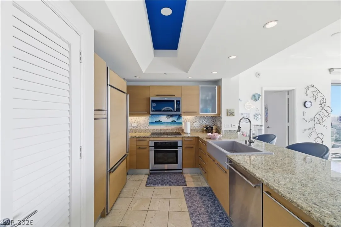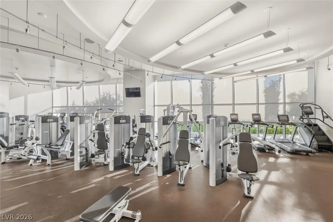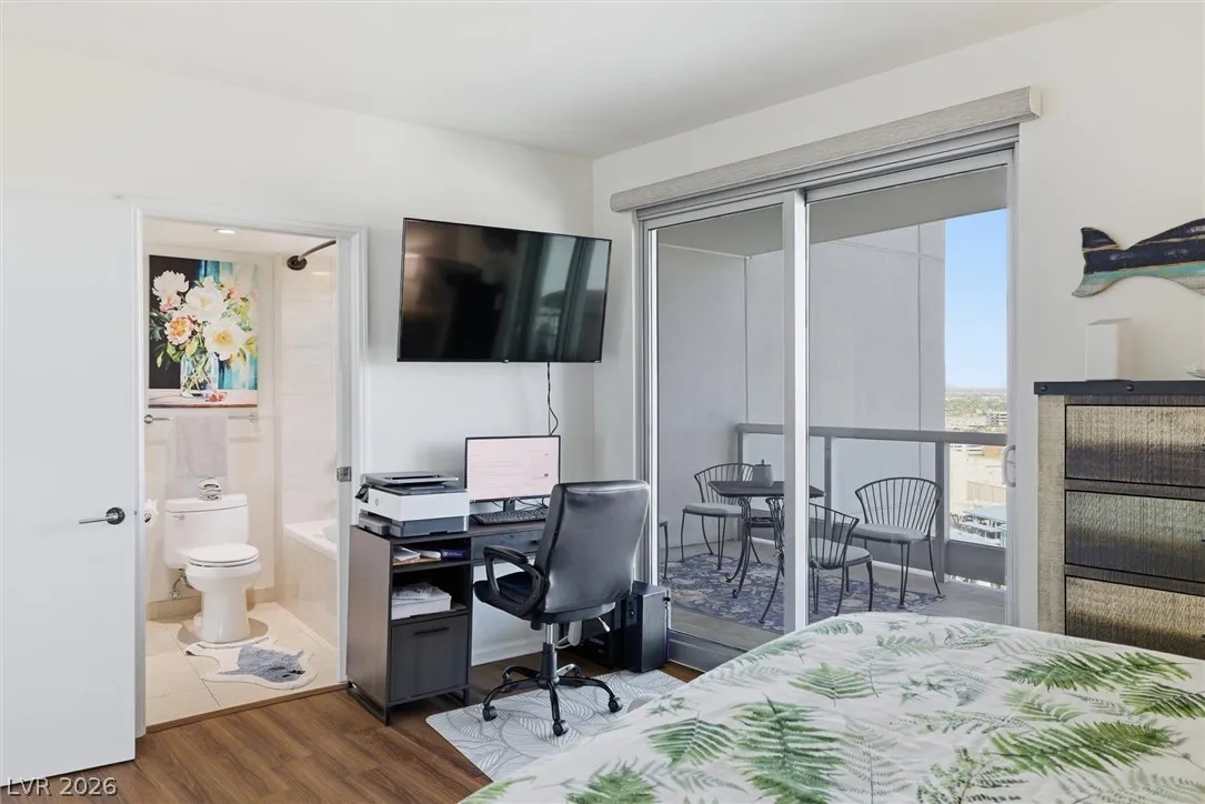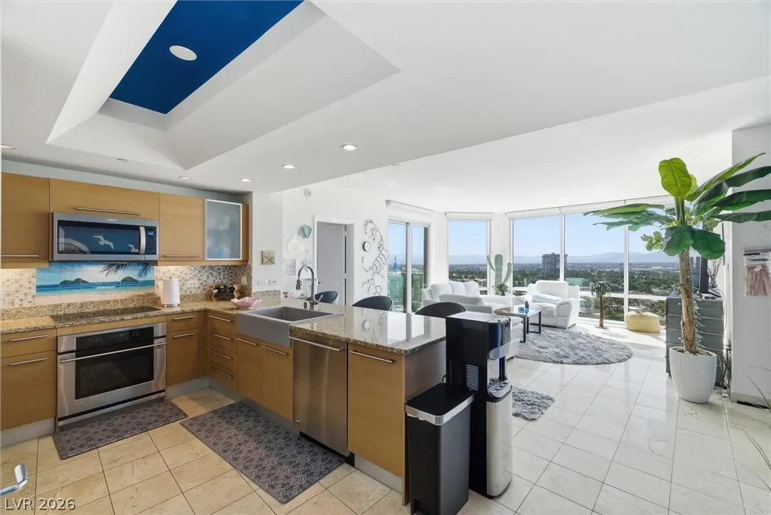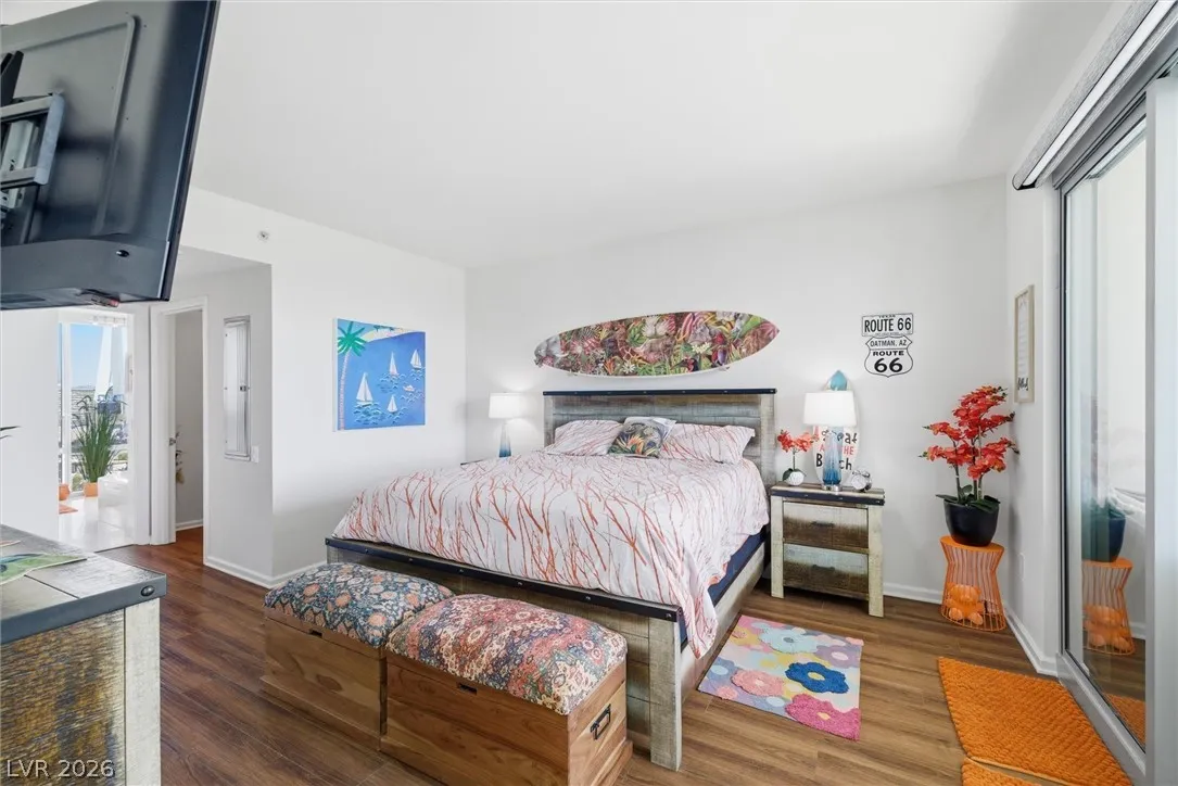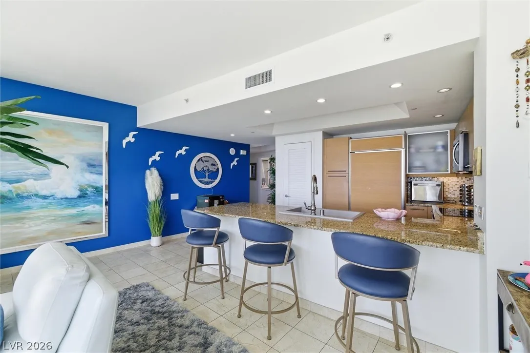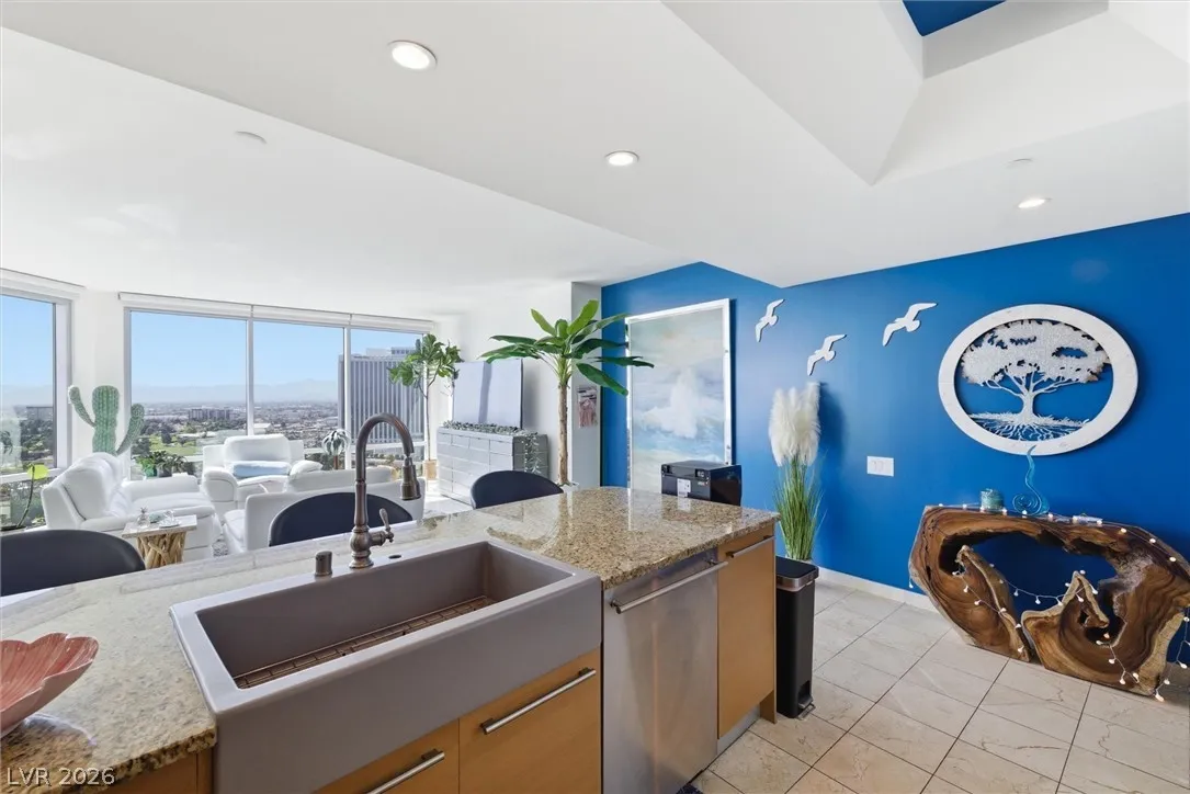Welcome to Turnberry Towers, a luxury high-rise gated community just one block from the Las Vegas Strip. This residence features rare floor-to-ceiling windows that fill the space with natural light and showcase stunning views. Highlights include granite countertops, upgraded sink and backsplash, Bosch high-efficiency washer and dryer, Snaidero Italian cabinetry, a spacious walk-in closet, and elegant marble bathrooms. Enjoy two large terraces accessible from every room. One facing north toward downtown, the other overlooking the Strip and golf course. Additional upgrades include a new water heater and motorized smart shades. Community amenities feature 24/7 security, a fitness center, lagoon-style pool with waterfalls, jacuzzi, tennis courts, putting green, social room, pet park, valet parking, and 10 acres of lush grounds, all within walking distance to top attractions.