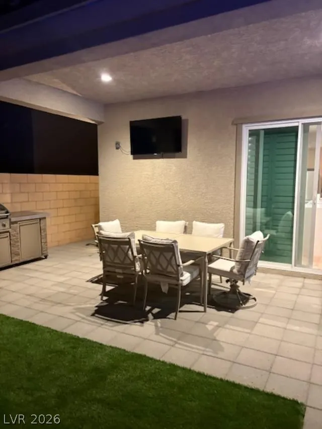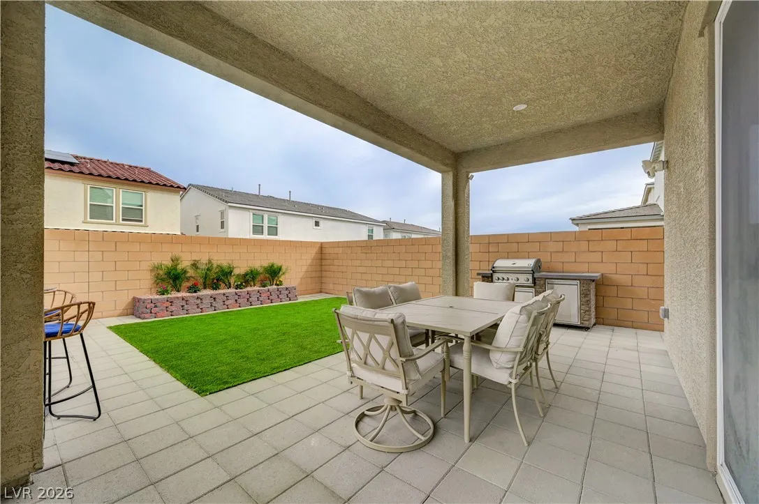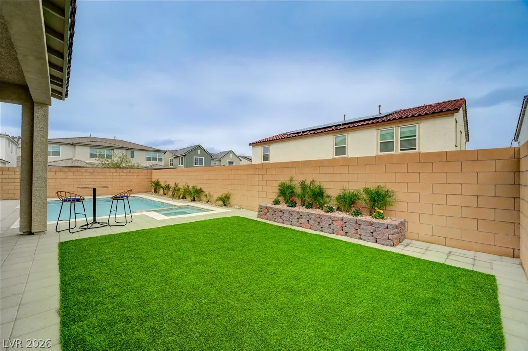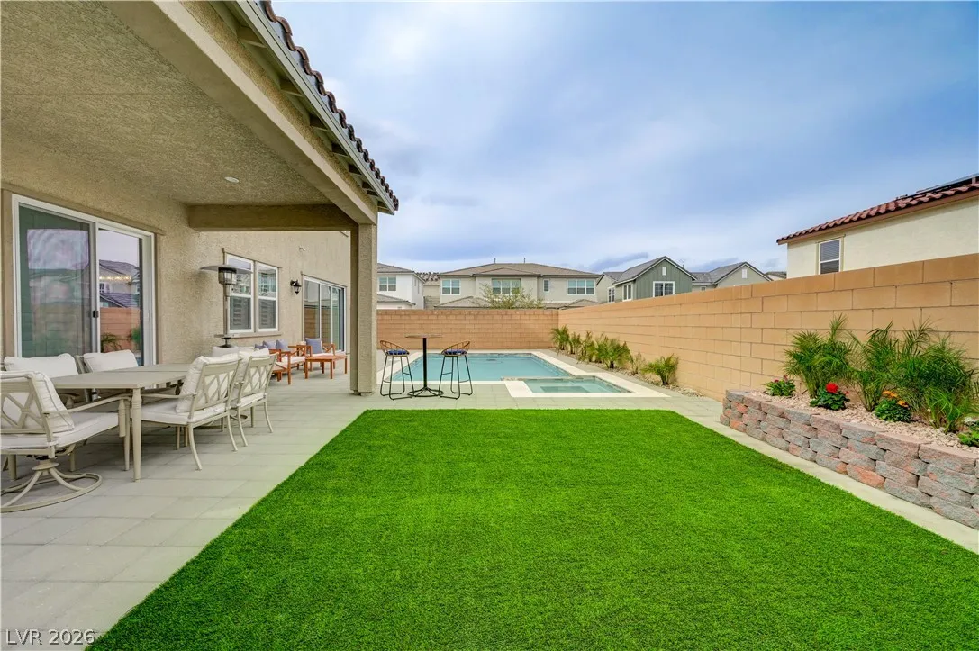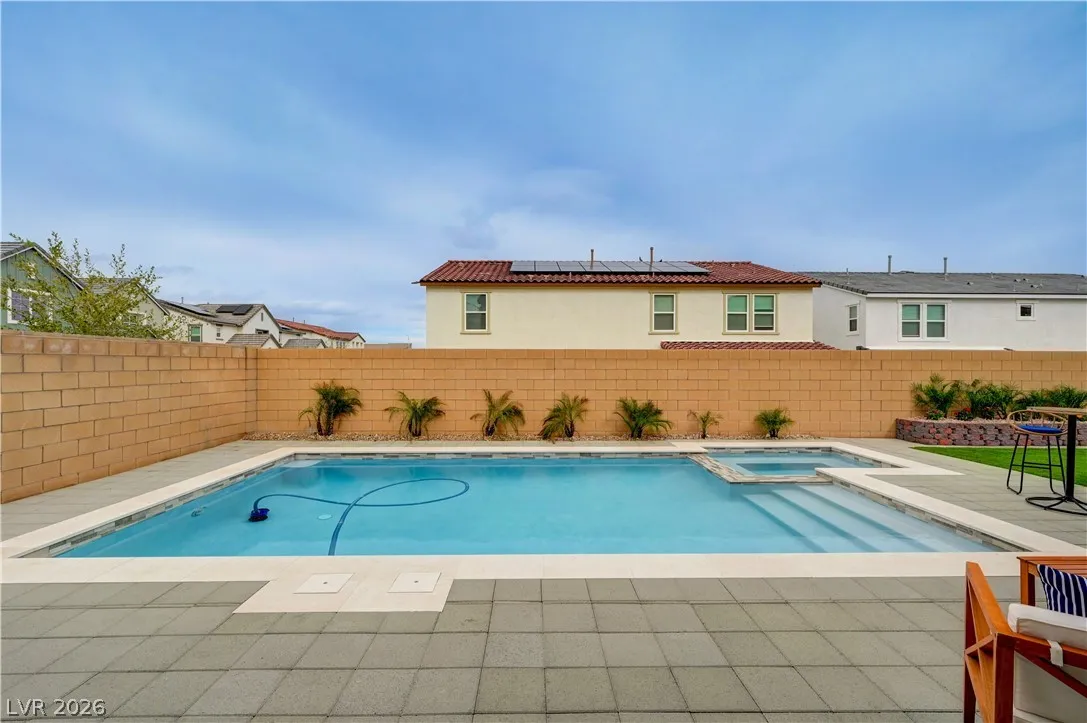 Gorgeous two-story Toll Brothers home in the desirable Skye Canyon community, offering modern luxury and thoughtful upgrades throughout. The stunning kitchen features upgraded cabinets, quartz countertops, a designer backsplash, stainless steel appliances, pot filler, and a spacious butler’s pantry complete with a sink and beverage refrigerator. Wood-like vinyl plank flooring enhances the entire home, adding warmth and style. This impressive 5-bed, 5-bath layout includes a downstairs media room, an open loft upstairs, and beautiful wood panel accent walls that elevate the home’s design. The large backyard is perfect for entertaining with its sparkling pool, relaxing spa, BBQ and covered patio offering plenty of room for gatherings. Most of the furniture can be included in the home and all TV’s included, making this an exceptional move-in-ready opportunity. This is a must see
