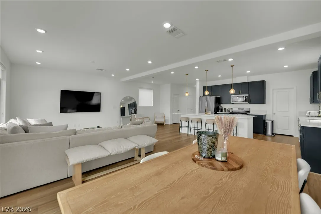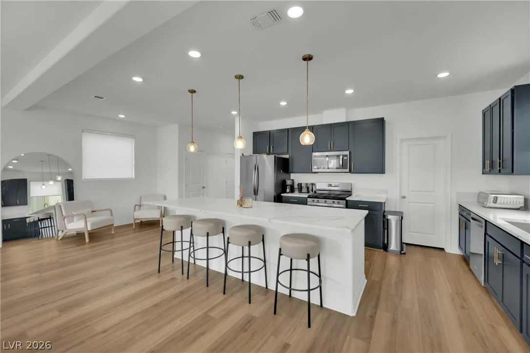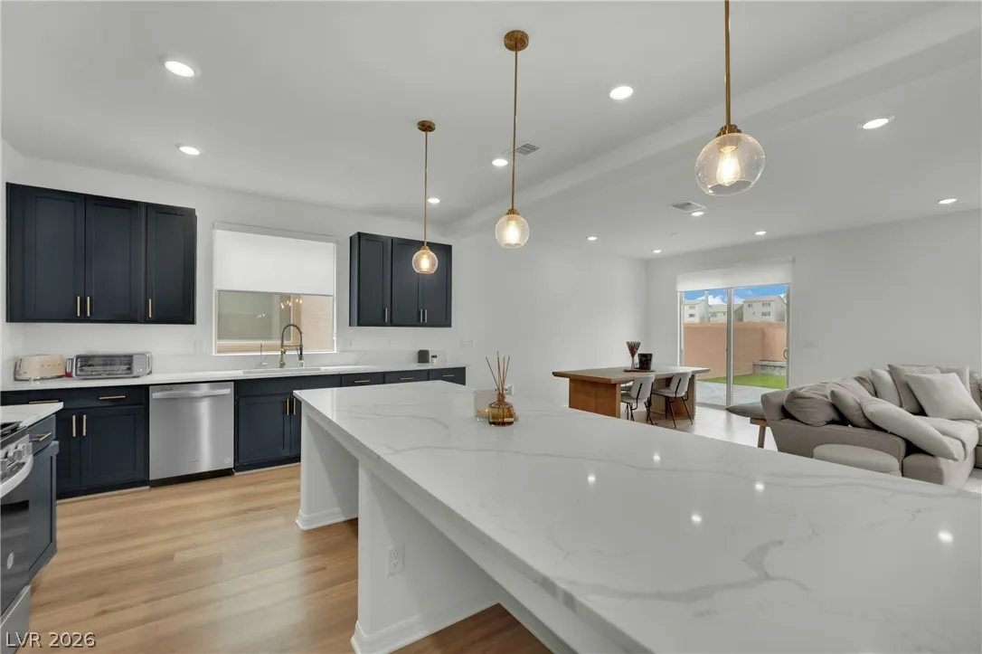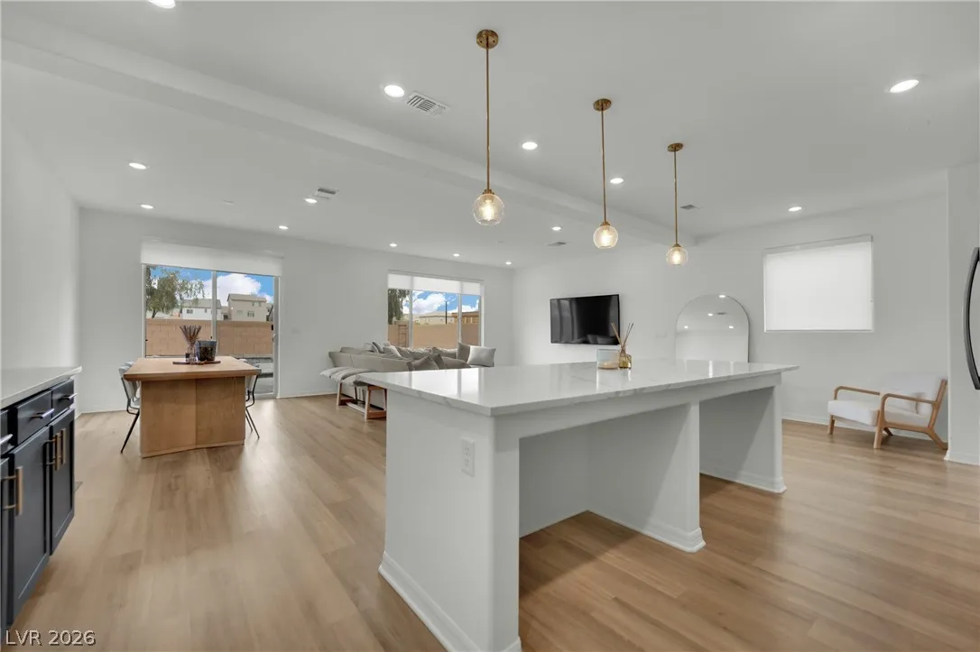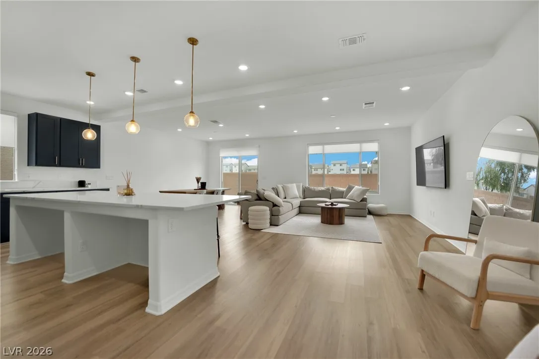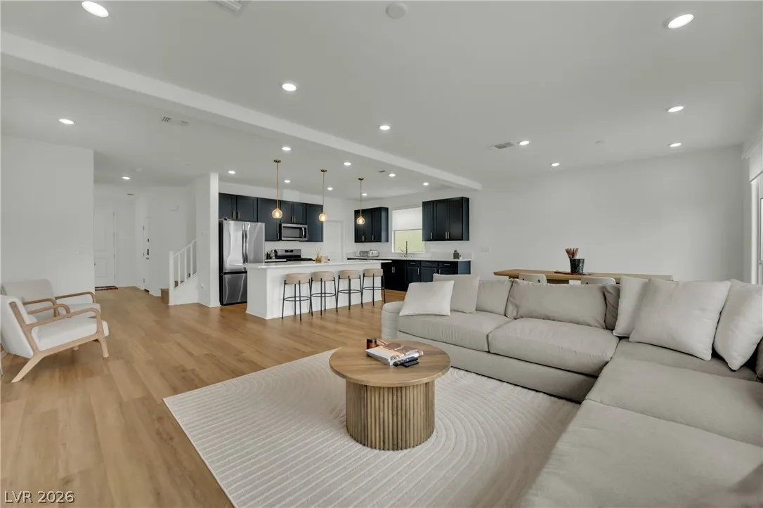 Built in 2024, this modern home offers a great balance of style, comfort, and functionality, featuring an open layout and 9 ft ceilings. The home is highly upgraded with beautiful finishes throughout, creating a clean and cohesive feel. The main living area flows into a well designed kitchen with a large granite island, modern cabinetry with gold hardware, pendant lighting, and stainless steel appliances. Wood laminate flooring runs throughout the home.