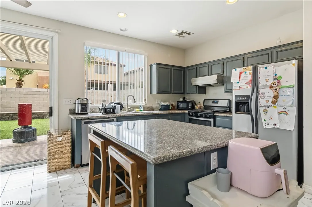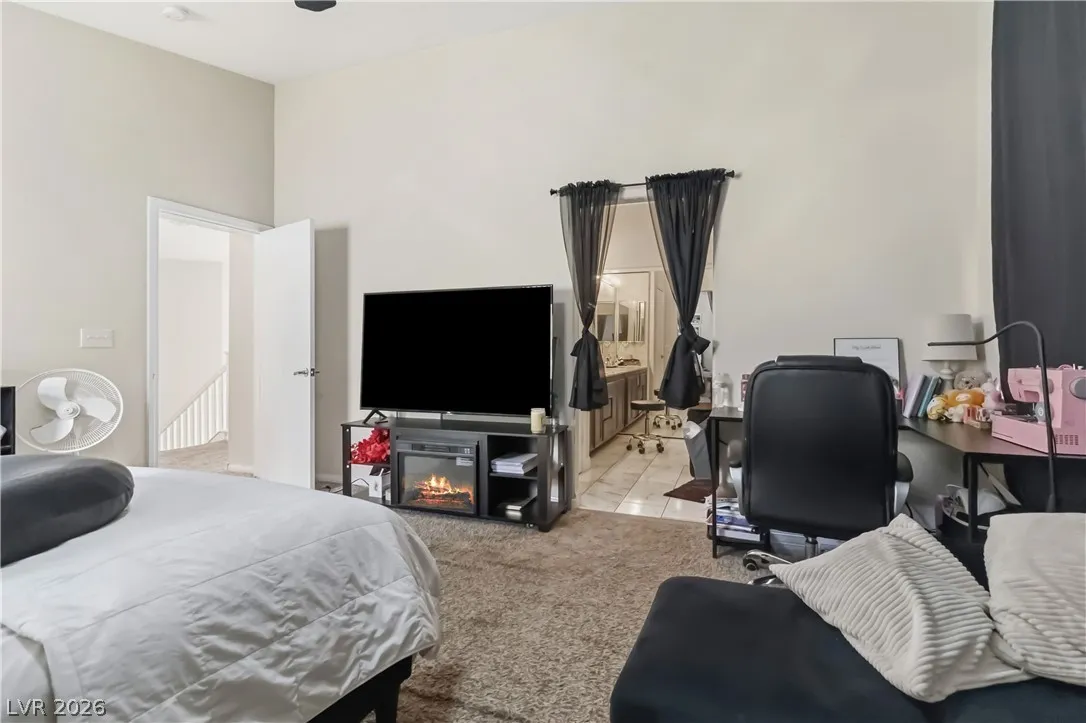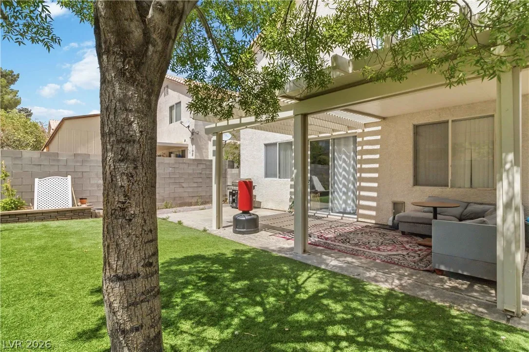 Welcome to this spacious 4-bedroom, 2.5-bath Las Vegas home with vaulted ceilings in the formal living and dining areas—ideal for entertaining or creating a flexible space to suit your needs. The kitchen features stainless steel appliances, a large island, solid surface countertops, and a cozy eat-in area. A two-sided fireplace connects the living and family rooms, adding warmth and character to the main living spaces. Upstairs, you’ll find four generously sized bedrooms, including a primary suite with vaulted ceilings and a walk-in closet. One secondary bedroom offers an oversized layout and also has walk-in closet. The upstairs laundry room adds everyday convenience. The backyard is designed for low-maintenance living, complete with artificial turf, stacked stone planters, and a large covered patio- ideal for outdoor relaxation or entertaining. Conveniently located near shopping, dining, and major roadways, this home offers space, functionality, and a great location.
