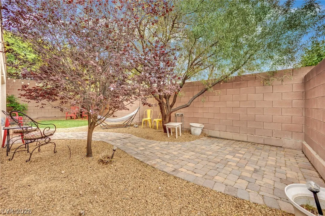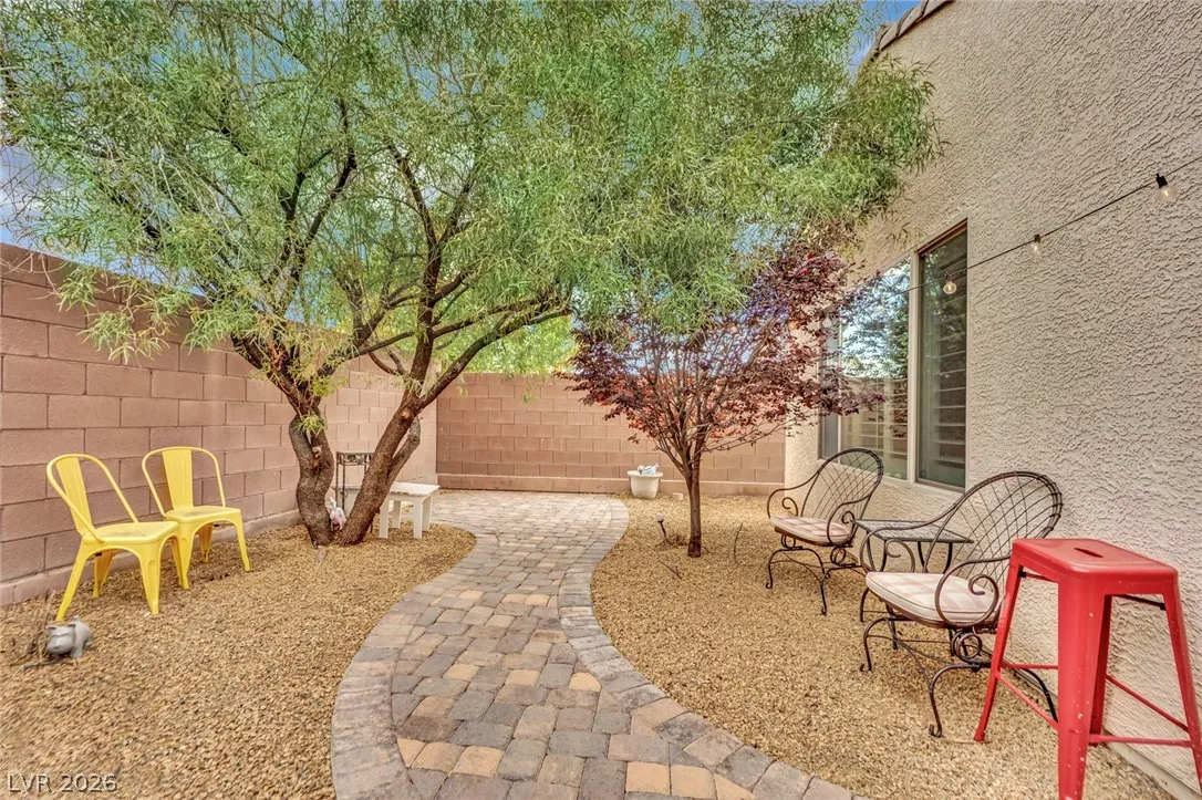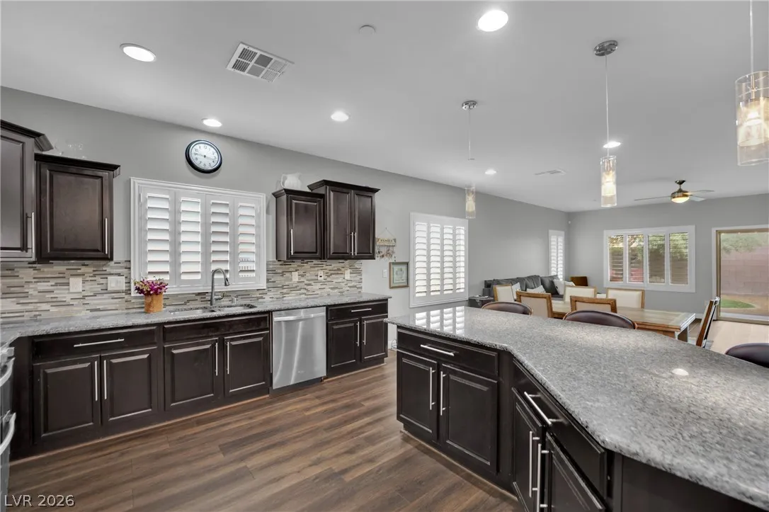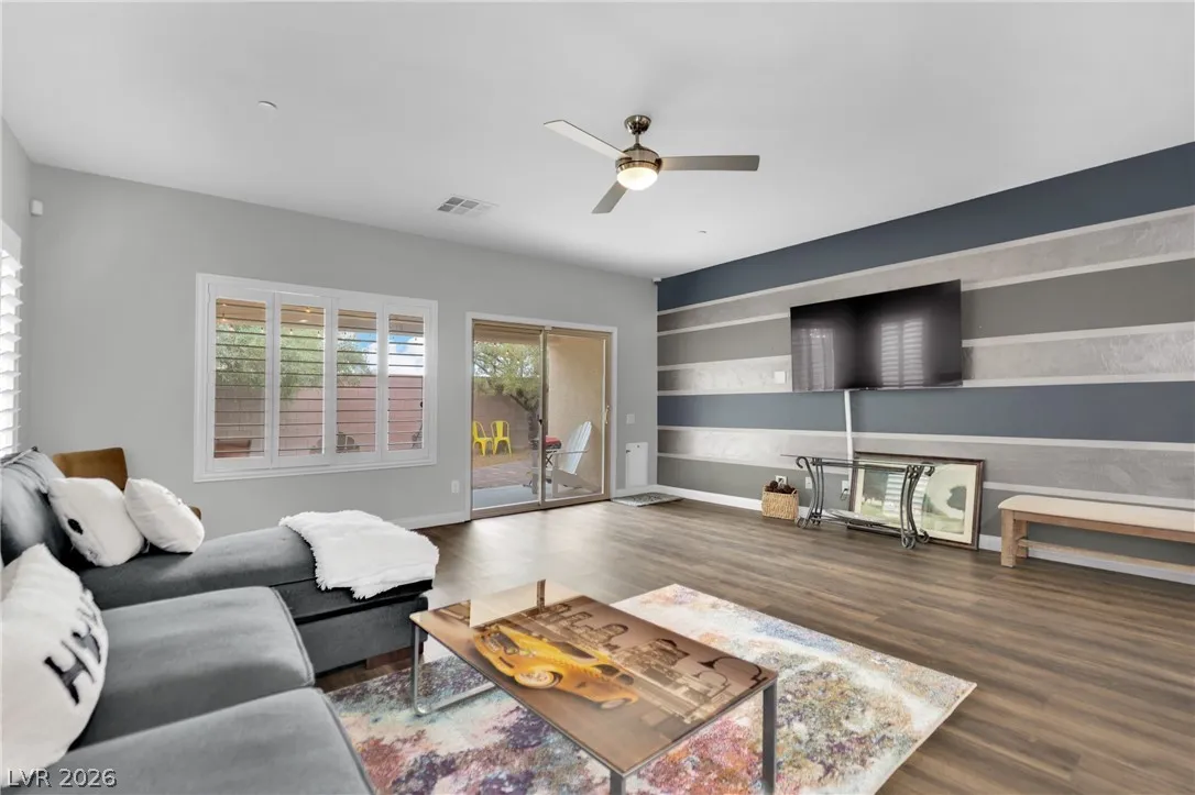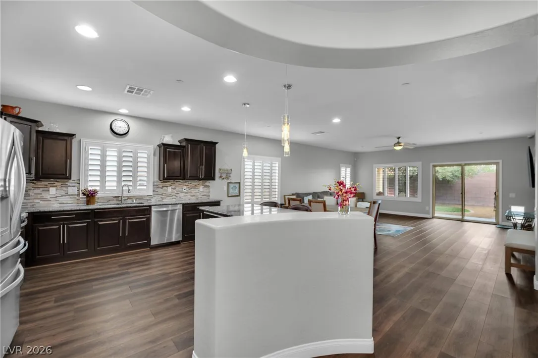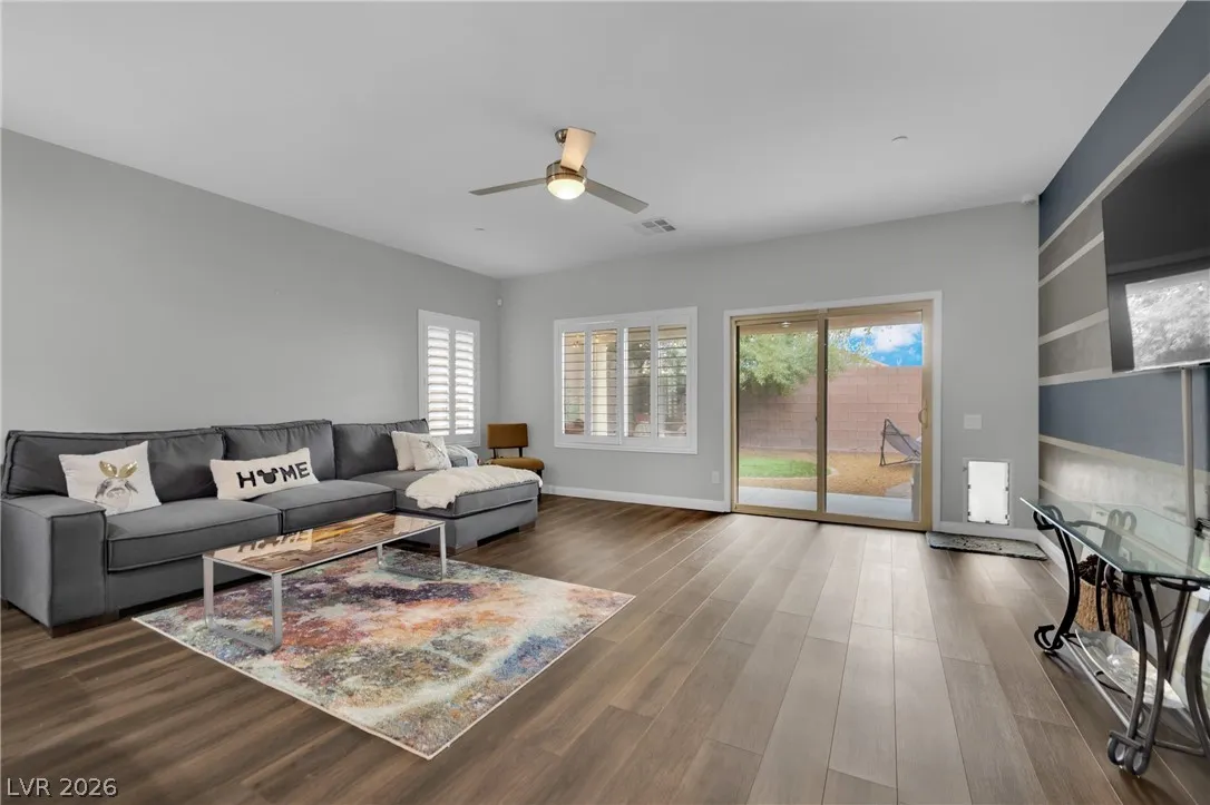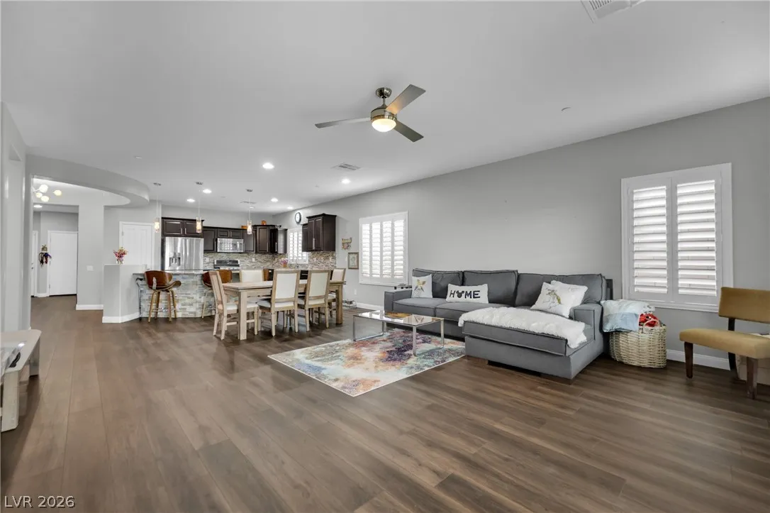 Welcome to your dream residence in the desirable Madeira Canyon community! This beautifully upgraded single-story home features a spacious open floor plan, perfect for modern living. Enjoy the luxury of vinyl plank flooring throughout, enhancing both style and durability. The gourmet kitchen boasts a large island with a breakfast bar, stunning granite countertops, and sleek stainless steel appliances, ideal for culinary enthusiasts.Retreat to the primary bedroom, thoughtfully separated from the other bedrooms for added privacy. The primary bath offers a dual sink vanity, separate tub and shower, and a generous walk-in closet. Step outside to a private backyard oasis with a covered patio, perfect for outdoor entertaining. Additional features include a 2-car attached garage, stylish shutters, and ceiling fans throughout. Don’t miss out on this exceptional home!