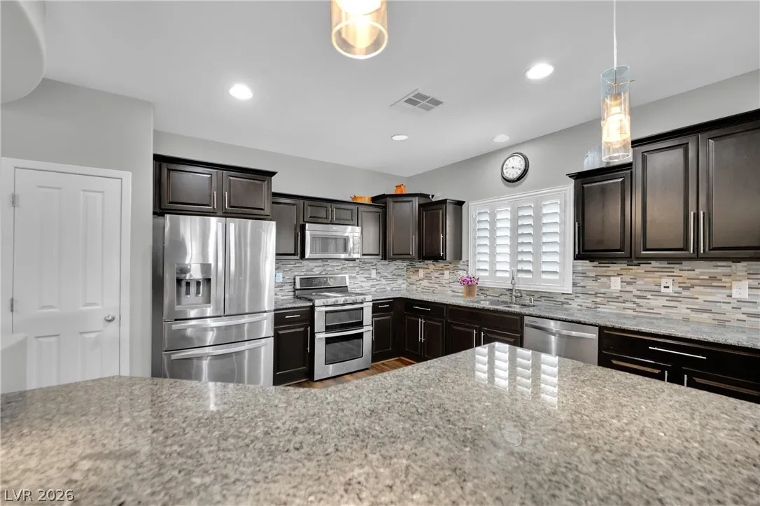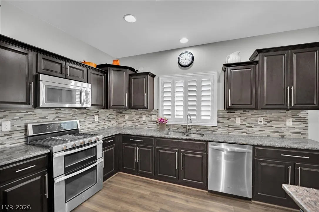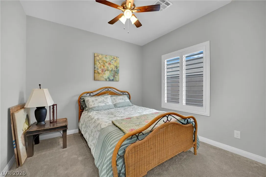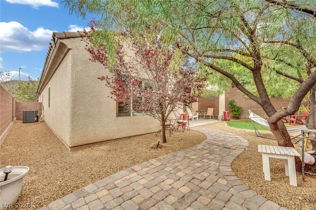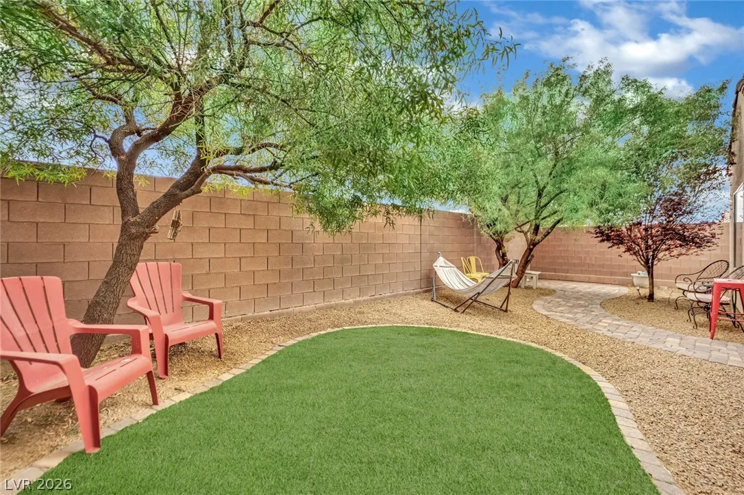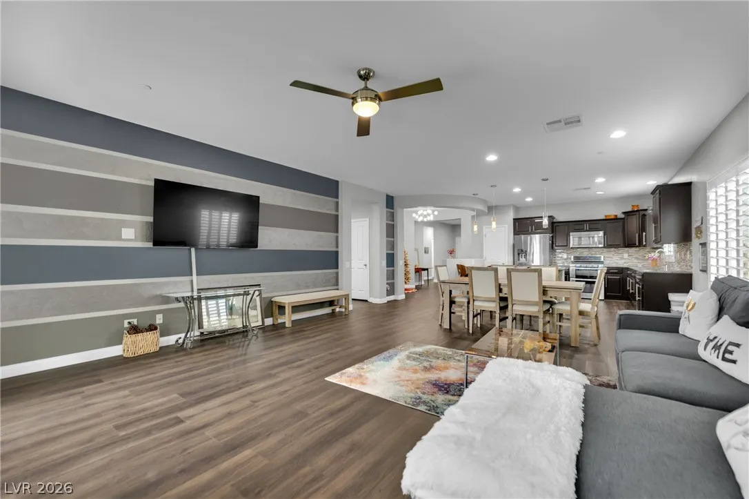 Welcome to your dream residence in the desirable Madeira Canyon community! This beautifully upgraded single-story home features a spacious open floor plan, perfect for modern living. Enjoy the luxury of vinyl plank flooring throughout, enhancing both style and durability. The gourmet kitchen boasts a large island with a breakfast bar, stunning granite countertops, and sleek stainless steel appliances, ideal for culinary enthusiasts.Retreat to the primary bedroom, thoughtfully separated from the other bedrooms for added privacy. The primary bath offers a dual sink vanity, separate tub and shower, and a generous walk-in closet. Step outside to a private backyard oasis with a covered patio, perfect for outdoor entertaining. Additional features include a 2-car attached garage, stylish shutters, and ceiling fans throughout. Don’t miss out on this exceptional home!