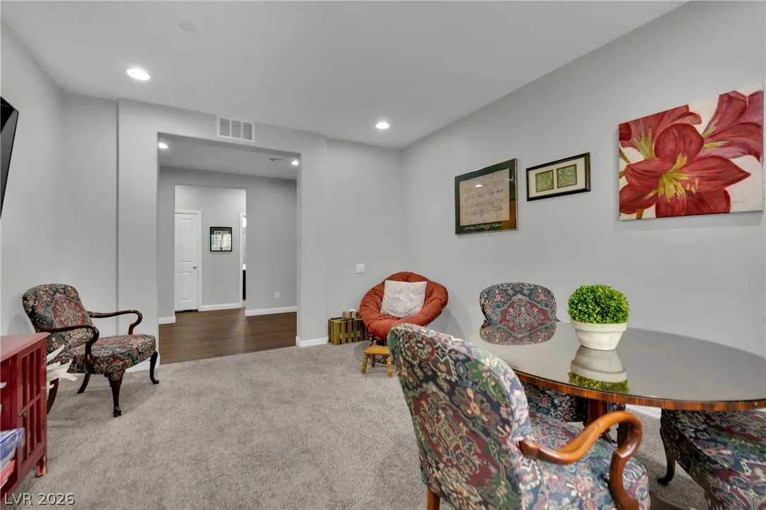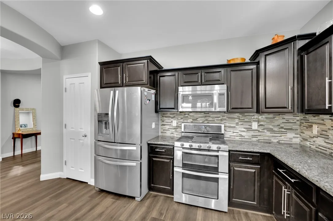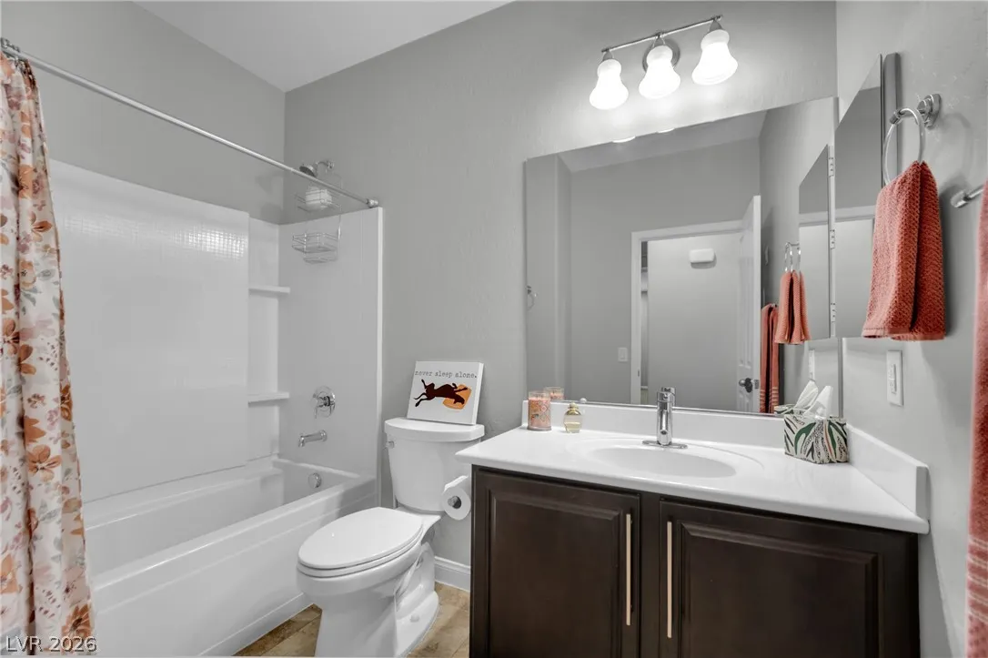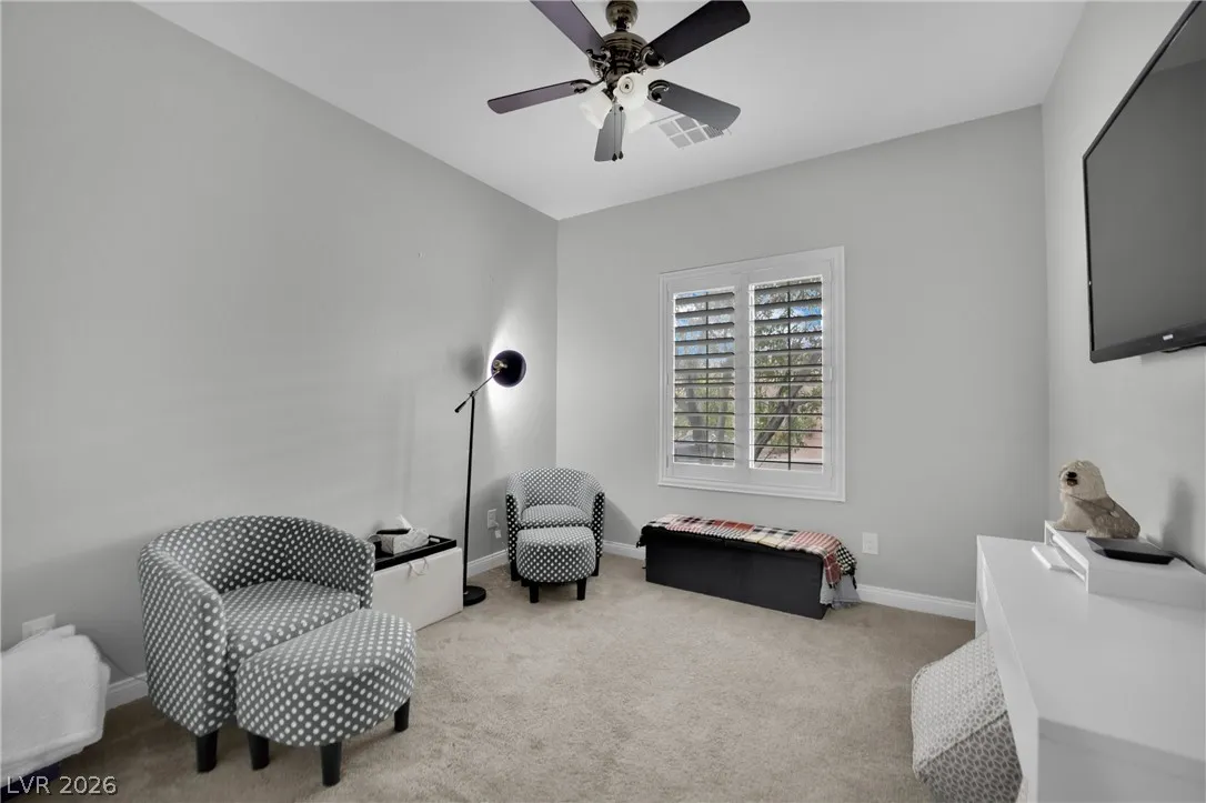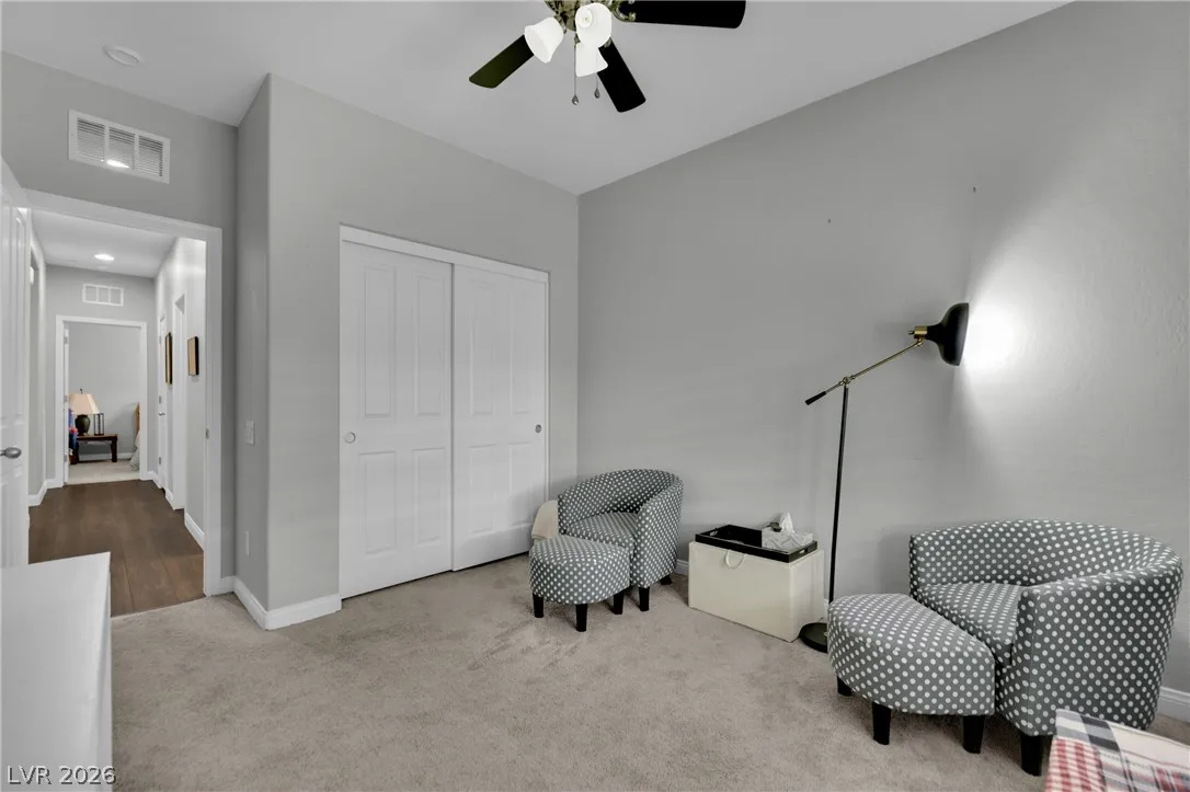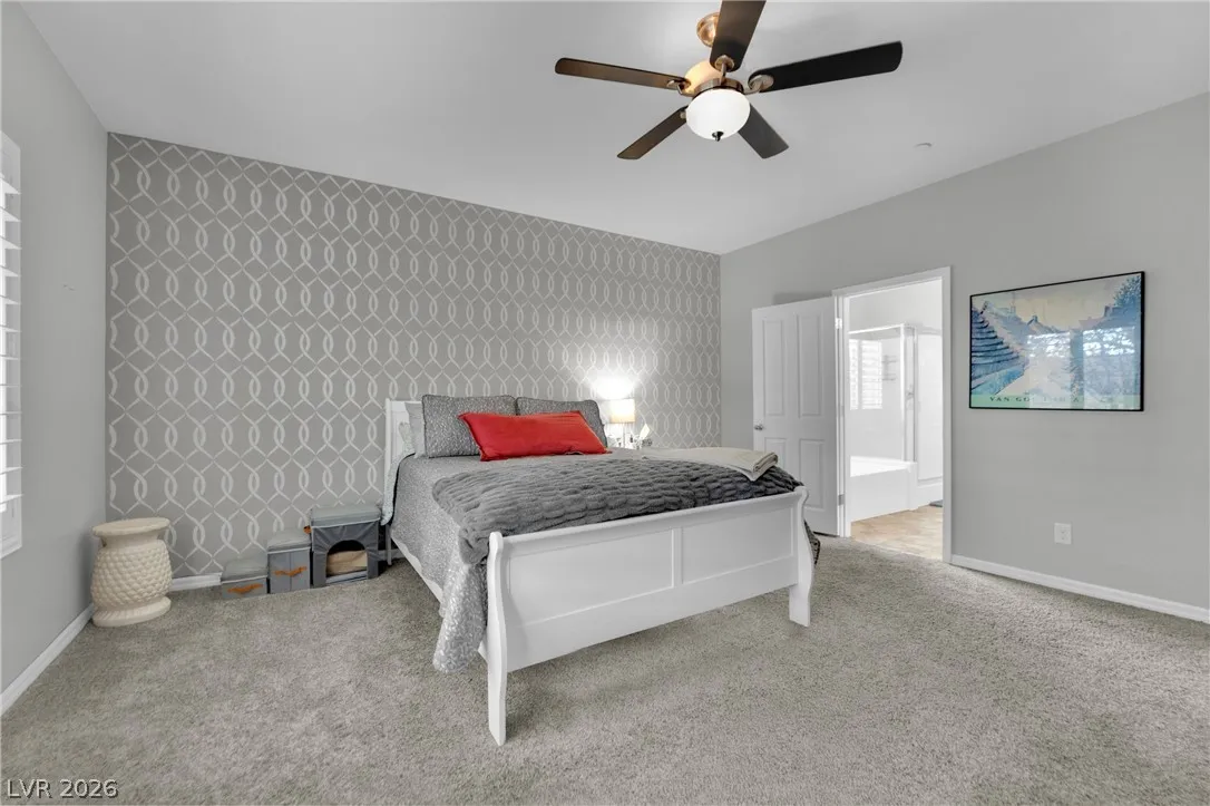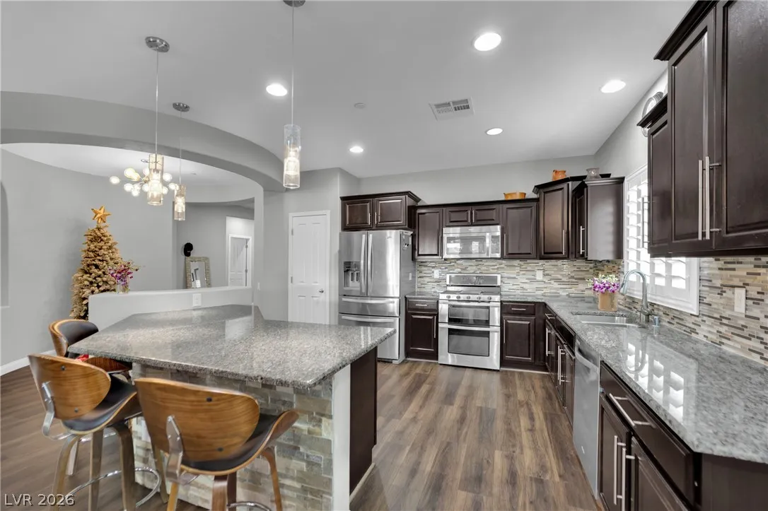 Welcome to your dream residence in the desirable Madeira Canyon community! This beautifully upgraded single-story home features a spacious open floor plan, perfect for modern living. Enjoy the luxury of vinyl plank flooring throughout, enhancing both style and durability. The gourmet kitchen boasts a large island with a breakfast bar, stunning granite countertops, and sleek stainless steel appliances, ideal for culinary enthusiasts.Retreat to the primary bedroom, thoughtfully separated from the other bedrooms for added privacy. The primary bath offers a dual sink vanity, separate tub and shower, and a generous walk-in closet. Step outside to a private backyard oasis with a covered patio, perfect for outdoor entertaining. Additional features include a 2-car attached garage, stylish shutters, and ceiling fans throughout. Don’t miss out on this exceptional home!