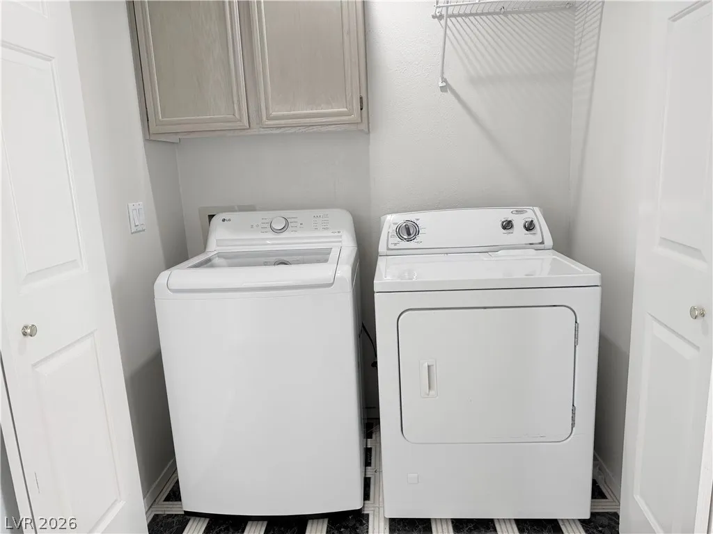 The kitchen is equipped with stainless steel appliances, and a washer and dryer are included in the laundry closet area for added convenience.