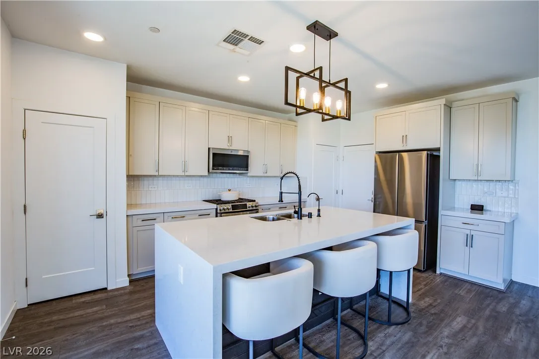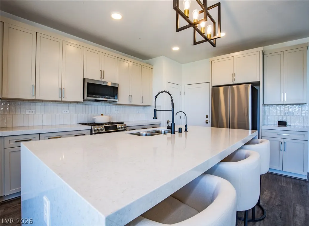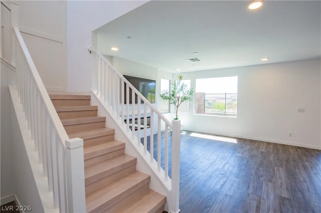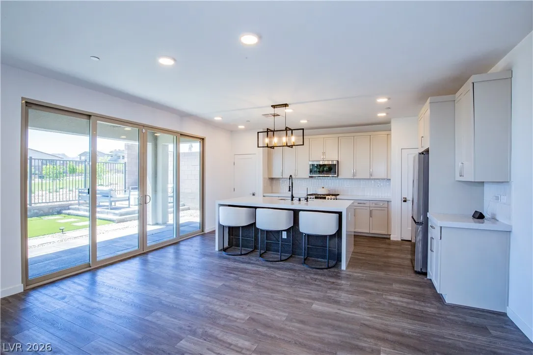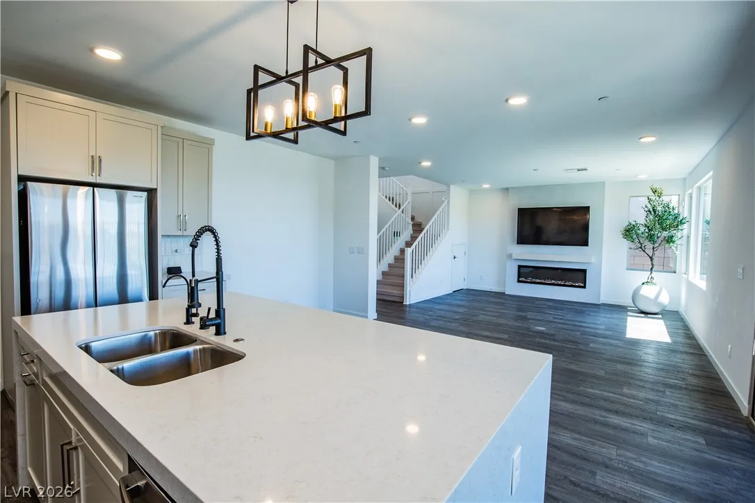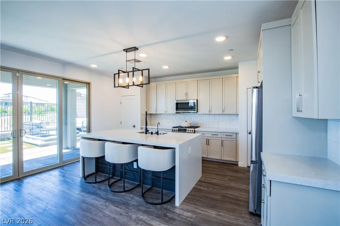 Perched on a desirable view lot, this home offers elevated living in the Arroyo’s Edge community in the sought-after Redpoint at Summerlin. The open-concept floor plan is filled with natural light and showcases sophisticated luxury with elevated finishes, including a sleek fireplace and picturesque windows. The kitchen is a culinary delight, featuring premium stainless-steel appliances, quartz countertops, and a stunning waterfall island, perfect for entertaining. Step outside through the extended glass sliding door to the backyard with a covered patio and elevated views capturing sweeping mountain and city vistas. The luxurious primary suite offers a serene retreat with breathtaking, glittering views above the city. Amenities include Arroyo Park, hiking and biking trails, picnic areas, and shaded seating. Park adds sports fields, pickleball courts, a playground, a splash pad, and fitness stations. Upcoming Urban Core, retail, dining, and more nearby, this home blends style, comfort.