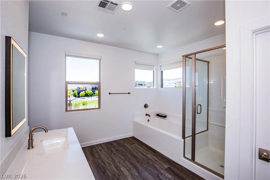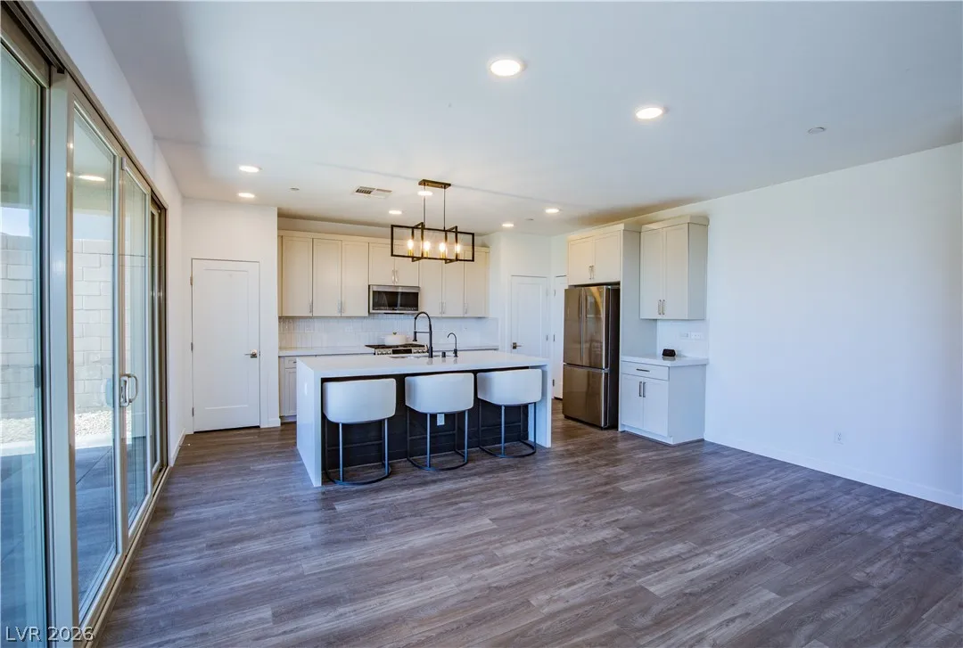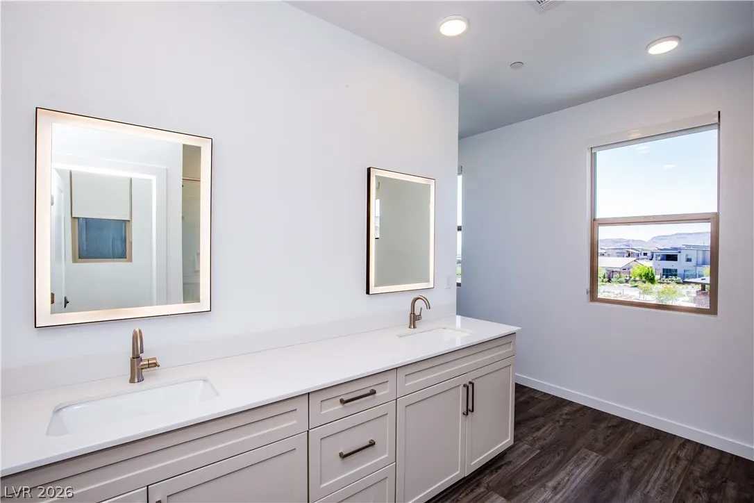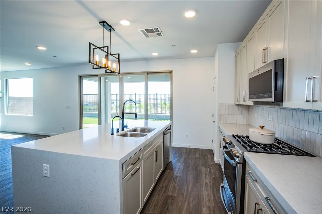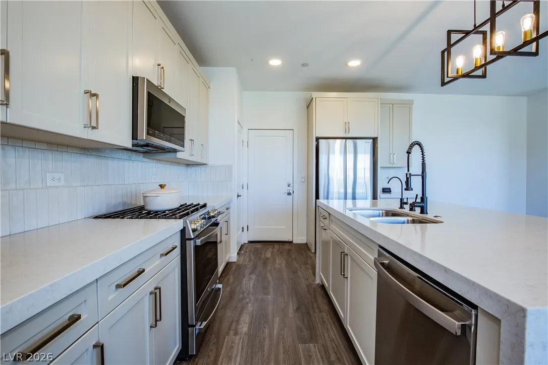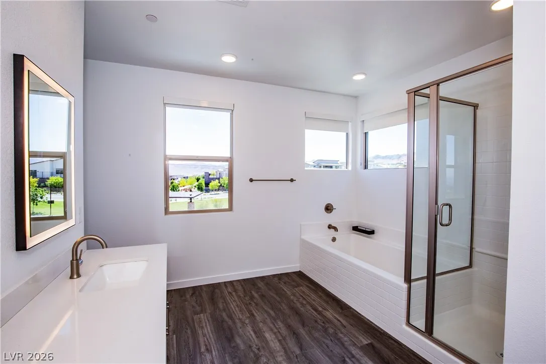 Perched on a desirable view lot, this home offers elevated living in the Arroyo’s Edge community in the sought-after Redpoint at Summerlin. The open-concept floor plan is filled with natural light and showcases sophisticated luxury with elevated finishes, including a sleek fireplace and picturesque windows. The kitchen is a culinary delight, featuring premium stainless-steel appliances, quartz countertops, and a stunning waterfall island, perfect for entertaining. Step outside through the extended glass sliding door to the backyard with a covered patio and elevated views capturing sweeping mountain and city vistas. The luxurious primary suite offers a serene retreat with breathtaking, glittering views above the city. Amenities include Arroyo Park, hiking and biking trails, picnic areas, and shaded seating. Park adds sports fields, pickleball courts, a playground, a splash pad, and fitness stations. Upcoming Urban Core, retail, dining, and more nearby, this home blends style, comfort.