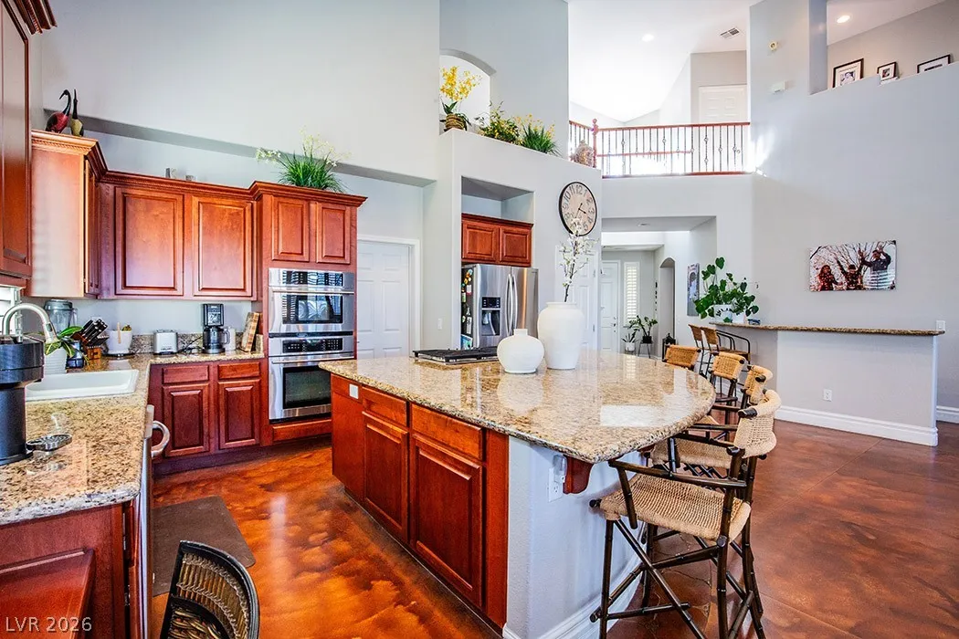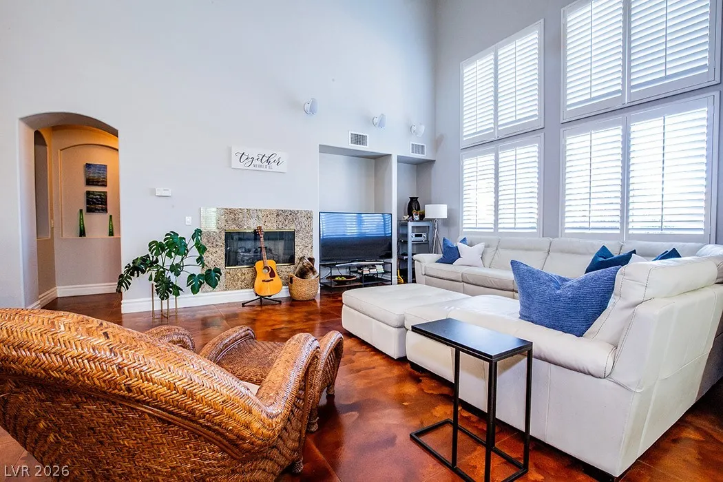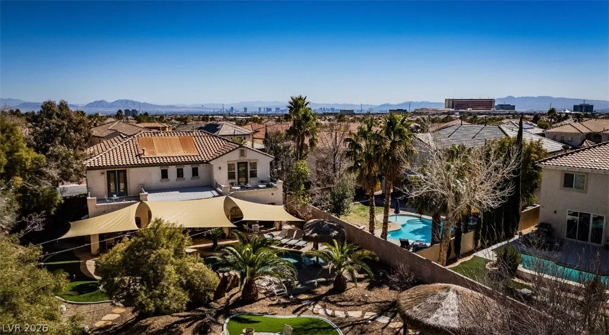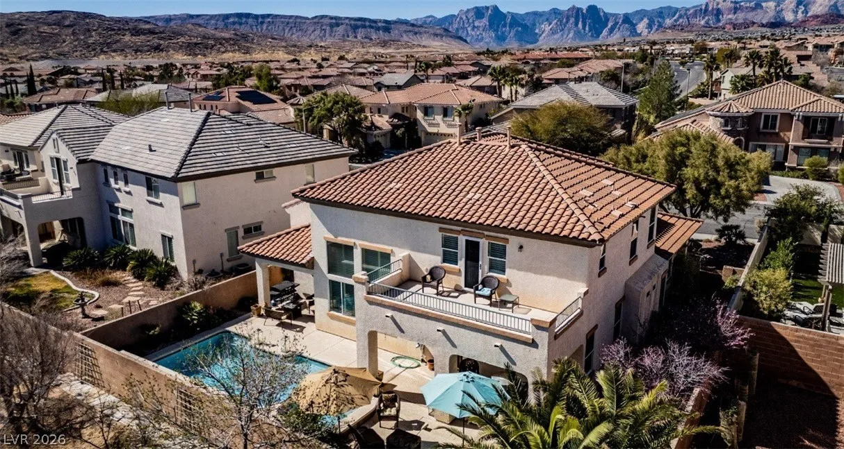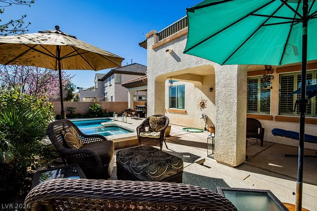 This stunning two-story home in the prestigious Vistas Community of Summerlin features an elegant design with concrete floors and a renovated master bedroom on the main level. It includes three bedrooms, a den, and three full bathrooms. From the secondary bedroom’s exterior balcony, enjoy breathtaking city views. The kitchen is a culinary delight, featuring stainless steel appliances, maple cabinets, a new five-burner cooktop, and a large walk-in pantry, along with a separate bar area complete with a wine chiller. The family room and kitchen boast dramatic high ceilings, perfect for entertaining. The expansive backyard offers two covered patios, French doors, a sparkling pool with a waterfall, and a spa. The home also provides a spacious three-car garage, ensuring ample room for comfortable living. Located just minutes from Vista Commons and Downtown Summerlin, with easy access to the 215 Beltway, this home combines luxury and convenience. One small pet with approval and pet deposit.