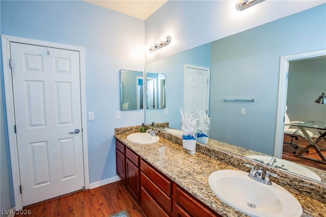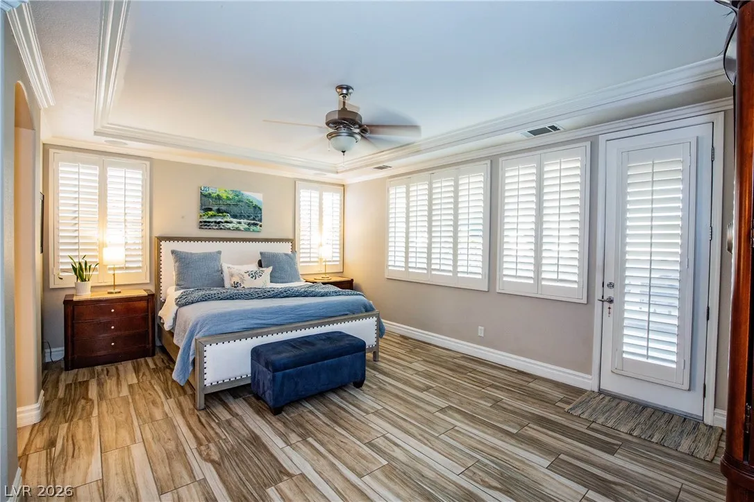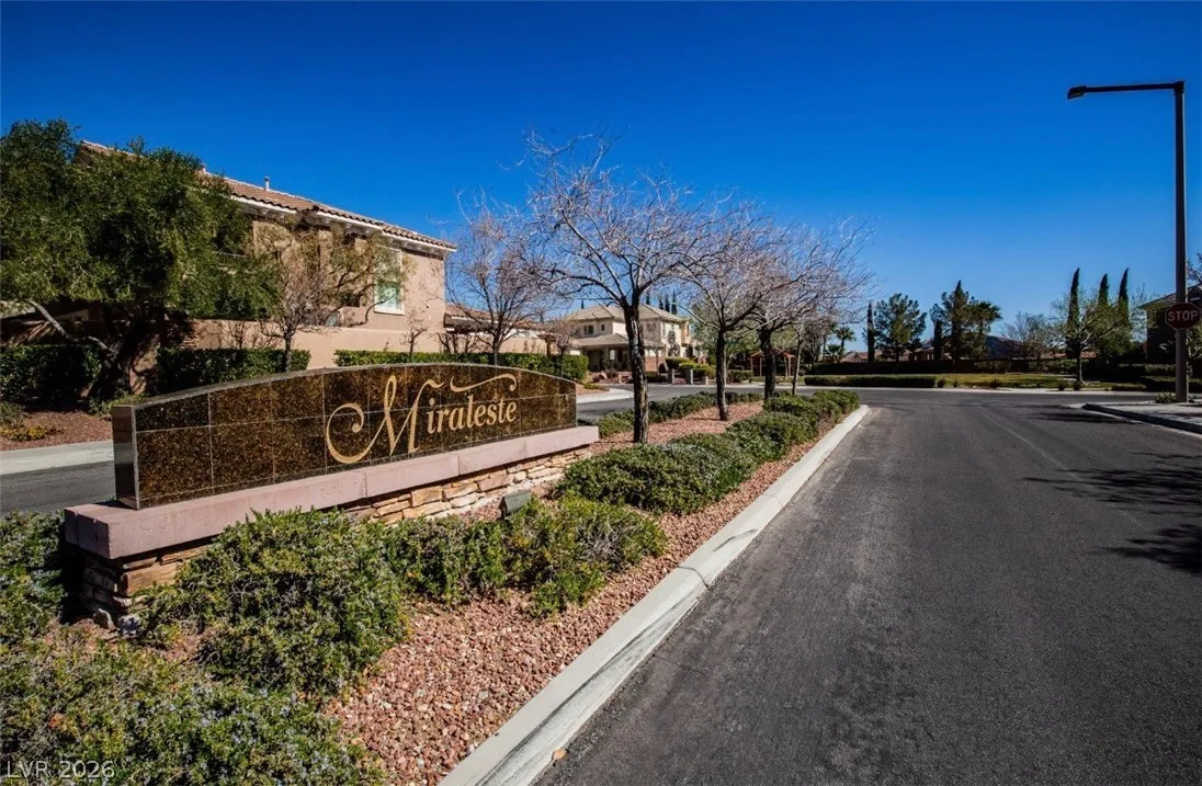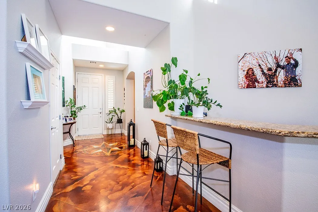 This stunning two-story home in the prestigious Vistas Community of Summerlin features an elegant design with concrete floors and a renovated master bedroom on the main level. It includes three bedrooms, a den, and three full bathrooms. From the secondary bedroom’s exterior balcony, enjoy breathtaking city views. The kitchen is a culinary delight, featuring stainless steel appliances, maple cabinets, a new five-burner cooktop, and a large walk-in pantry, along with a separate bar area complete with a wine chiller. The family room and kitchen boast dramatic high ceilings, perfect for entertaining. The expansive backyard offers two covered patios, French doors, a sparkling pool with a waterfall, and a spa. The home also provides a spacious three-car garage, ensuring ample room for comfortable living. Located just minutes from Vista Commons and Downtown Summerlin, with easy access to the 215 Beltway, this home combines luxury and convenience. One small pet with approval and pet deposit.