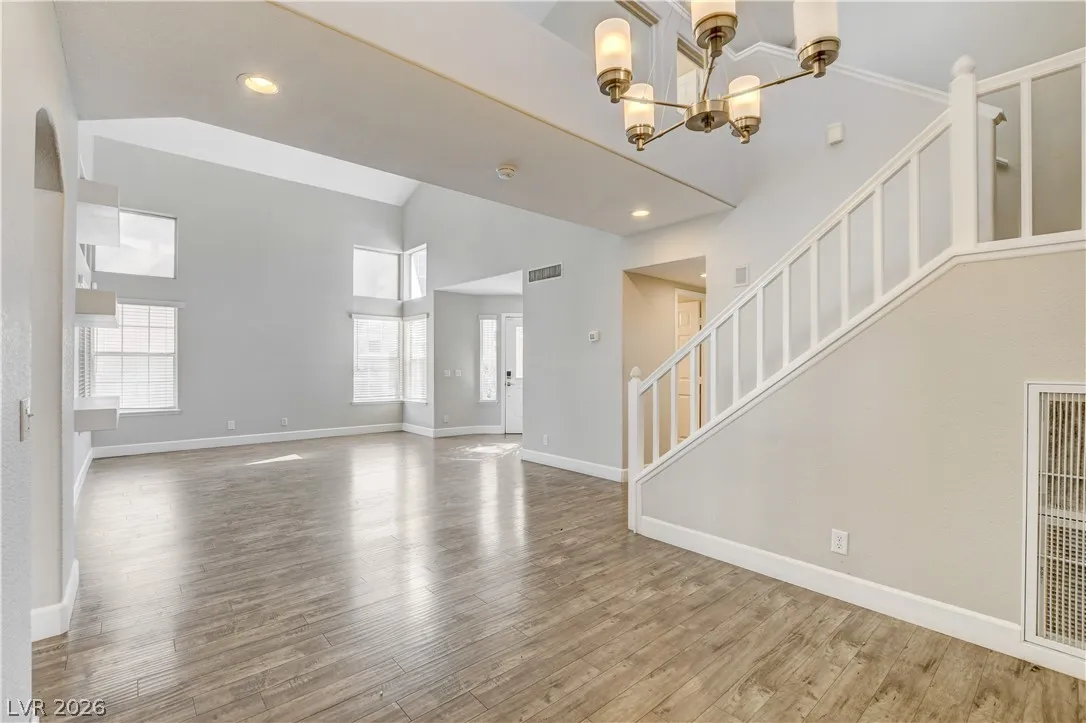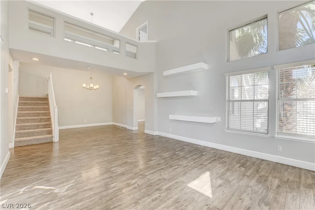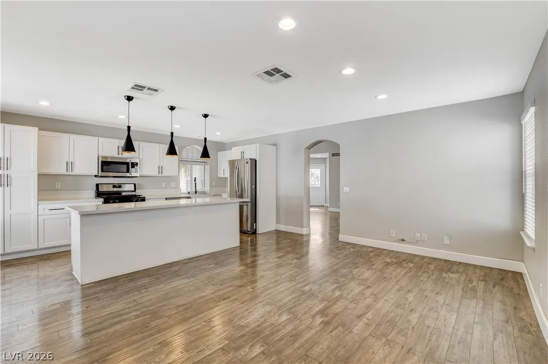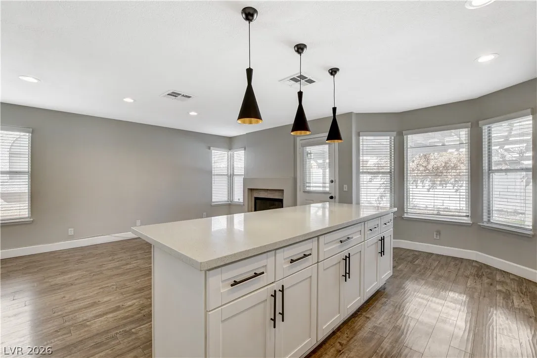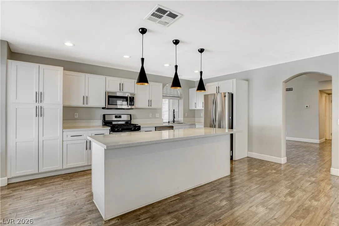 Located near Desert Shores, this updated two-story home features a bright formal living and dining area with vaulted ceilings and a separate family room with fireplace that opens to a modern kitchen with quartz countertops, a large seating island, and stainless steel appliances (all included).