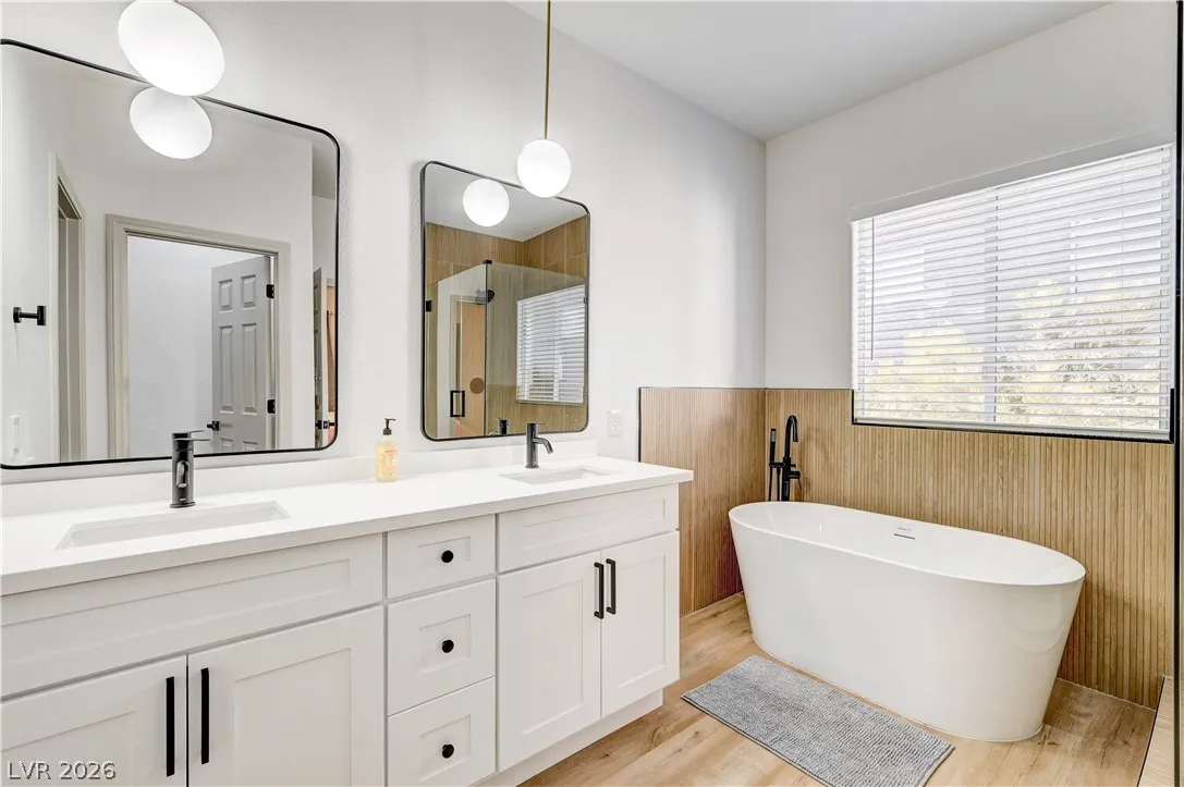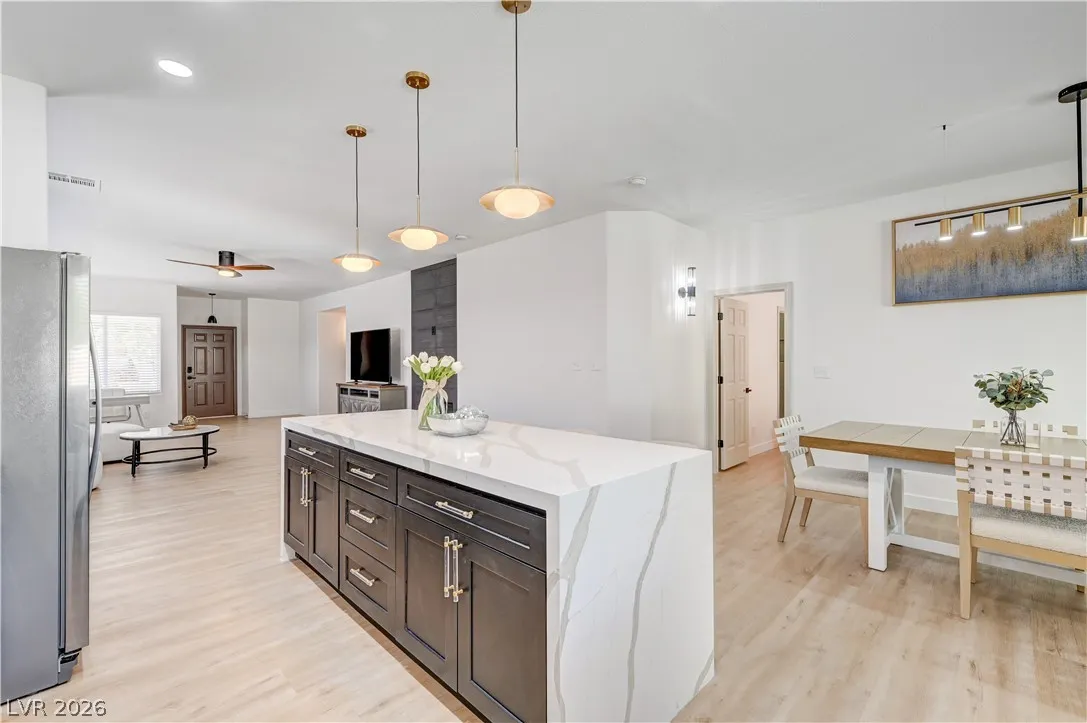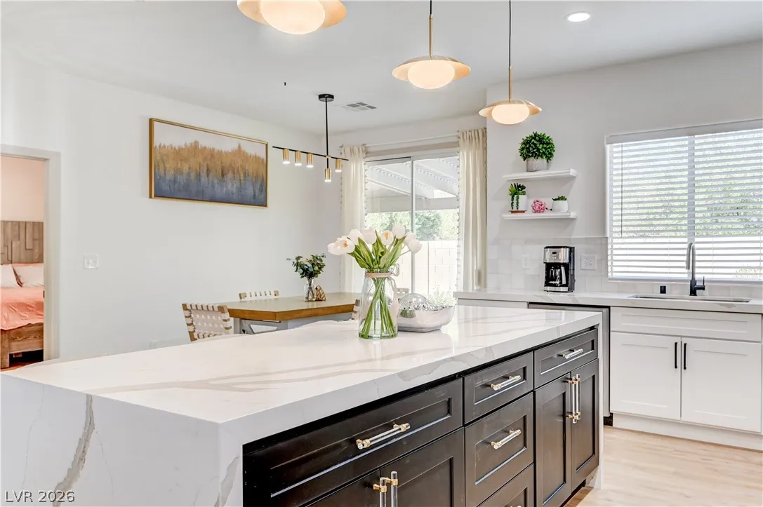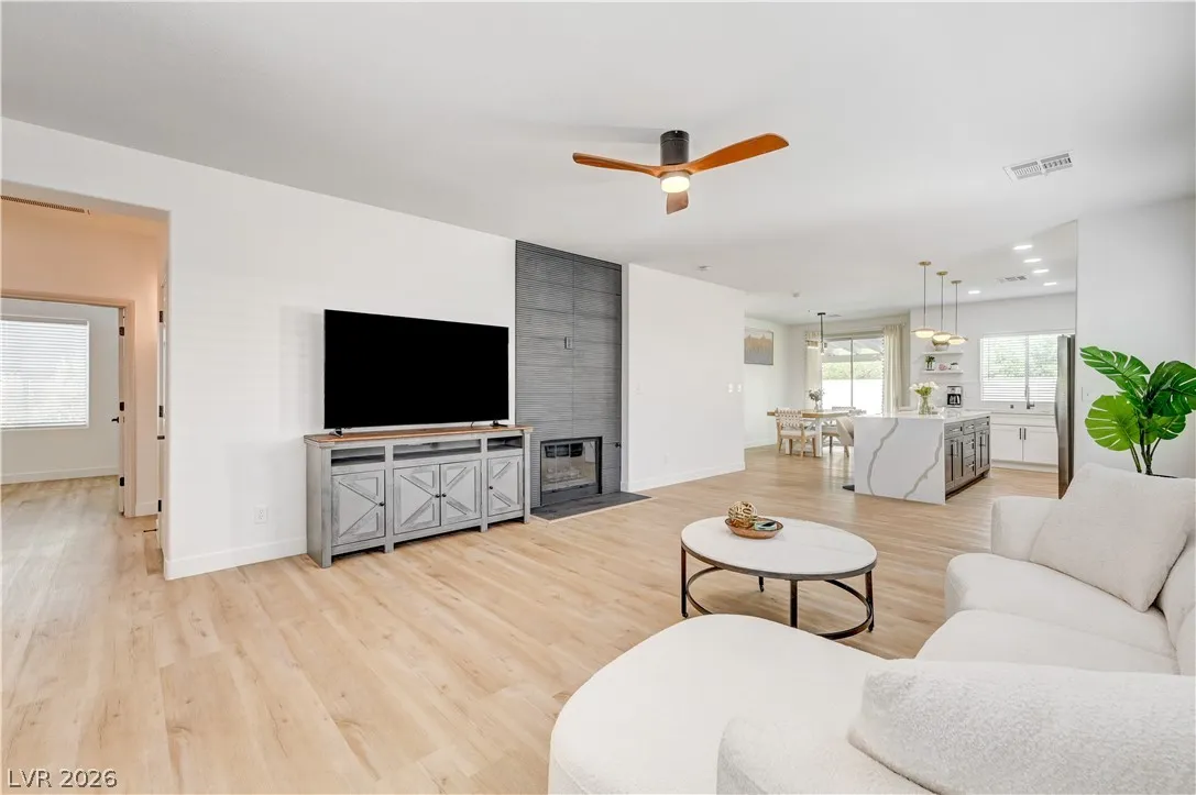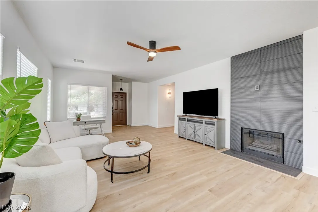 Experience luxury and comfort in this beautifully designed and fully furnished 3-bedroom, 2.5-bathroom home nestled in a serene & highly sought-after neighborhood in Summerlin. The open-concept living area boasts stylish furnishings and a modern aesthetic, perfect for both relaxation and entertainment. The kitchen features sleek cabinetry and a spacious island that seamlessly flows into the cozy living room, complete with a fireplace and elegant décor. The master suite offers a tranquil retreat with a plush king-sized bed, an expansive walk-in closet, & en-suite bathroom featuring dual vanities. A charming yard awaits outside, perfect for alfresco gatherings or serene moments. Enjoy the convenience of being minutes from Downtown Summerlin and just 15 minutes from the airport.