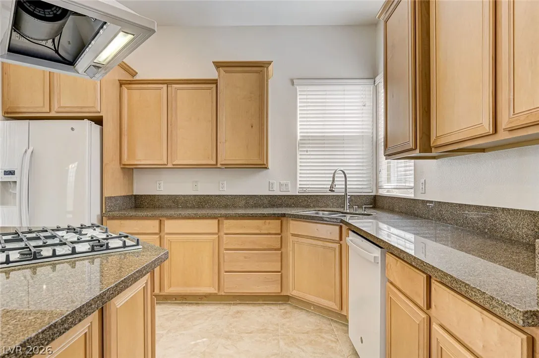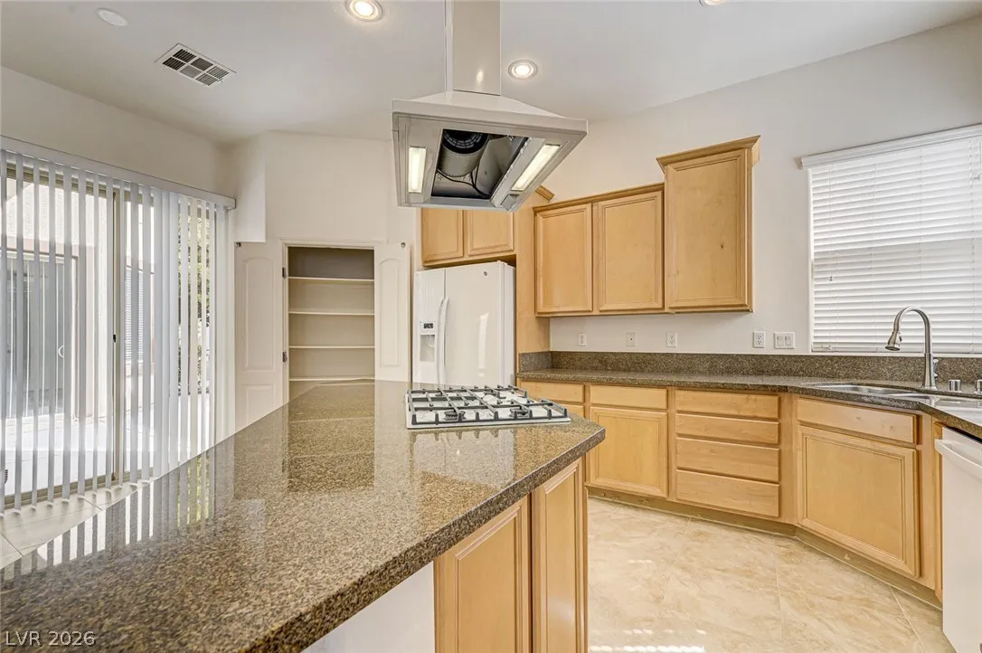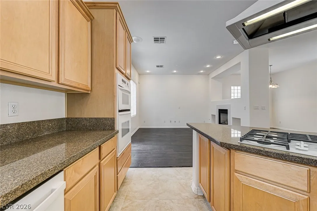 AND DINING ROOM. GOURMET KITCHEN WITH GRANITE COUNTERTOPS, ISLAND, DROP-IN COOKTOP, BUILT-IN
