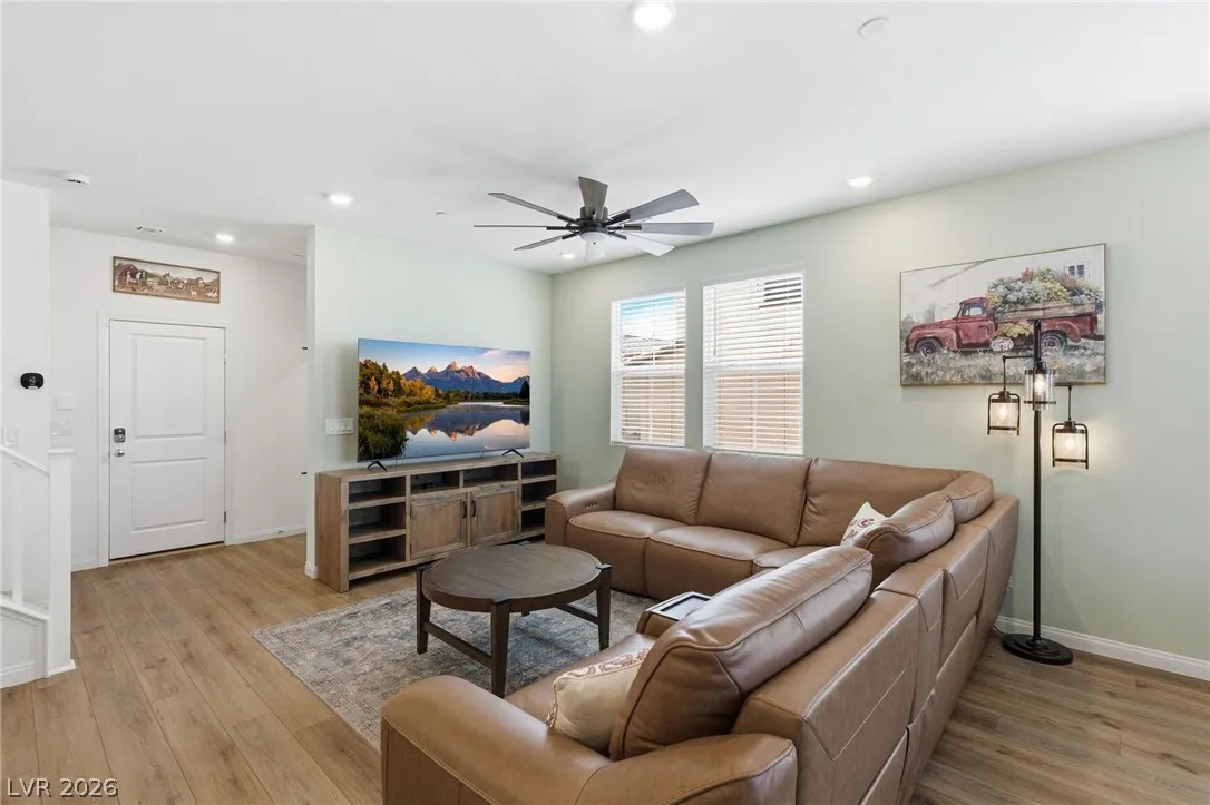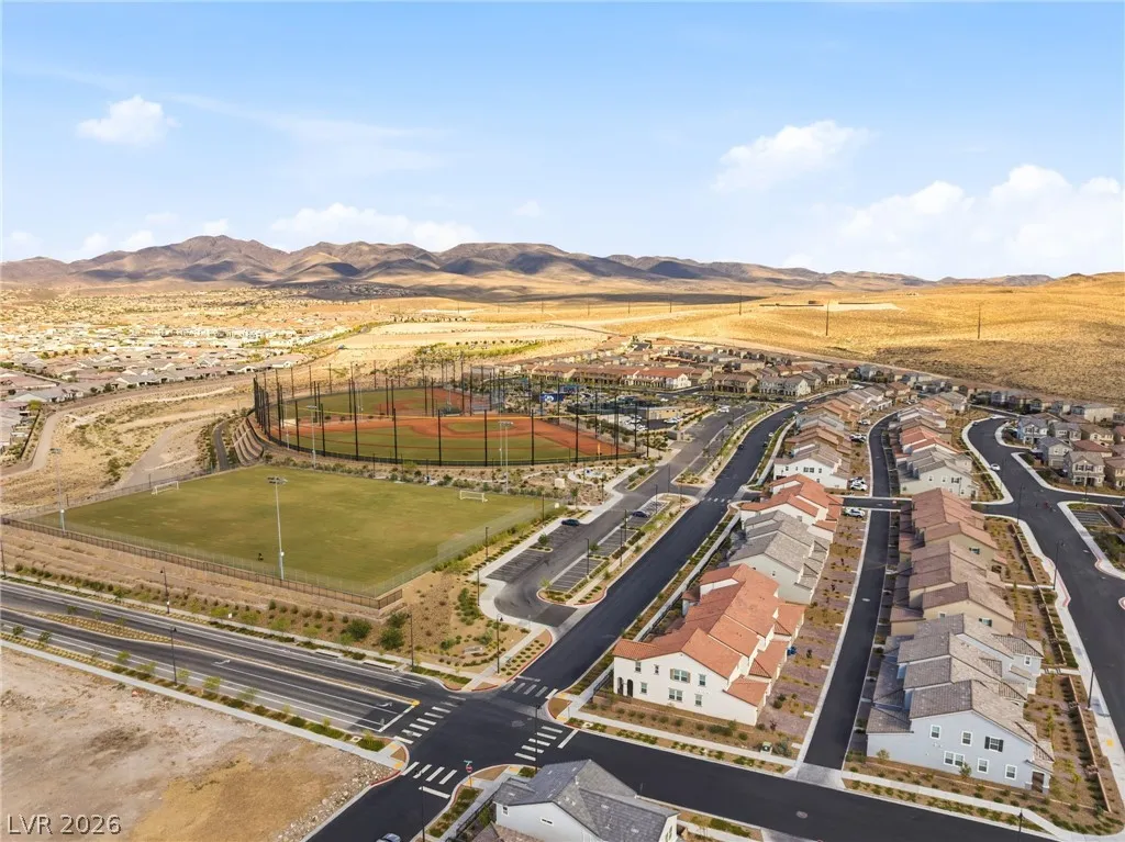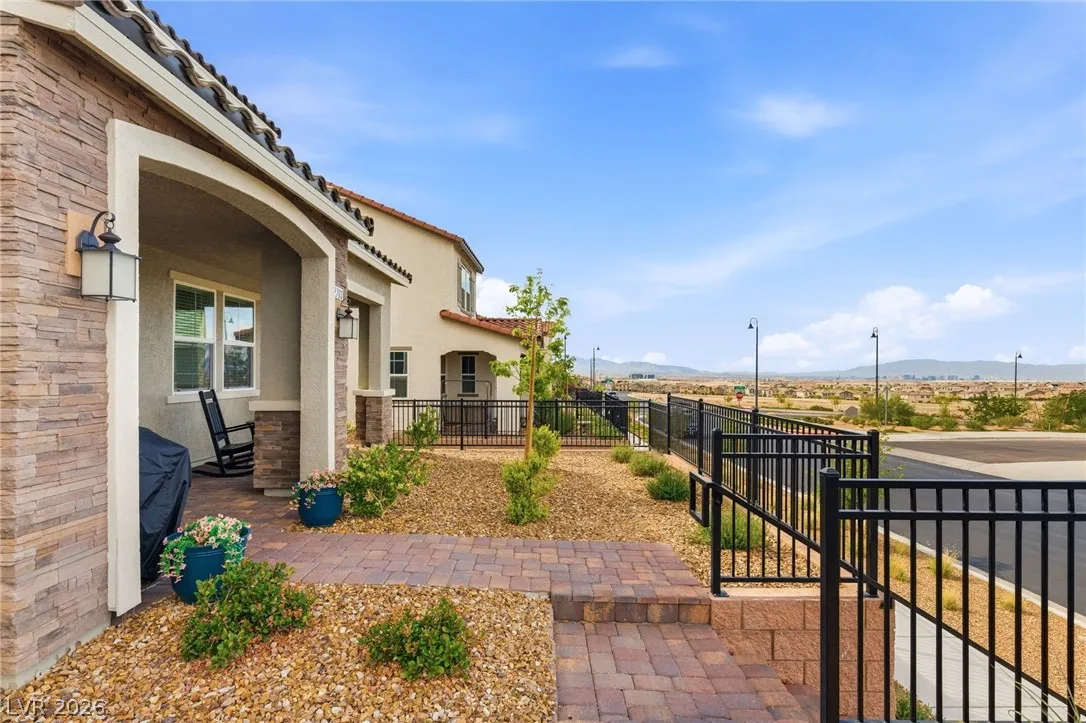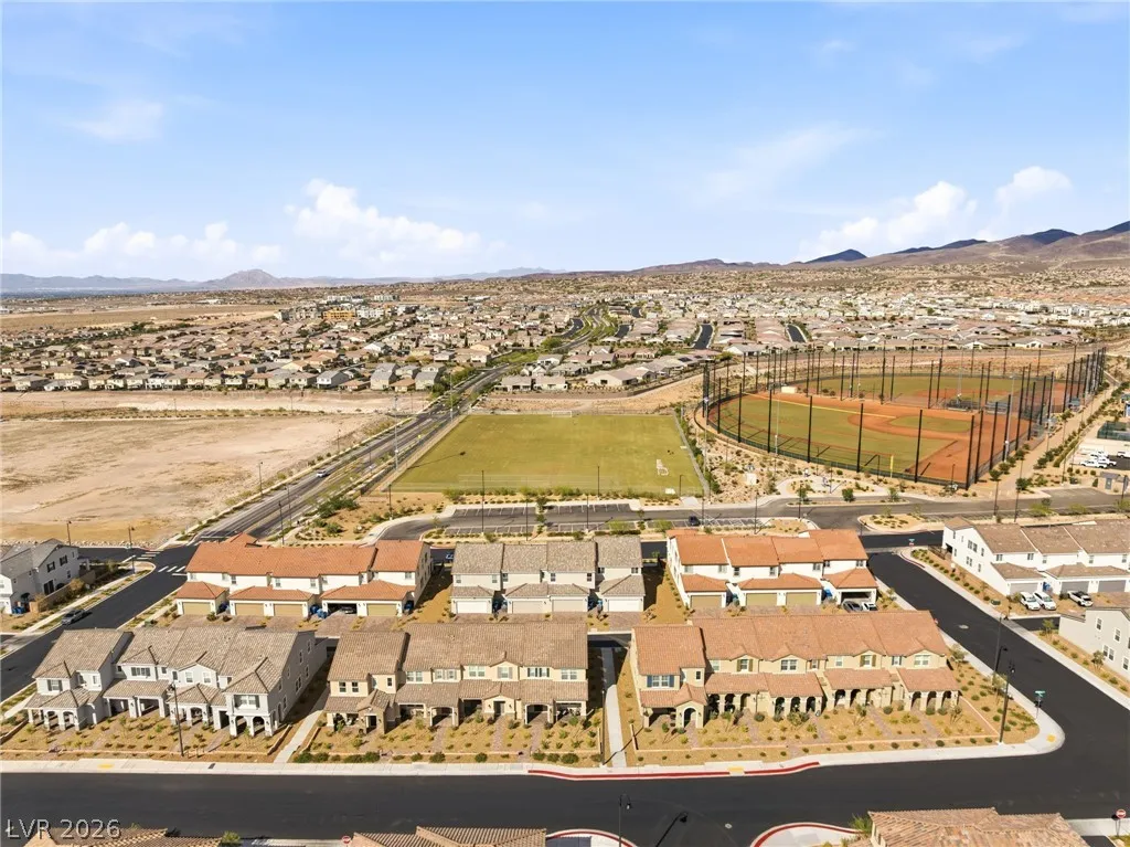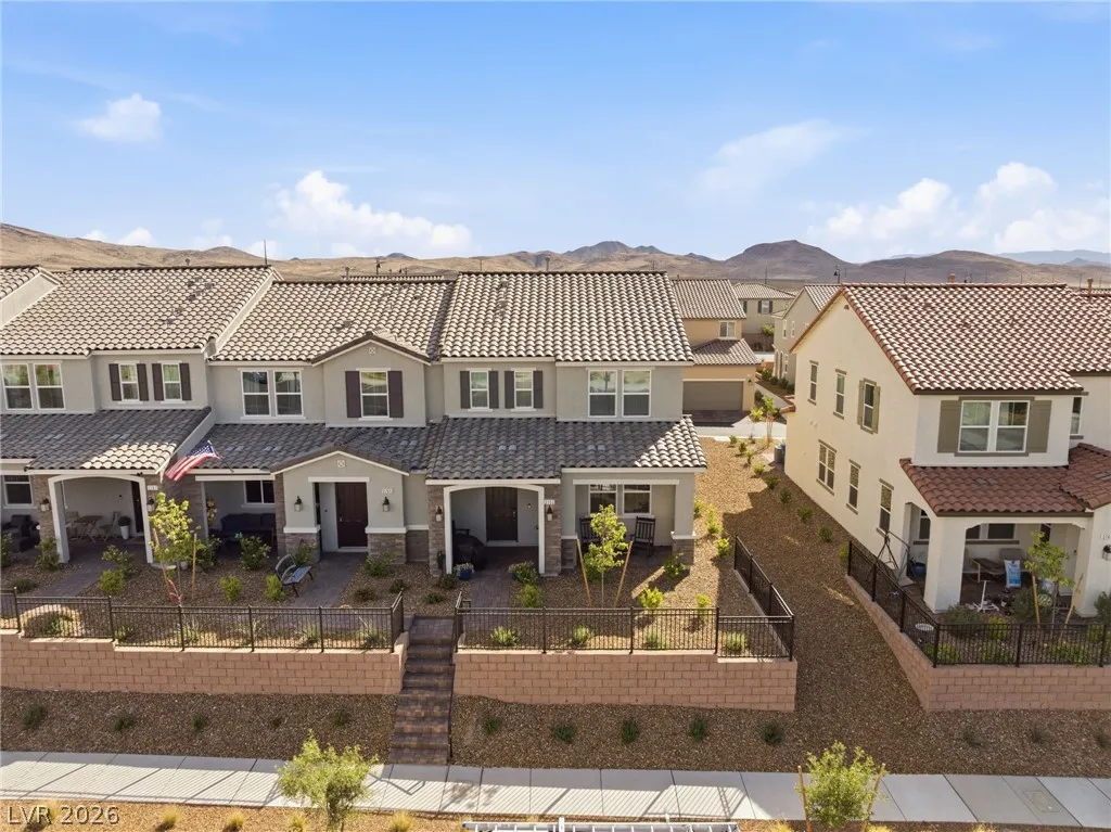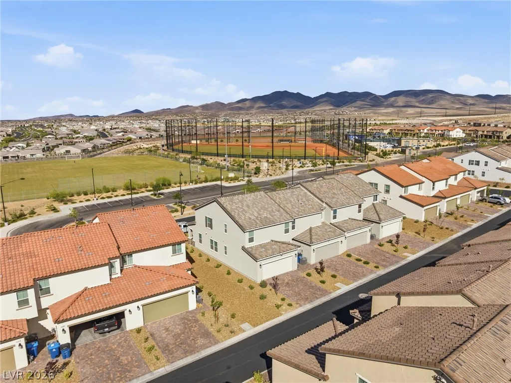 Rare opportunity to own a like-new townhome directly across the street from one of Inspirada’s largest parks! Just steps from your front door, you’ll enjoy easy access to baseball fields, soccer fields, and a wide range of the community’s top-tier amenities. This desirable end unit features an enhanced exterior facade, charming front patio and a rare extended driveway. Inside, the open-concept floor plan is filled with natural light and enhanced by upgraded 9-foot ceilings on the main level and bright white shaker cabinetry and stair railing. Luxury vinyl plank flooring runs throughout the downstairs, complemented by upgraded blinds for a modern, finished look. The home comes fully equipped with a washer, dryer, and refrigerator—making it truly move-in ready. With incredible sightlines both inside and out, this property offers a bright, inviting atmosphere you won’t want to miss.