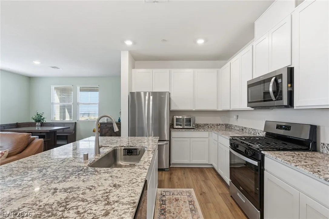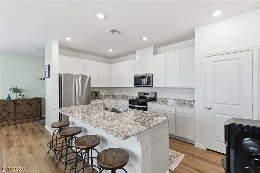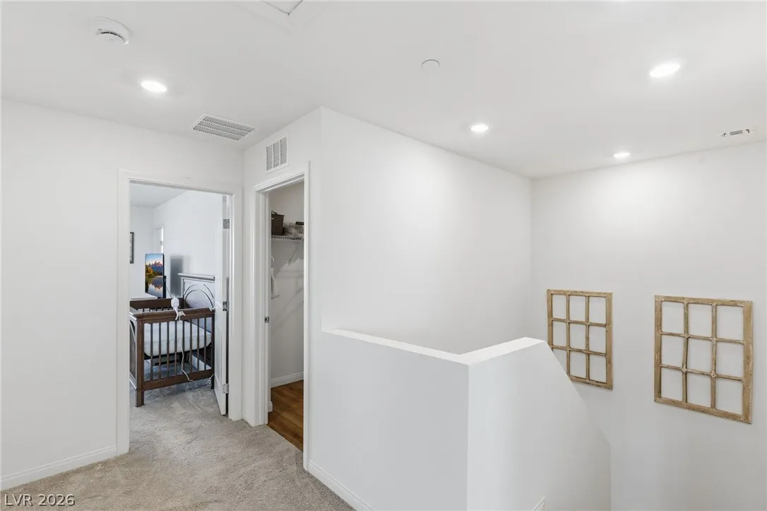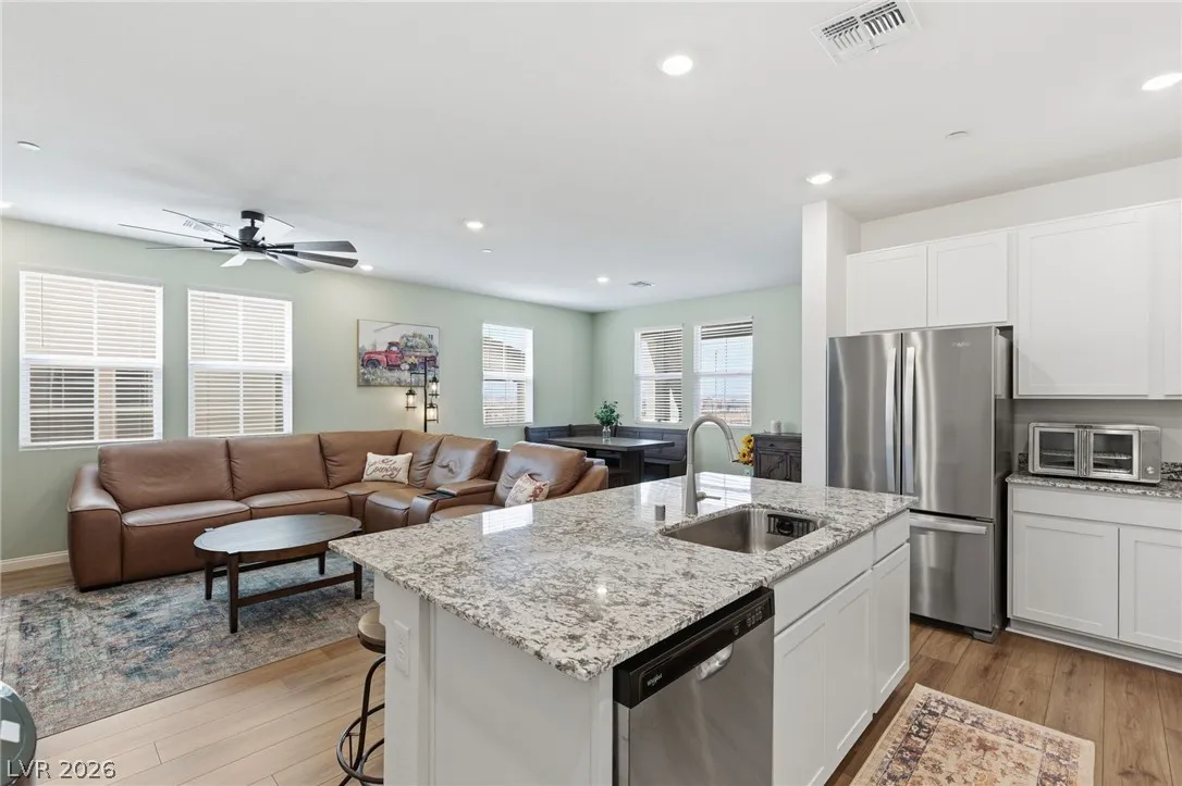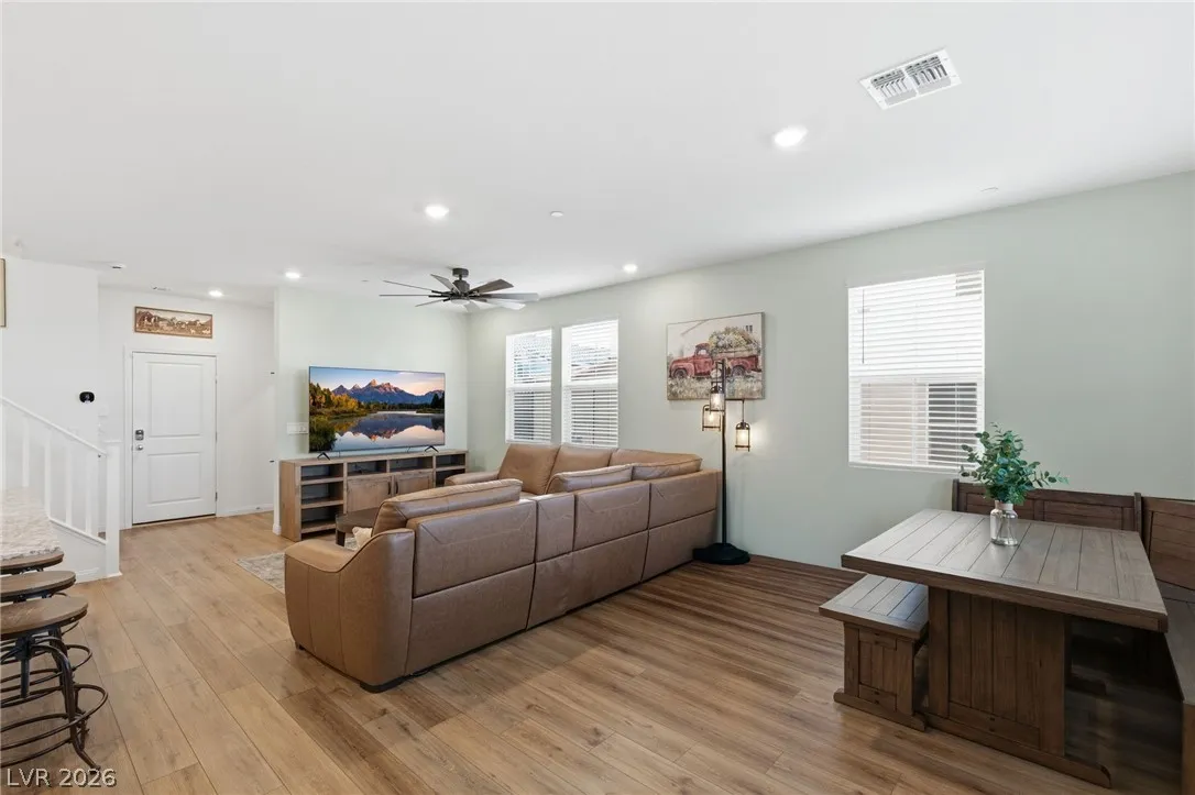 Rare opportunity to own a like-new townhome directly across the street from one of Inspirada’s largest parks! Just steps from your front door, you’ll enjoy easy access to baseball fields, soccer fields, and a wide range of the community’s top-tier amenities. This desirable end unit features an enhanced exterior facade, charming front patio and a rare extended driveway. Inside, the open-concept floor plan is filled with natural light and enhanced by upgraded 9-foot ceilings on the main level and bright white shaker cabinetry and stair railing. Luxury vinyl plank flooring runs throughout the downstairs, complemented by upgraded blinds for a modern, finished look. The home comes fully equipped with a washer, dryer, and refrigerator—making it truly move-in ready. With incredible sightlines both inside and out, this property offers a bright, inviting atmosphere you won’t want to miss.