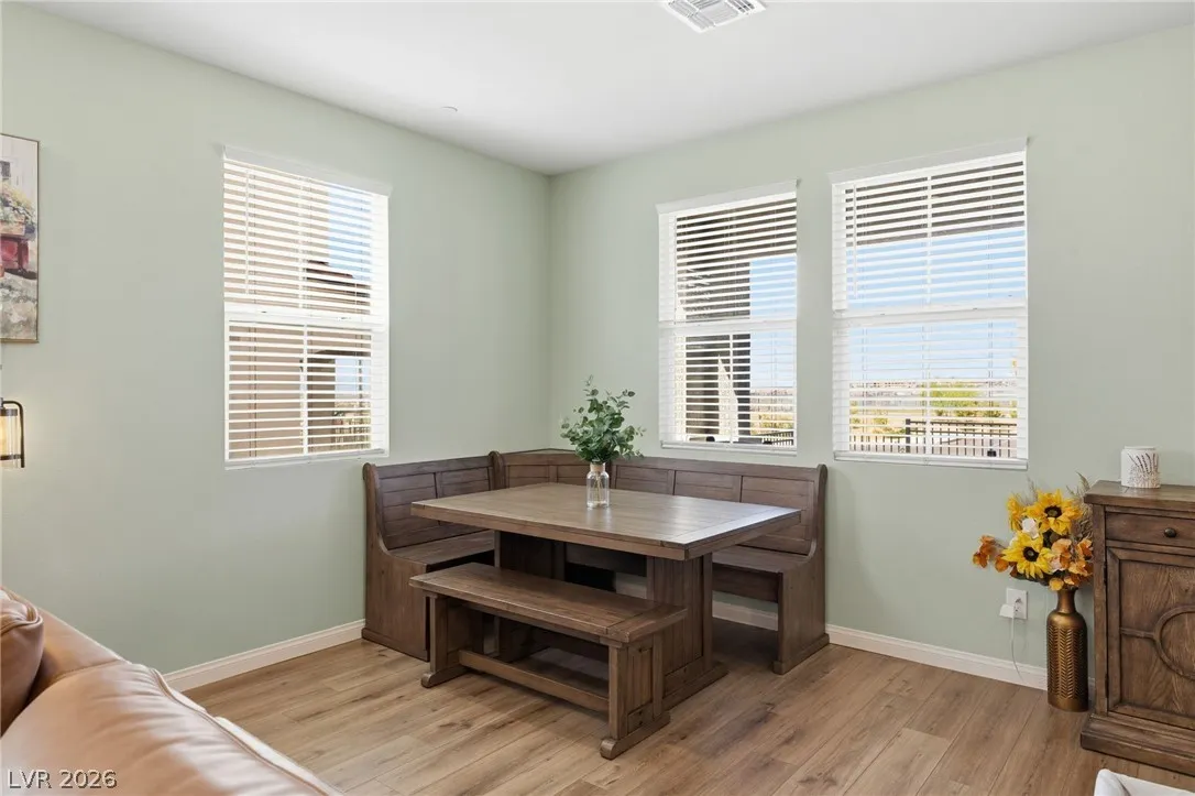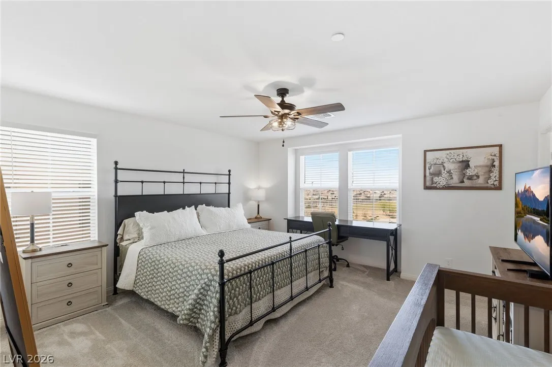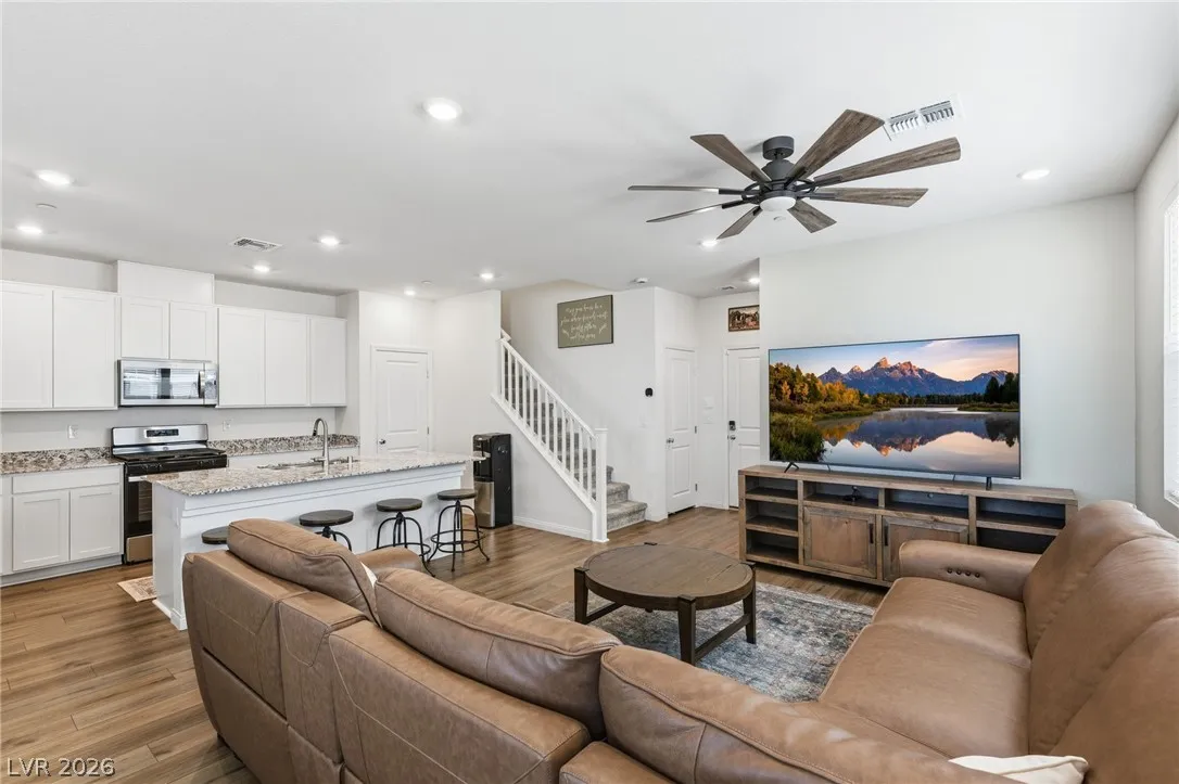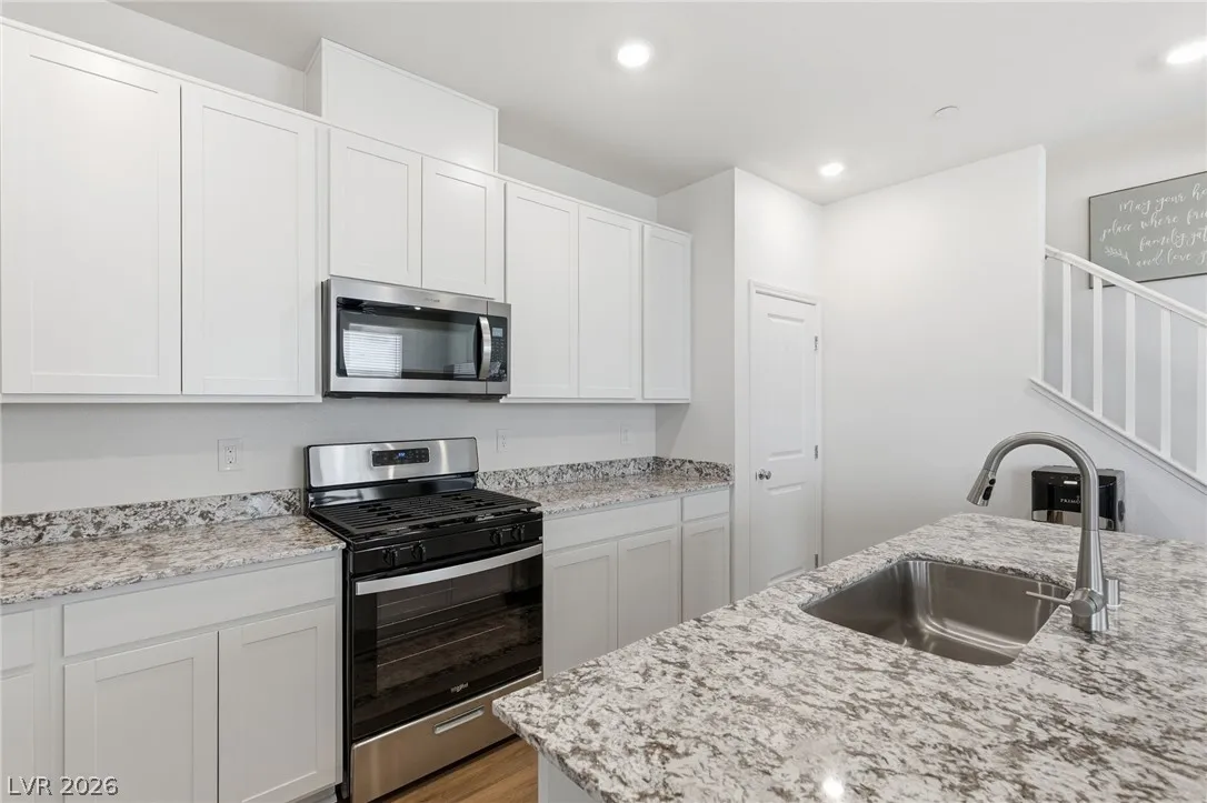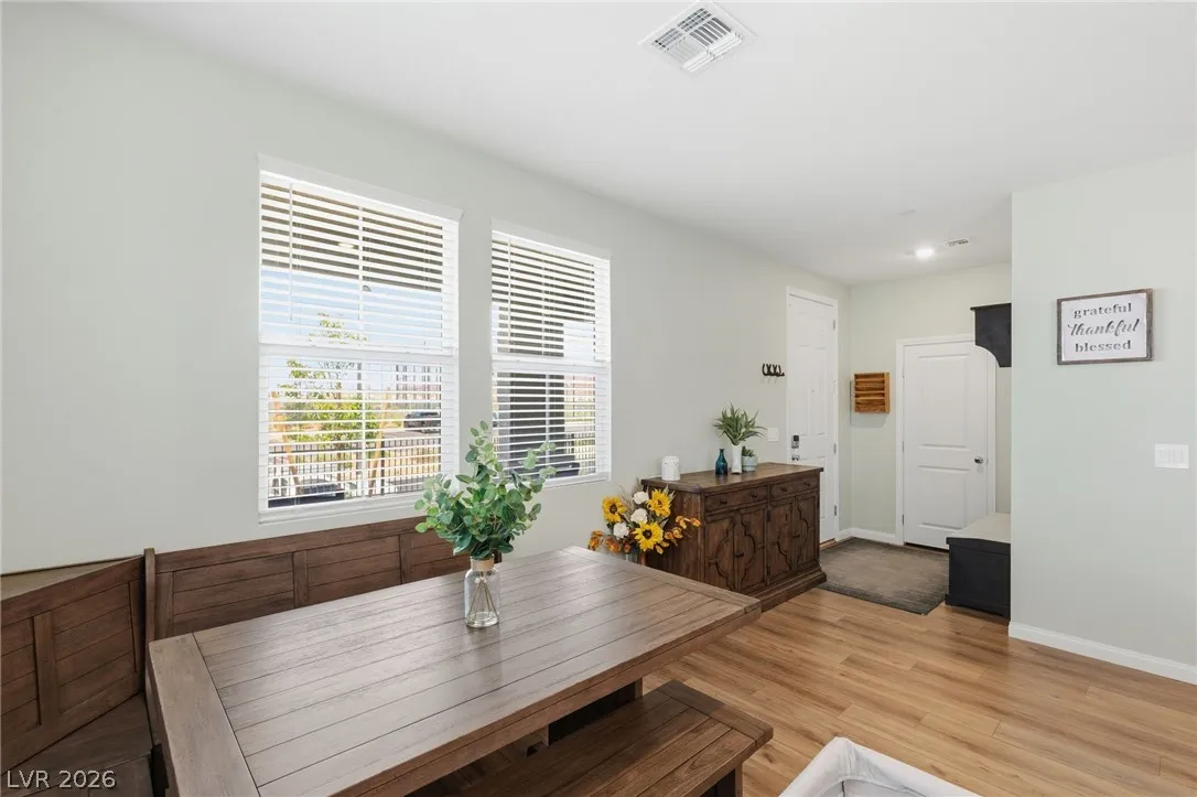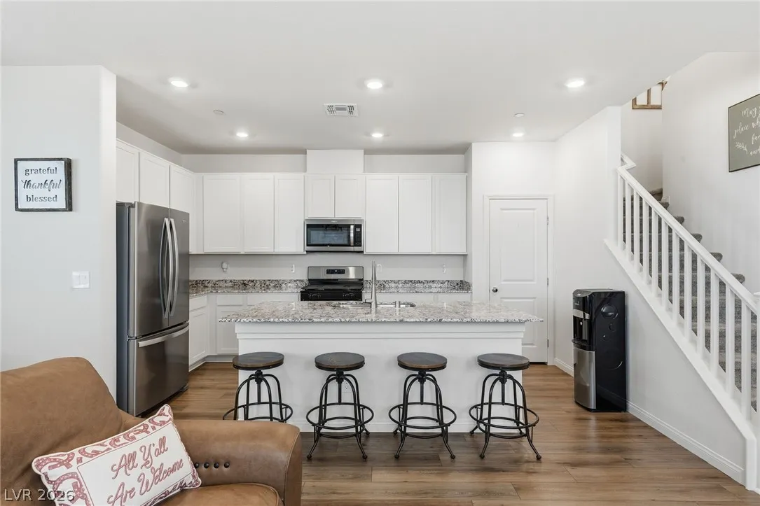 Rare opportunity to own a like-new townhome directly across the street from one of Inspirada’s largest parks! Just steps from your front door, you’ll enjoy easy access to baseball fields, soccer fields, and a wide range of the community’s top-tier amenities. This desirable end unit features an enhanced exterior facade, charming front patio and a rare extended driveway. Inside, the open-concept floor plan is filled with natural light and enhanced by upgraded 9-foot ceilings on the main level and bright white shaker cabinetry and stair railing. Luxury vinyl plank flooring runs throughout the downstairs, complemented by upgraded blinds for a modern, finished look. The home comes fully equipped with a washer, dryer, and refrigerator—making it truly move-in ready. With incredible sightlines both inside and out, this property offers a bright, inviting atmosphere you won’t want to miss.