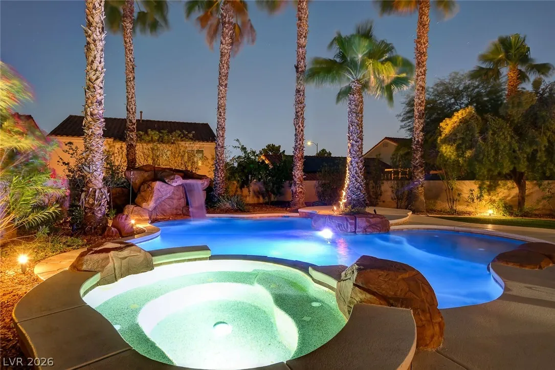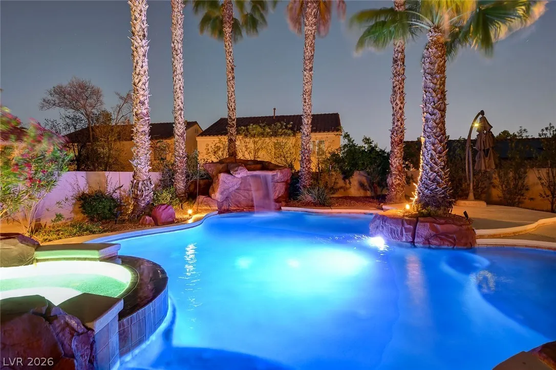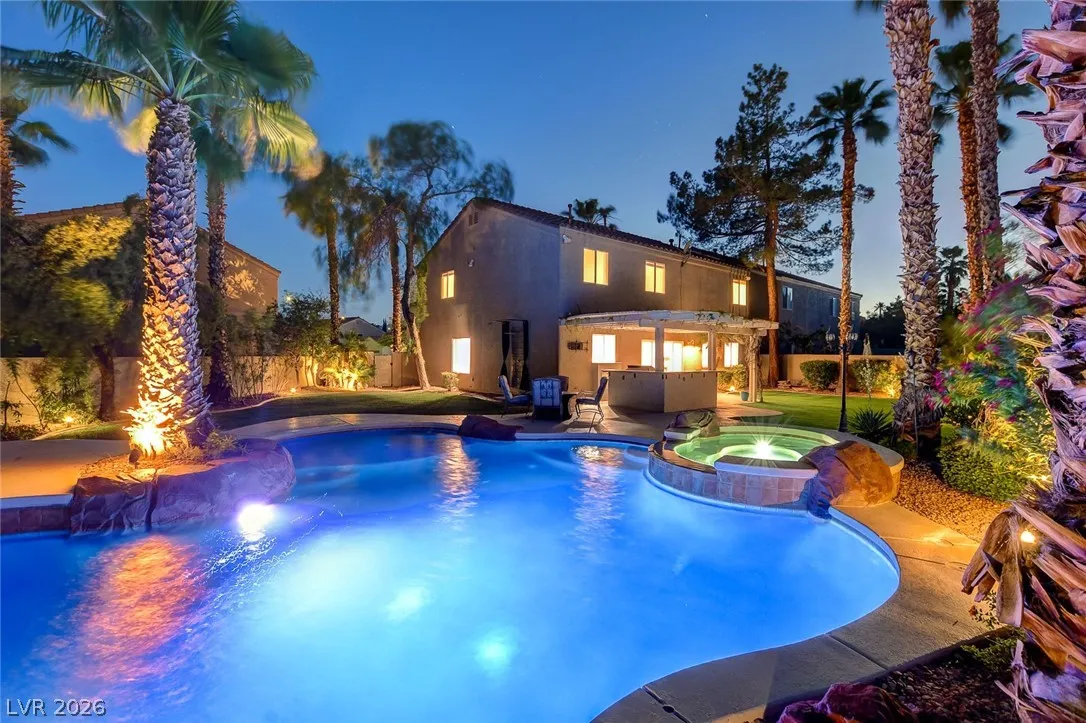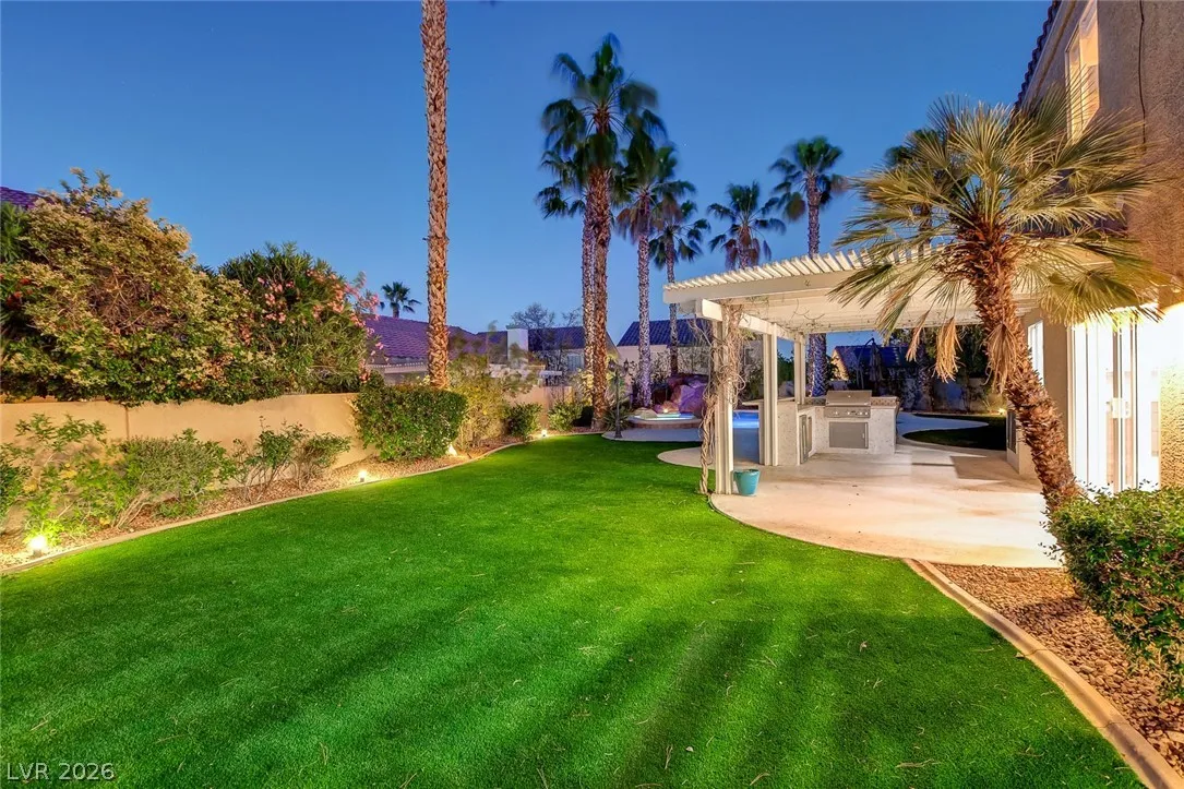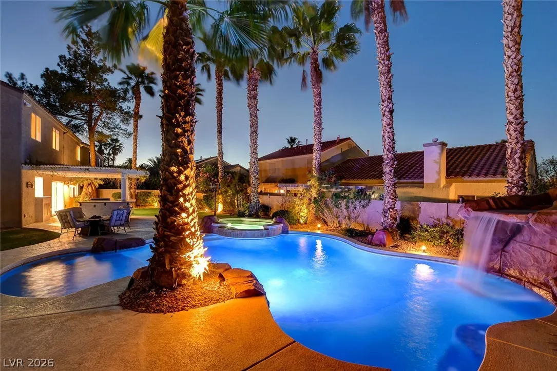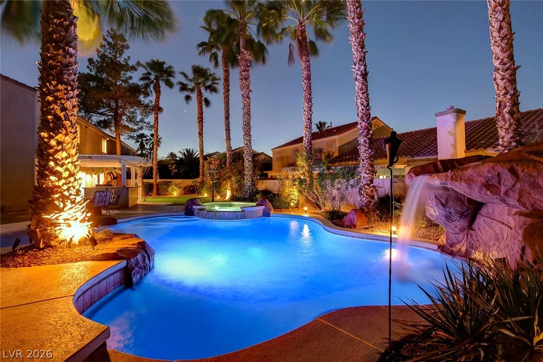 Stunning upgraded home in Peccole Ranch, situated on one of the largest lots in the neighborhood. This beautifully updated 4 bed, 3 bath home features open-concept living with designer finishes throughout. Step inside to a bright and expansive great room with wide plank flooring, recessed lighting, and a custom wood accent wall. The fully remodeled kitchen is a showstopper, complete with a large waterfall island, sleek cabinetry, stainless steel appliances, subway tile backsplash and stylish open shelving. Step outside to your private backyard oasis featuring a resort style pool with rock waterfall, hot tub, covered patio with pergola, built-in outdoor kitchen, fire pit seating area and lush landscaping with mature palm trees. Enjoy access to scenic walking trails, greenbelts, tennis courts and a prime location just minutes from Downtown Summerlin, shopping, dining, and entertainment. Homes with lots of this size and level of upgrades rarely come available—this is a must-see.