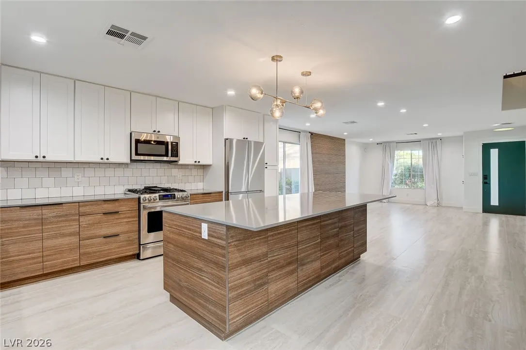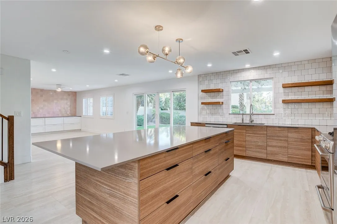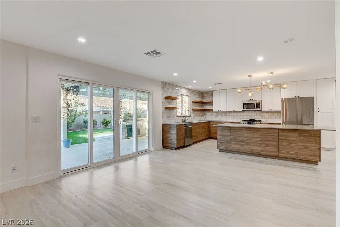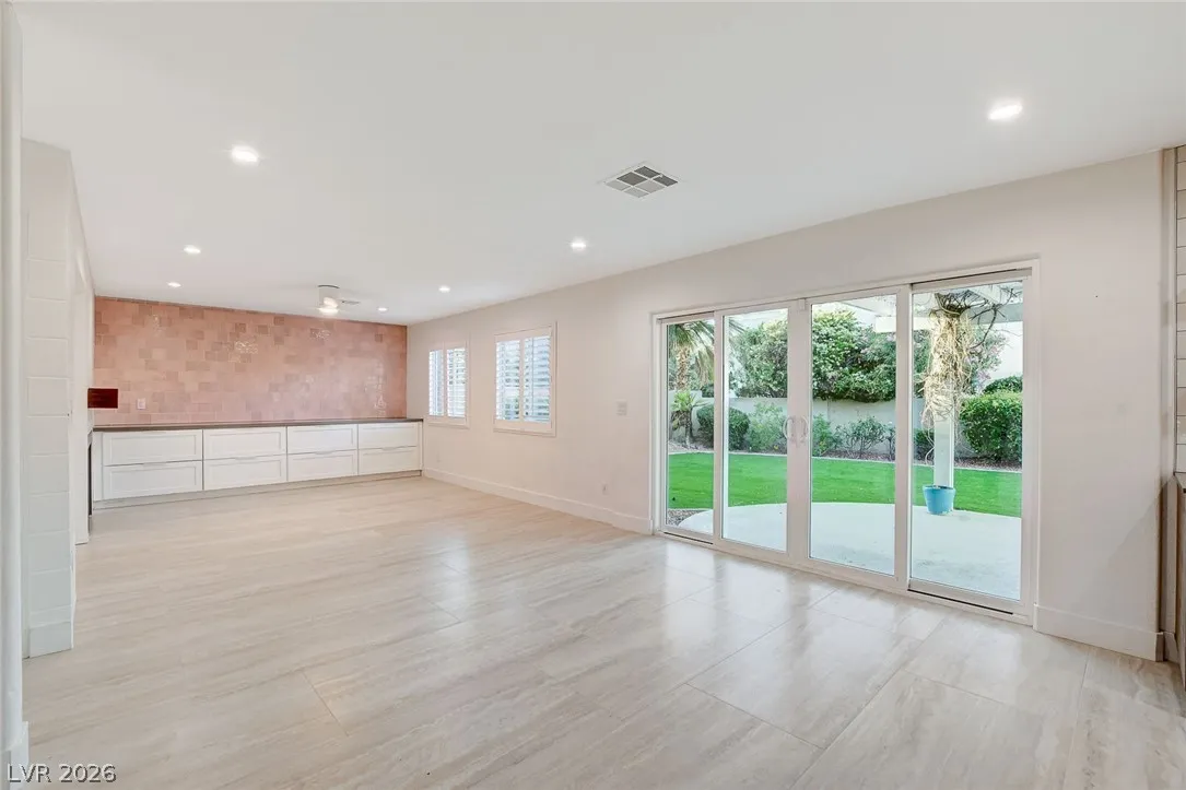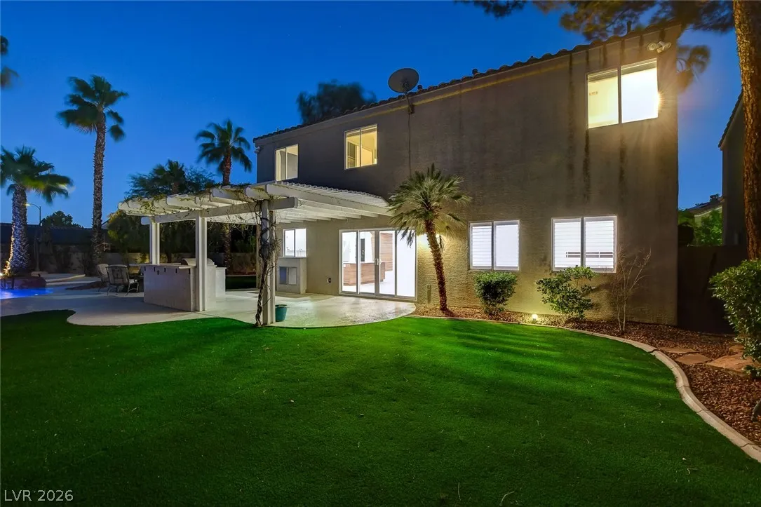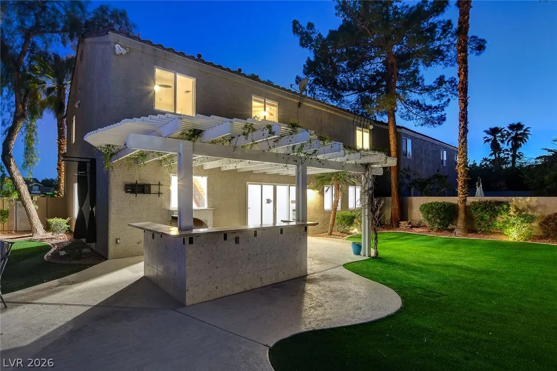 Stunning upgraded home in Peccole Ranch, situated on one of the largest lots in the neighborhood. This beautifully updated 4 bed, 3 bath home features open-concept living with designer finishes throughout. Step inside to a bright and expansive great room with wide plank flooring, recessed lighting, and a custom wood accent wall. The fully remodeled kitchen is a showstopper, complete with a large waterfall island, sleek cabinetry, stainless steel appliances, subway tile backsplash and stylish open shelving. Step outside to your private backyard oasis featuring a resort style pool with rock waterfall, hot tub, covered patio with pergola, built-in outdoor kitchen, fire pit seating area and lush landscaping with mature palm trees. Enjoy access to scenic walking trails, greenbelts, tennis courts and a prime location just minutes from Downtown Summerlin, shopping, dining, and entertainment. Homes with lots of this size and level of upgrades rarely come available—this is a must-see.