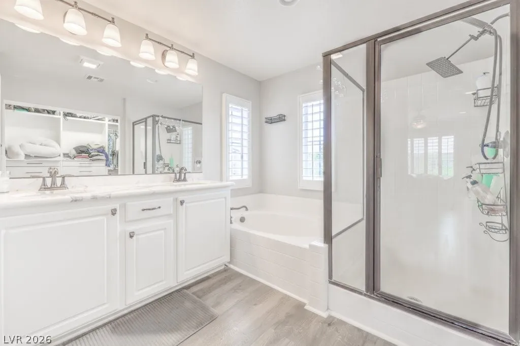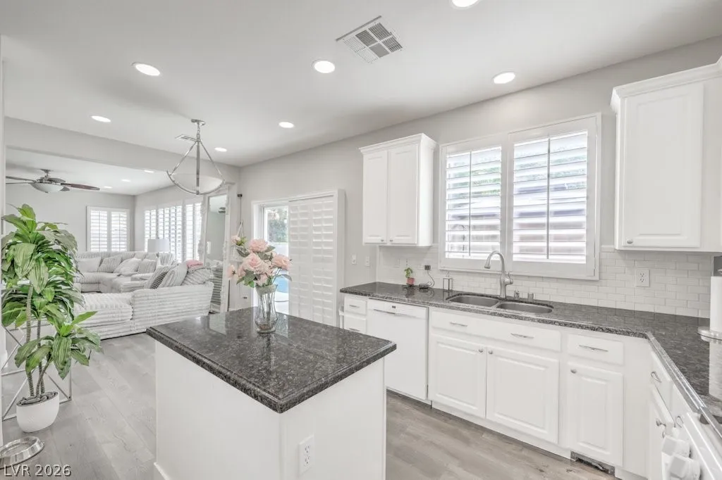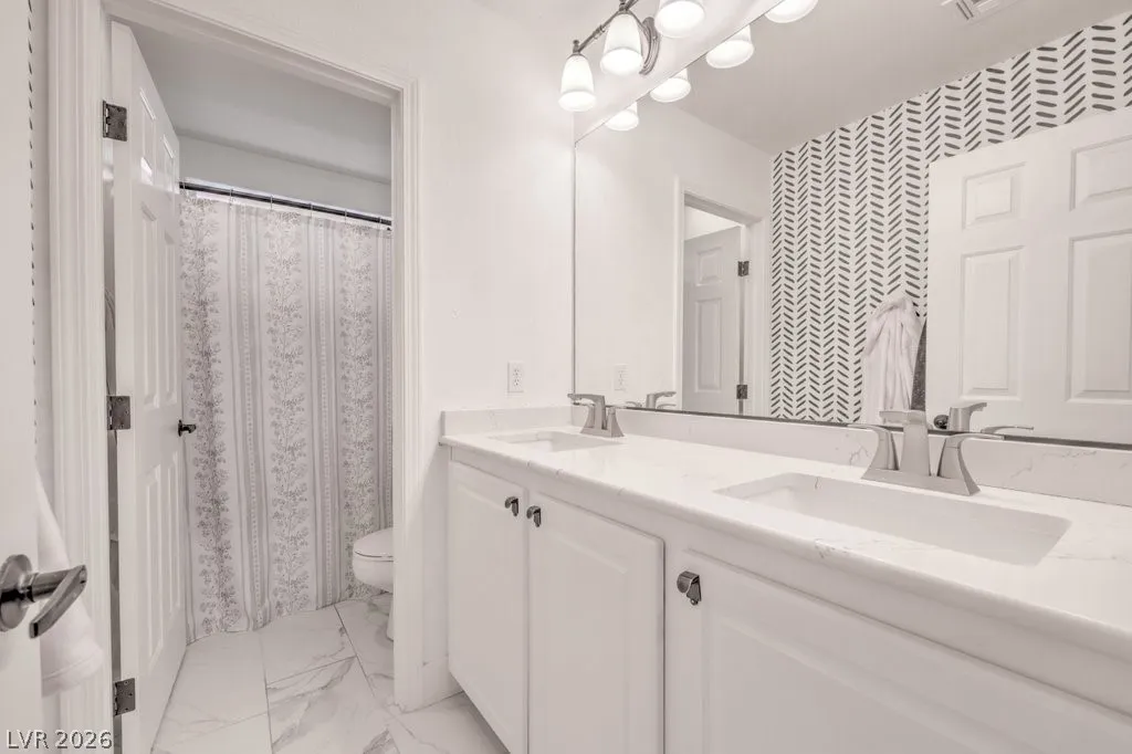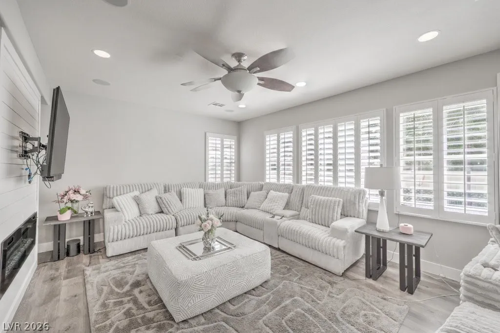 Inside, enjoy high ceilings, luxury vinyl plank flooring throughout with no carpet, white shiplap accents, and plantation shutters. The flexible layout includes a downstairs bedroom and an upstairs loft with built-in desk. The primary suite features a custom walk-in closet, while bathrooms are updated with marble finishes and new countertops. Additional upgrades include surround sound, central vacuum, whole-home water filtration, an intercom system, and new thermostats. Located minutes from Centennial Center, shopping, dining, and parks.