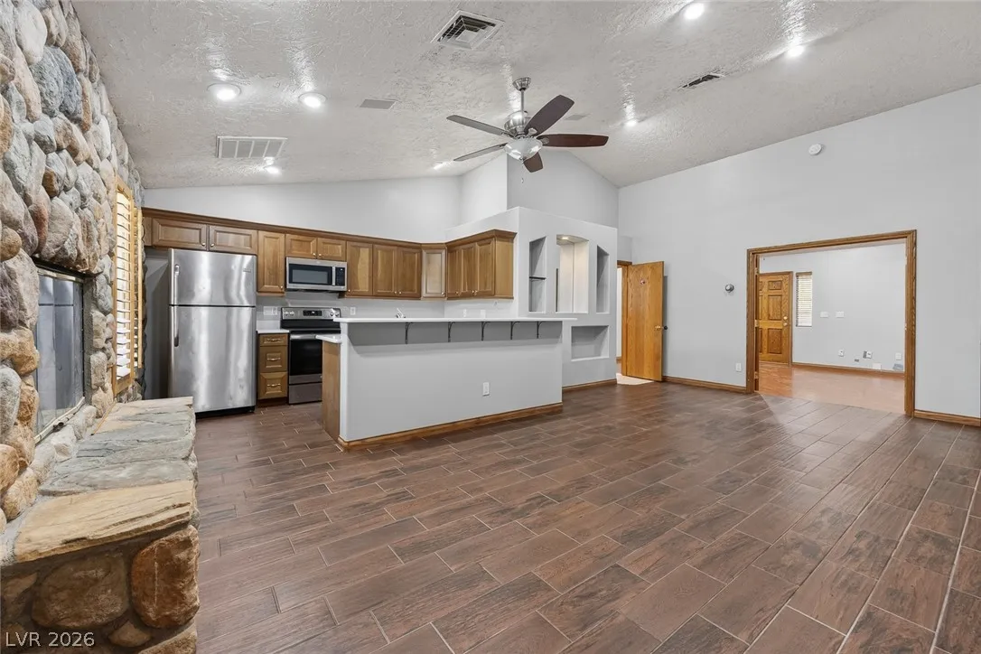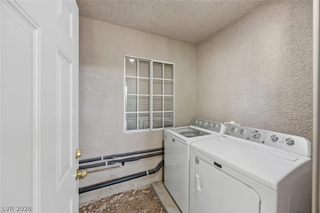 includes a full kitchen, living room with stone-clad fireplace, bedroom, restroom, dedicated washer and dryer, and