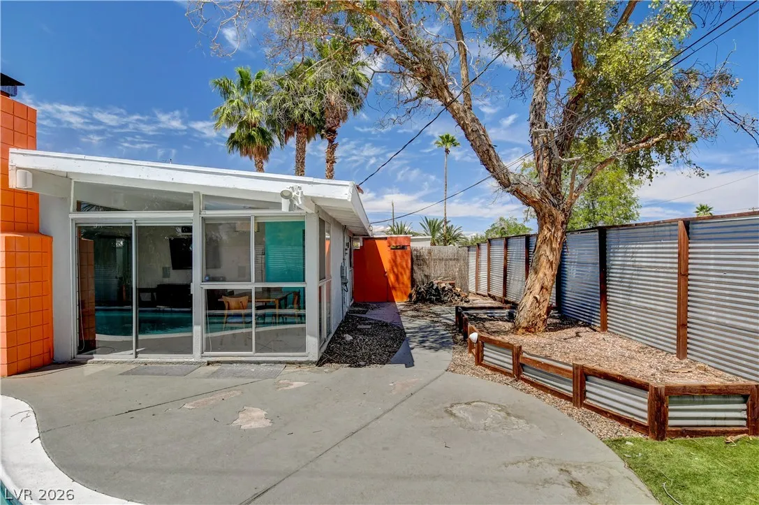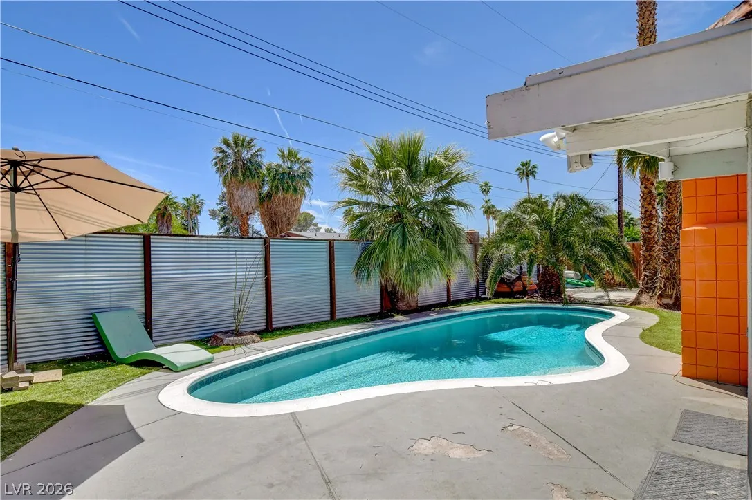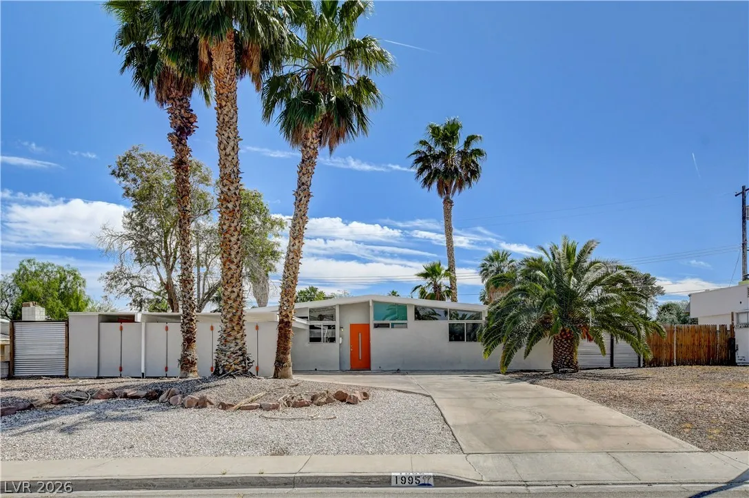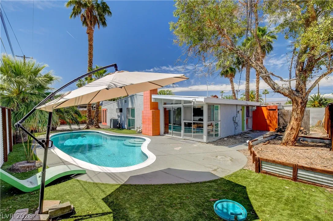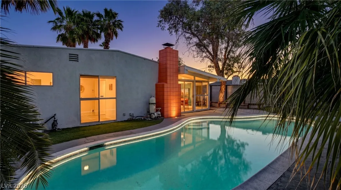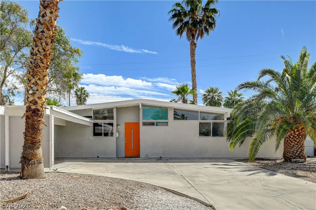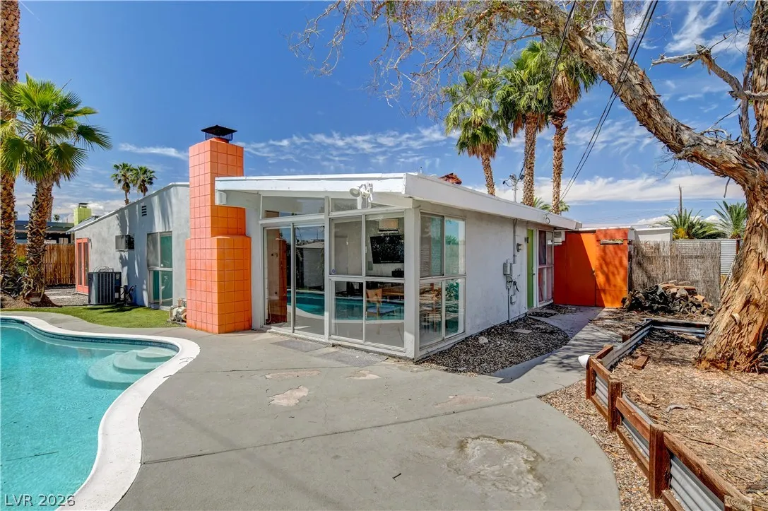 A preserved example of Mid-Century Modern architecture in historic Paradise Palms — Las Vegas’s first master-planned community and Clark County’s first designated historic overlay district. This Palmer & Krisel-era single-story retains its original architectural language: floor-to-ceiling glazing, exposed beam ceilings, a sculptural orange block fireplace, period-correct aqua interiors, and the signature carport-and-screen entry. The rear elevation opens to a kidney-shaped pool framed by an orange tile chimney and mature palms — hallmarks of the Stardust Country Club era. Updates include a galley kitchen with marble countertops and stainless appliances, and two renovated baths finished in subway tile with contemporary vanities. Minutes from the Strip, UNLV, Harry Reid International, and Las Vegas National Golf Course. A rare offering in one of Southern Nevada’s most architecturally significant neighborhoods.