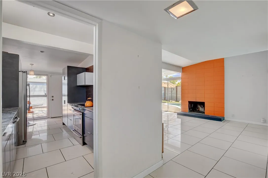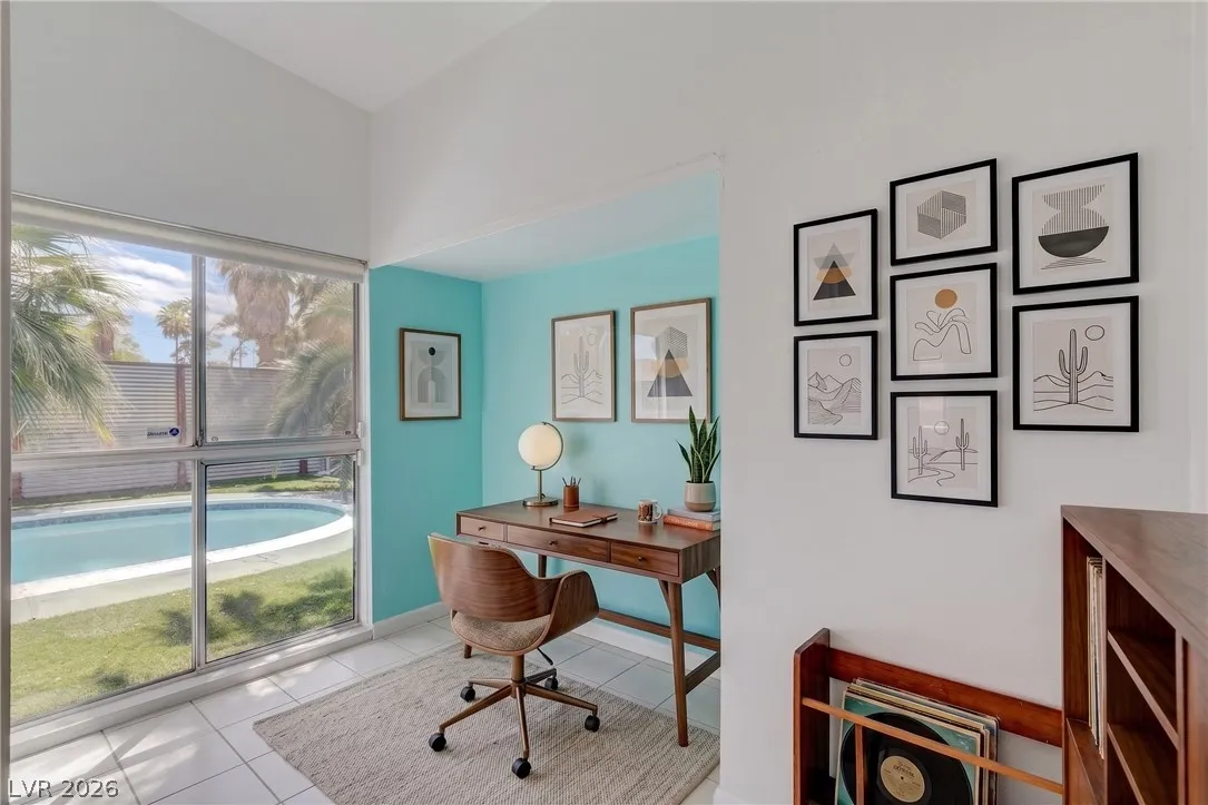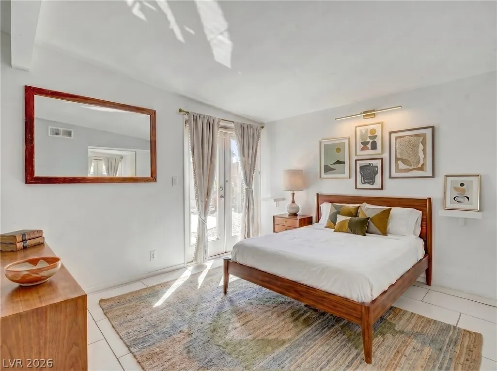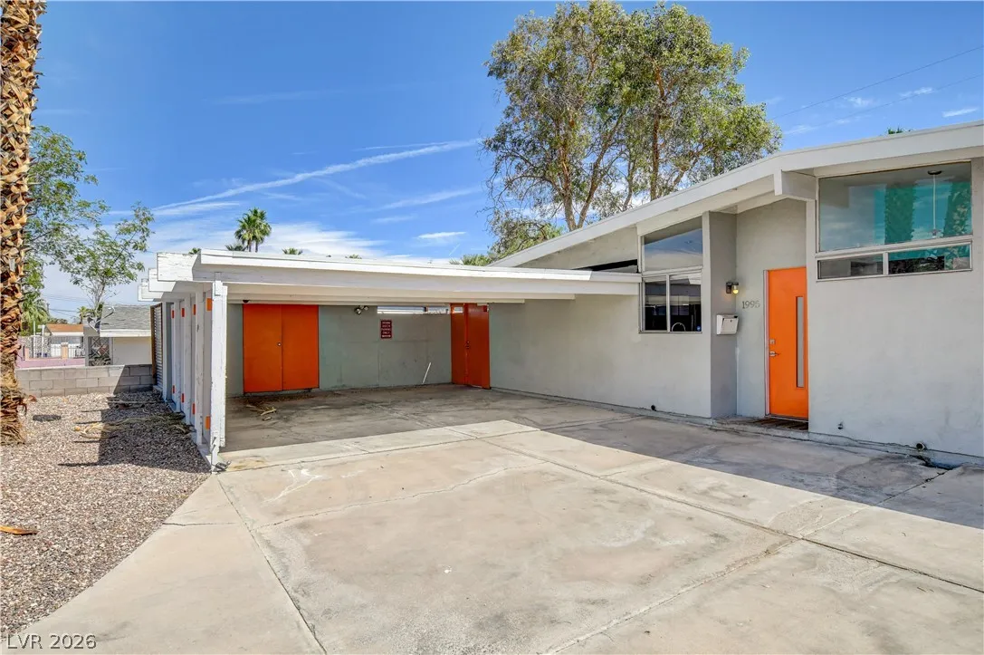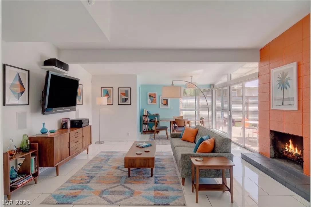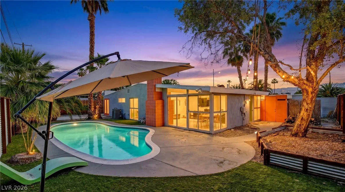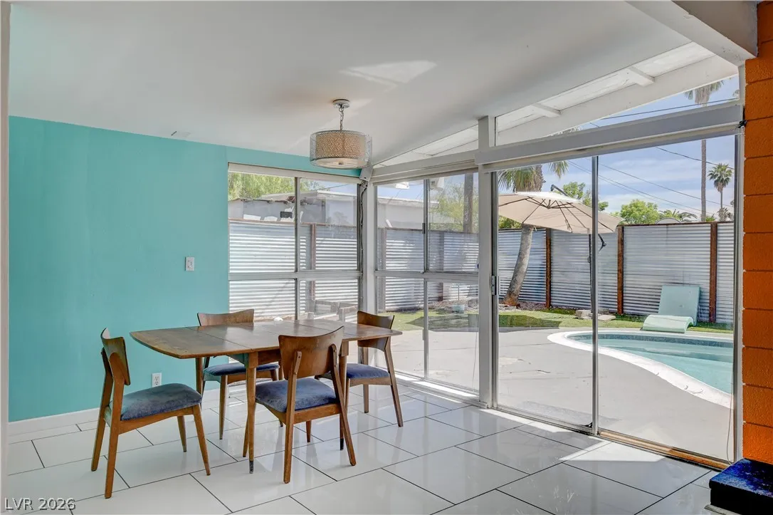 A preserved example of Mid-Century Modern architecture in historic Paradise Palms — Las Vegas’s first master-planned community and Clark County’s first designated historic overlay district. This Palmer & Krisel-era single-story retains its original architectural language: floor-to-ceiling glazing, exposed beam ceilings, a sculptural orange block fireplace, period-correct aqua interiors, and the signature carport-and-screen entry. The rear elevation opens to a kidney-shaped pool framed by an orange tile chimney and mature palms — hallmarks of the Stardust Country Club era. Updates include a galley kitchen with marble countertops and stainless appliances, and two renovated baths finished in subway tile with contemporary vanities. Minutes from the Strip, UNLV, Harry Reid International, and Las Vegas National Golf Course. A rare offering in one of Southern Nevada’s most architecturally significant neighborhoods.