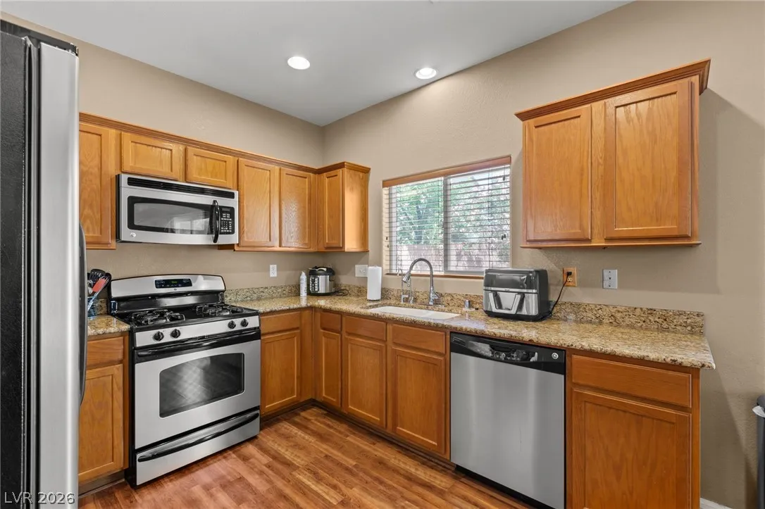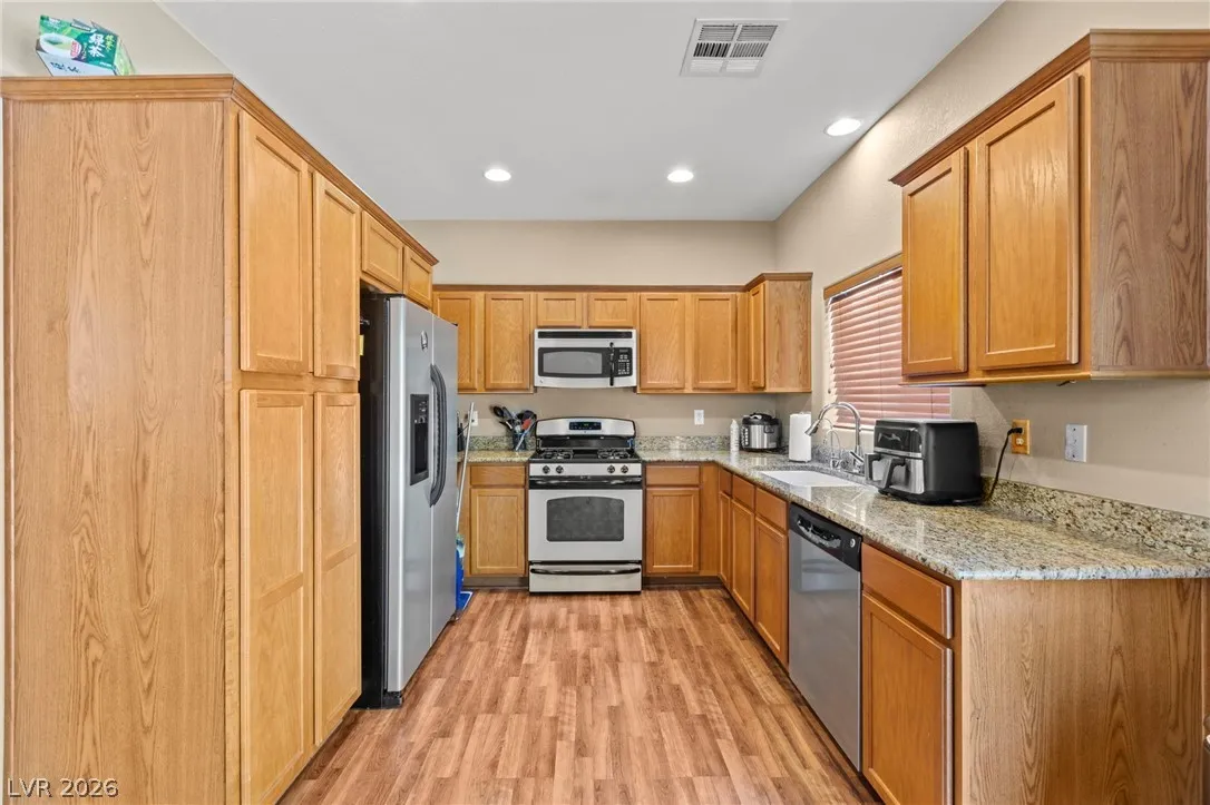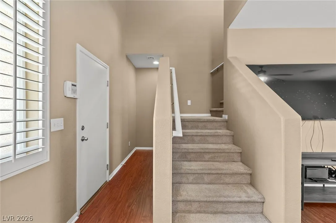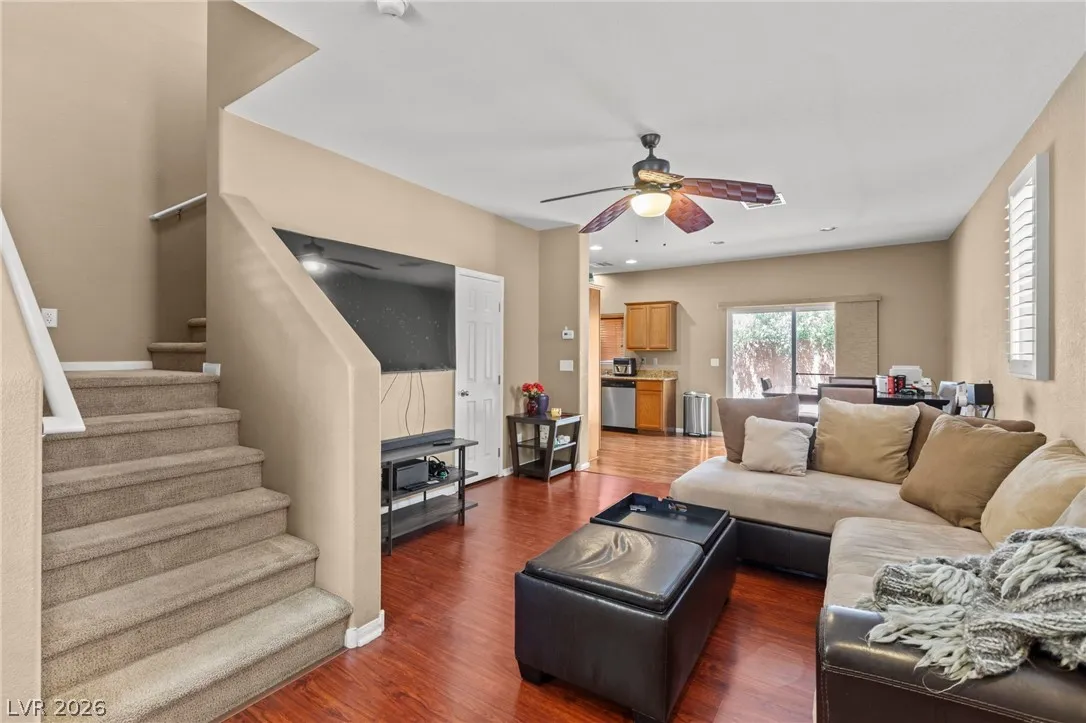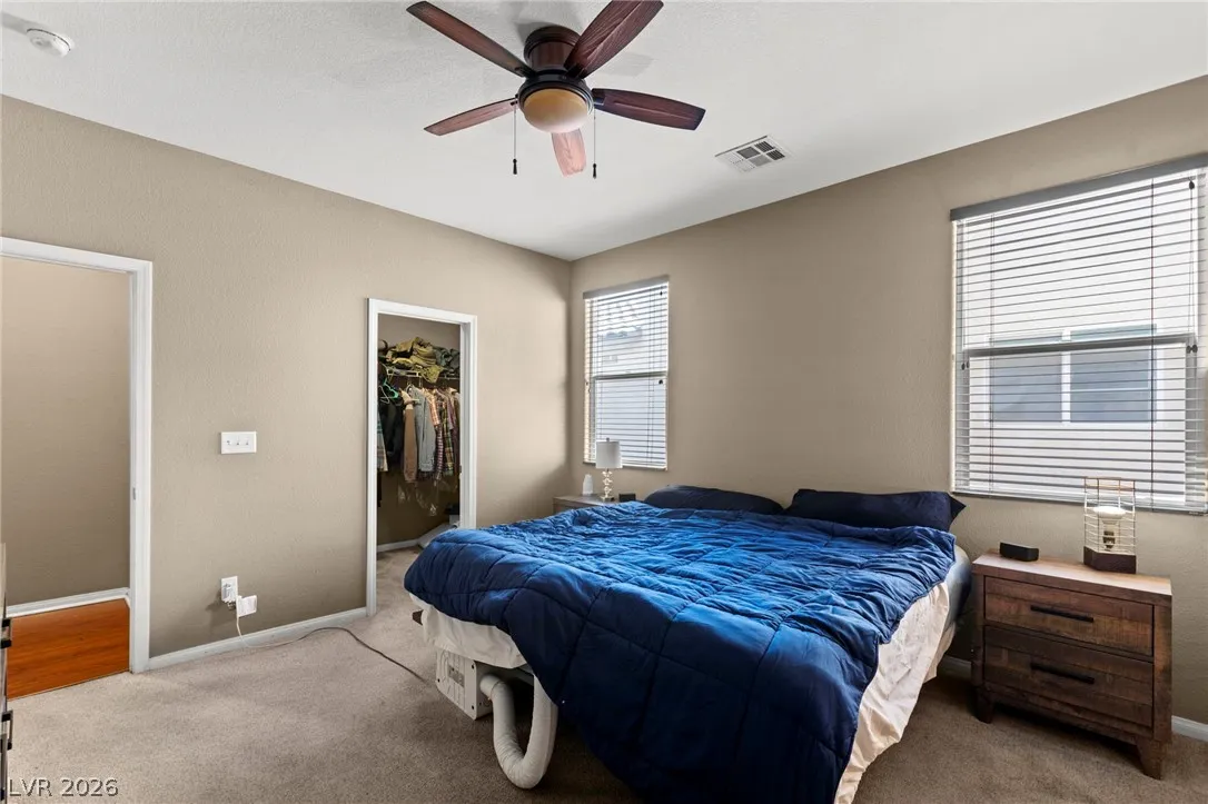 Move-in ready 3 bed, 2.5 bath home featuring a spacious loft and a highly desirable primary suite downstairs! This beautiful home offers a bright, clean, and modern feel from the moment you walk in! Updated carpet, flooring and paint, with ceiling fans in all bedrooms, loft, and great room! Large kitchen with abundant storage, stainless appliances, and a huge dining area that leads out to the private backyard! The open layout provides flexible living space perfect for relaxing or entertaining, while the oversized loft adds endless possibilities for a game room, office, or second living area. Awesome location near freeways, shopping, dining, and just minutes from the airport and the Las Vegas Strip! Turnkey and ready for immediate occupancy—don’t miss this one!