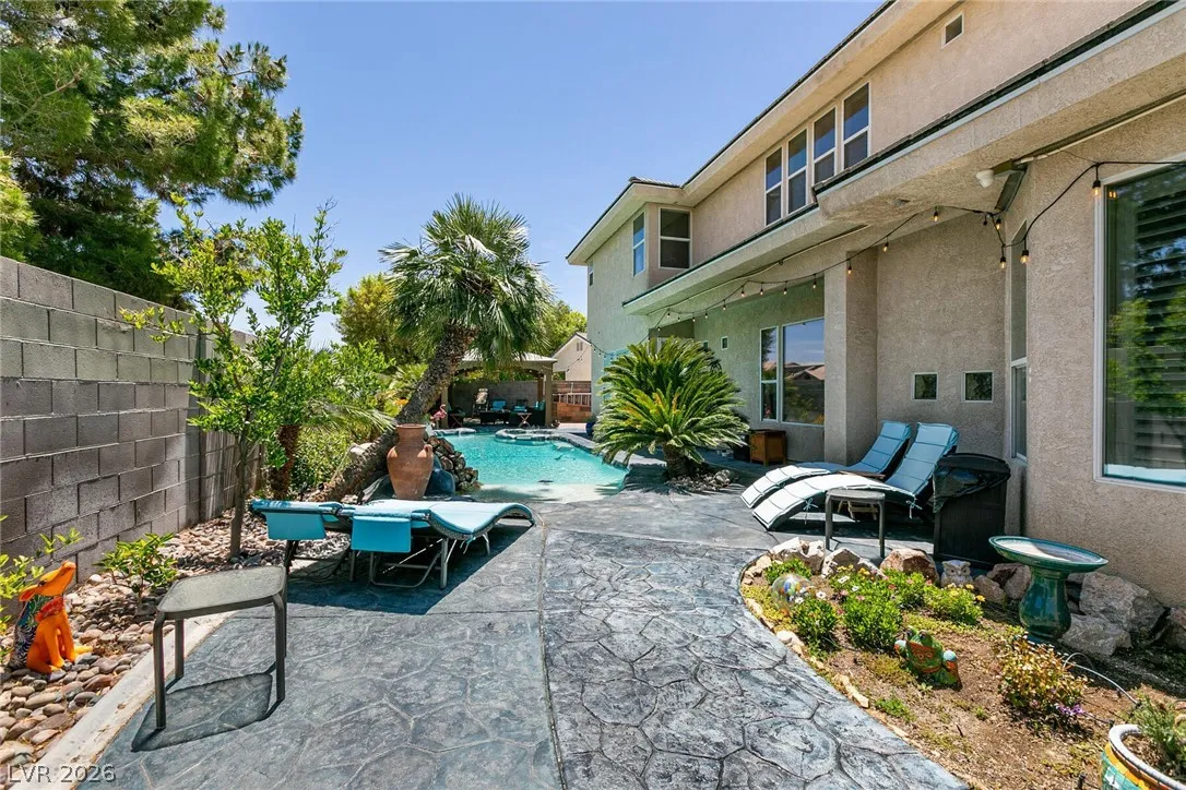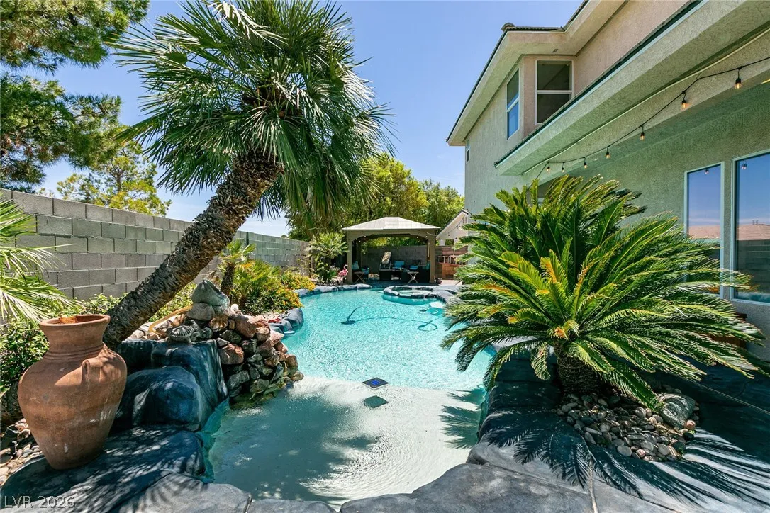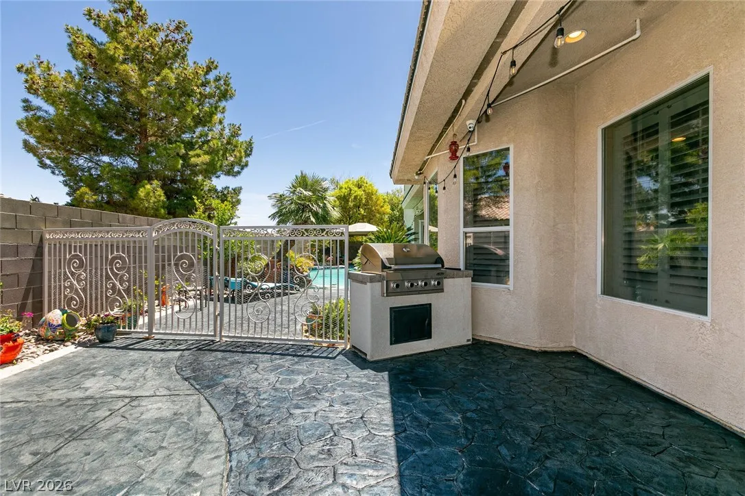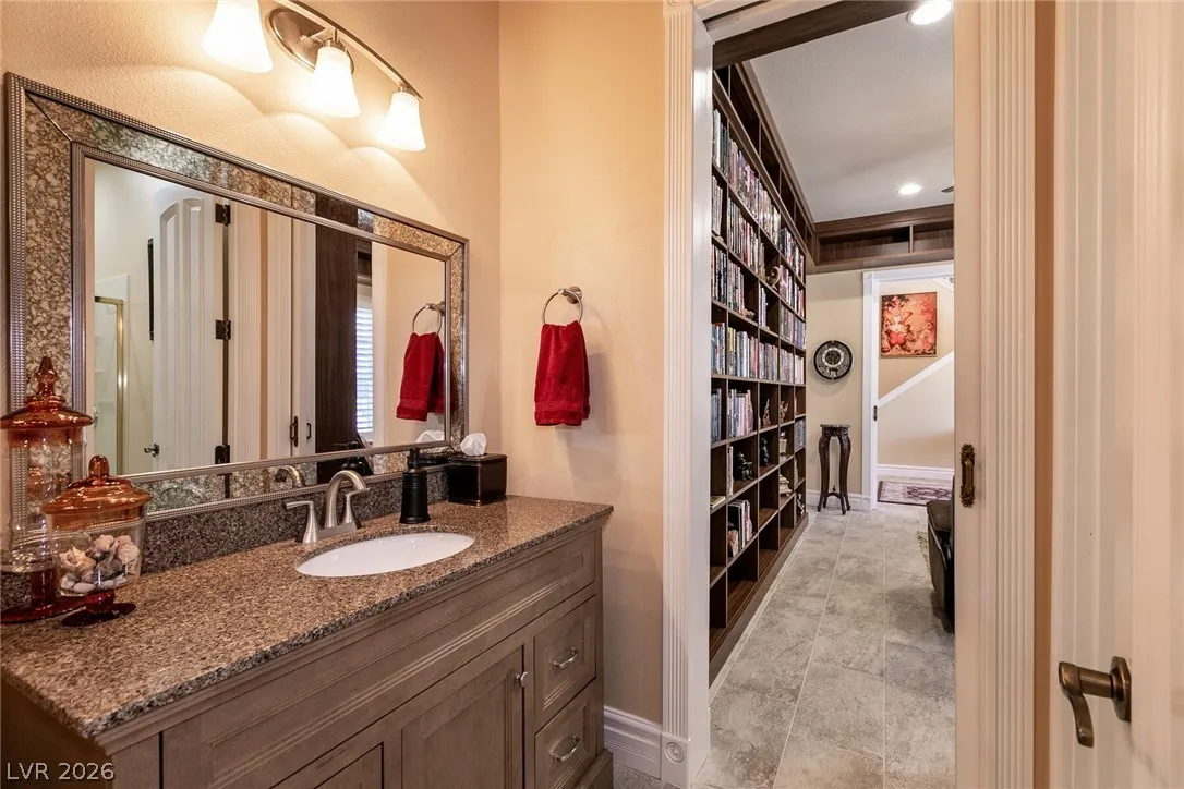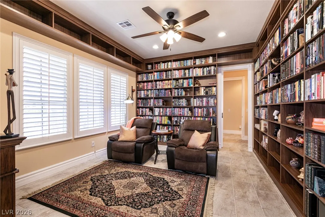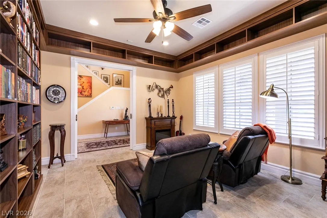 Welcome home to this custom beauty located in a gorgeous gated community*The entry leads to a spacious & versatile floor plan with newer porcelain flooring*Once inside, sliding glass doors open to the library with its built in bookcases, plantation shutters, closet and adjoining 3/4 bath*The chef’s kitchen features a breakfast nook overlooking the private backyard, custom cabinets, a 5 burner cooktop, double ovens and a butler’s pantry adjacent to a formal dining room with coved ceiling*Luxury awaits in the downstairs primary suite complete with a large sitting area, 2 big custom walk in closets, a 2-sided fireplace and access to the private backyard oasis with pool, spa, waterfall & covered patio*The secondary bedrooms all have walk in closets and adjoining baths*Windows have been replaced recently & a new tankless hot water heater has been installed*This is a great home for indoor or outdoor comfort & entertainment.