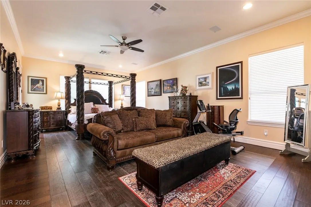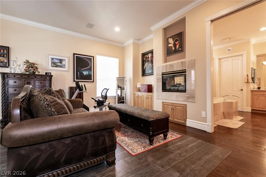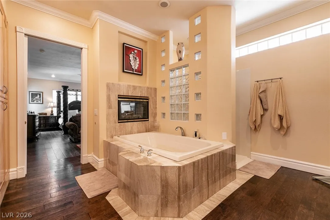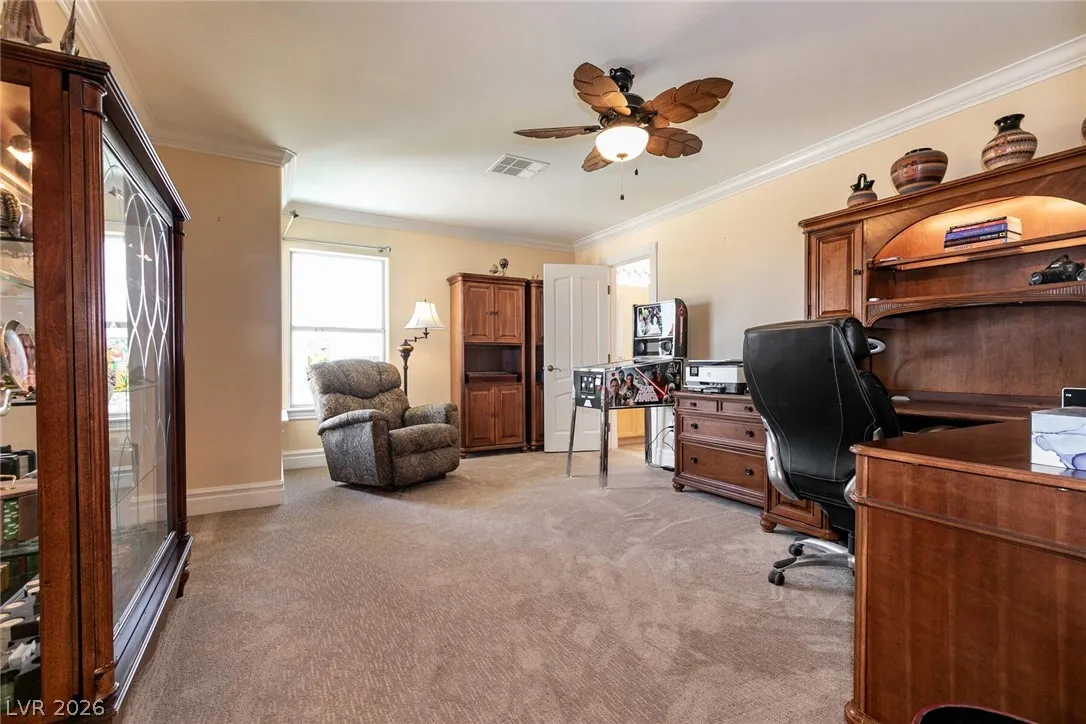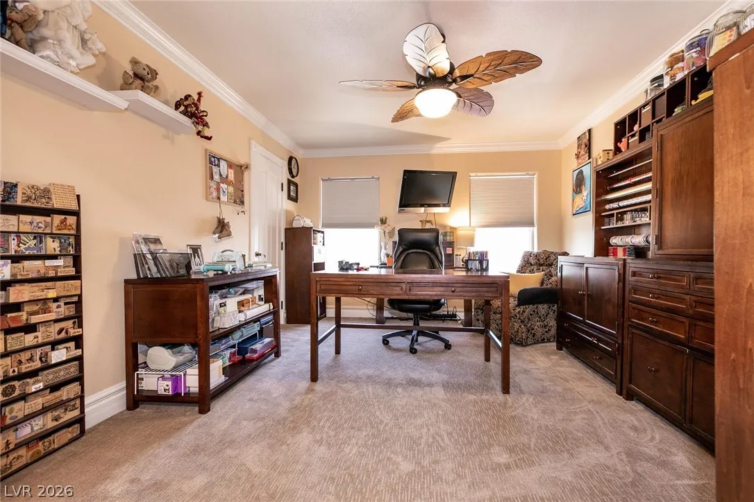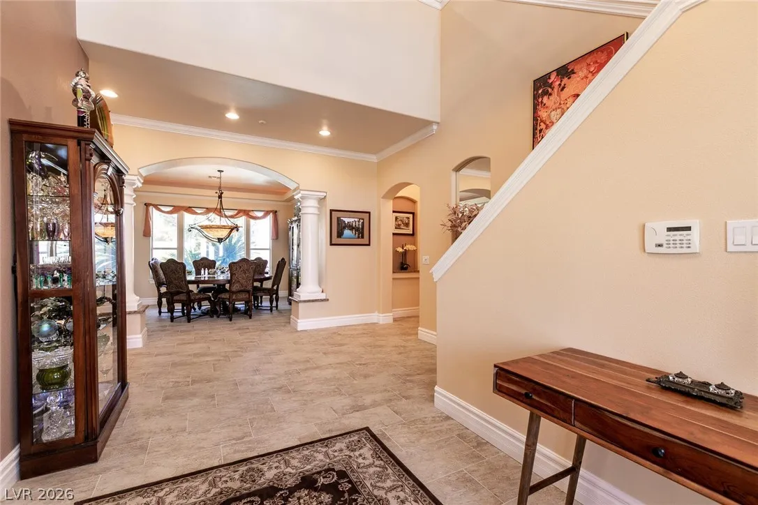 Welcome home to this custom beauty located in a gorgeous gated community*The entry leads to a spacious & versatile floor plan with newer porcelain flooring*Once inside, sliding glass doors open to the library with its built in bookcases, plantation shutters, closet and adjoining 3/4 bath*The chef’s kitchen features a breakfast nook overlooking the private backyard, custom cabinets, a 5 burner cooktop, double ovens and a butler’s pantry adjacent to a formal dining room with coved ceiling*Luxury awaits in the downstairs primary suite complete with a large sitting area, 2 big custom walk in closets, a 2-sided fireplace and access to the private backyard oasis with pool, spa, waterfall & covered patio*The secondary bedrooms all have walk in closets and adjoining baths*Windows have been replaced recently & a new tankless hot water heater has been installed*This is a great home for indoor or outdoor comfort & entertainment.
