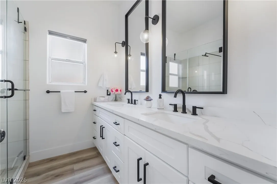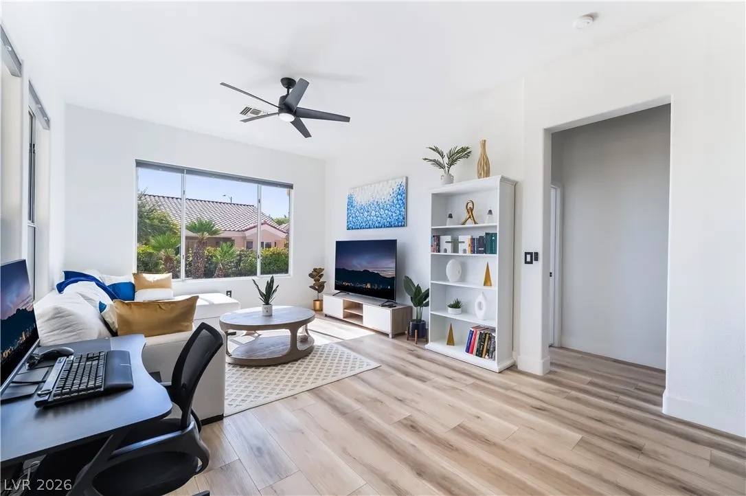 Welcome to your elevated breath taking desert retreat in Sun City Summerlin—perfect for the 55+ buyer seeking style, comfort, and an active lifestyle. This fully remodeled, move-in-ready home showcases fresh interior paint, custom white shaker cabinetry, quartz countertops, luxury vinyl plank flooring, plush bedroom carpet, 5.5” baseboards, stainless steel appliances, and sleek modern fixtures throughout. The open-concept design is ideal for entertaining or unwinding after a day of golf or enjoying the community’s premier amenities. The spacious primary suite offers a private escape with a spa-inspired bath featuring a freestanding soaking tub, oversized step-in shower, and a cozy fireplace. Step outside to a beautifully landscaped backyard, perfect for soaking up the Las Vegas sunshine. Conveniently located near golf, dining, shopping, and entertainment. Experience the vibrant, resort-style living you’ve earned—welcome home!