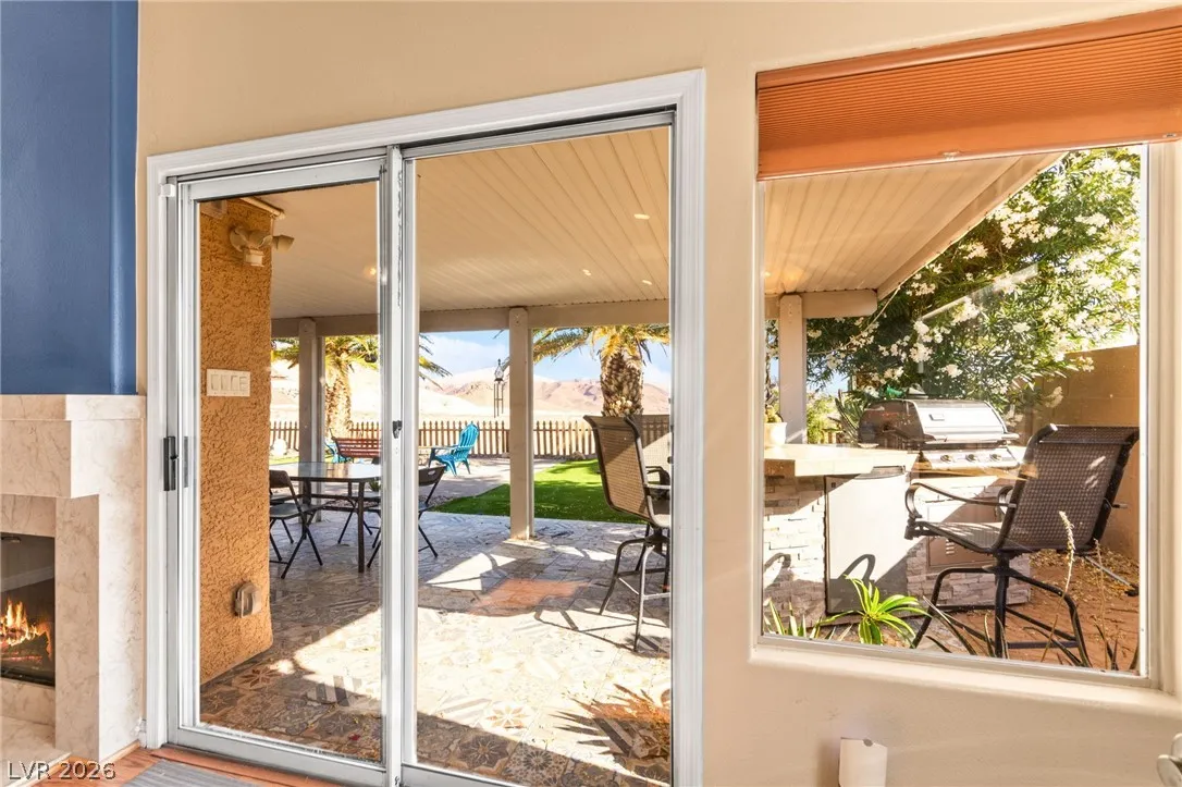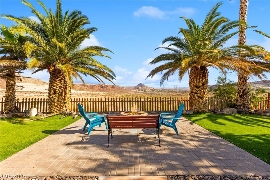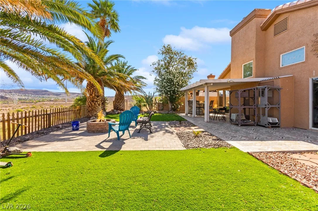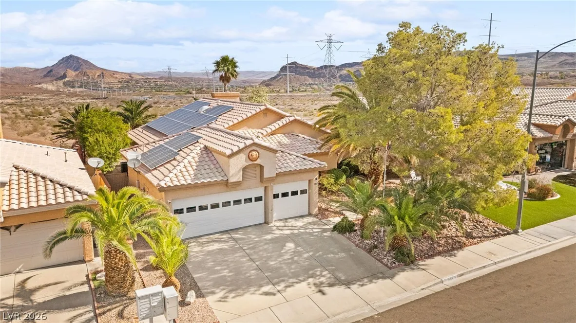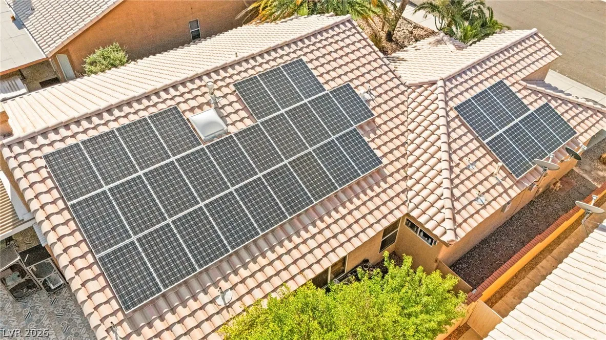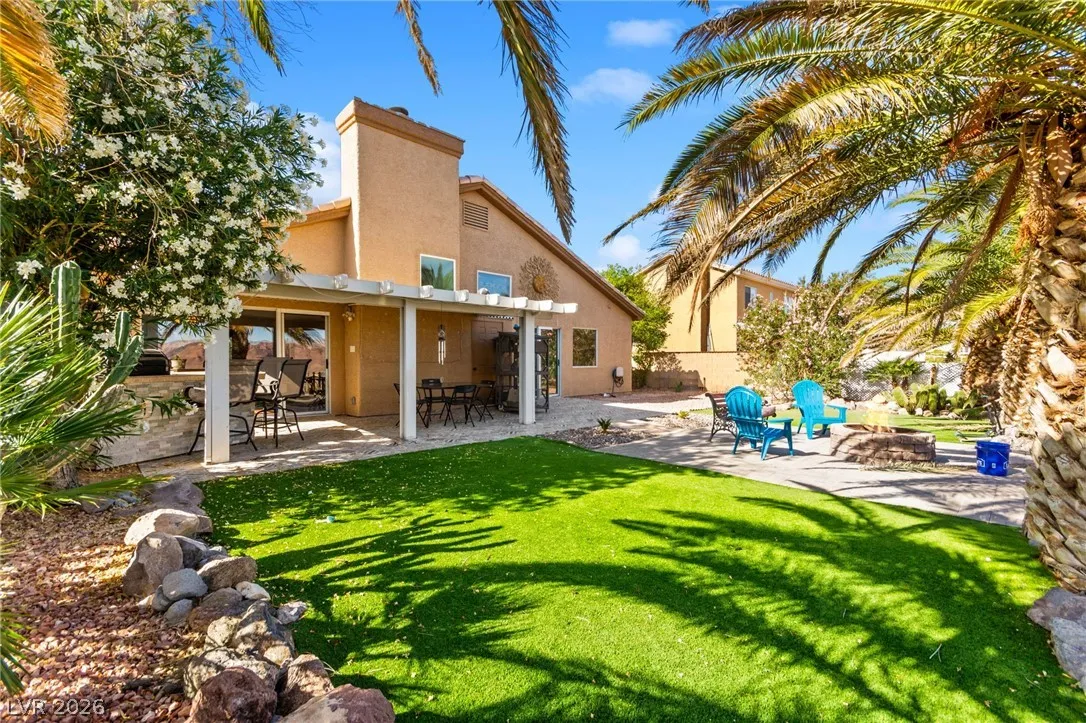 Unobstructed mountain views, NO HOA, no rear neighbors, and owned solar with low NV Energy bills. This 4-bedroom, 3-bath home includes a private en-suite bedroom—ideal for guests or multi-gen living. Vaulted ceilings and added windows bring in abundant natural light, complemented by wood flooring and surround sound. Step outside to your backyard oasis featuring a covered patio, built-in BBQ, firepit, pavers, faux grass, and mature landscaping. Inside, enjoy a cozy family room fireplace and a 3-car garage with built-in shelving. The spacious primary suite offers direct backyard access and a spa-like ensuite with vessel sinks, soaking tub, and separate shower. HVAC replaced in 2024.