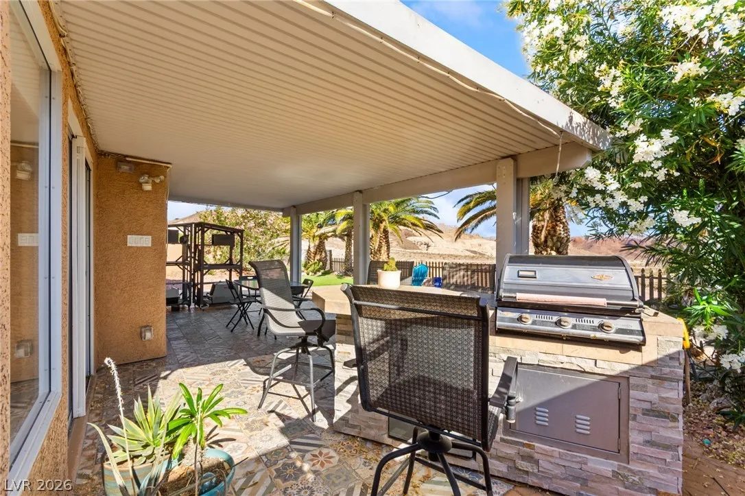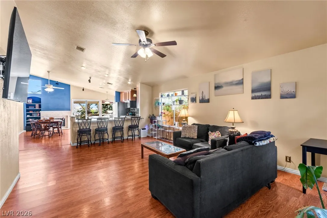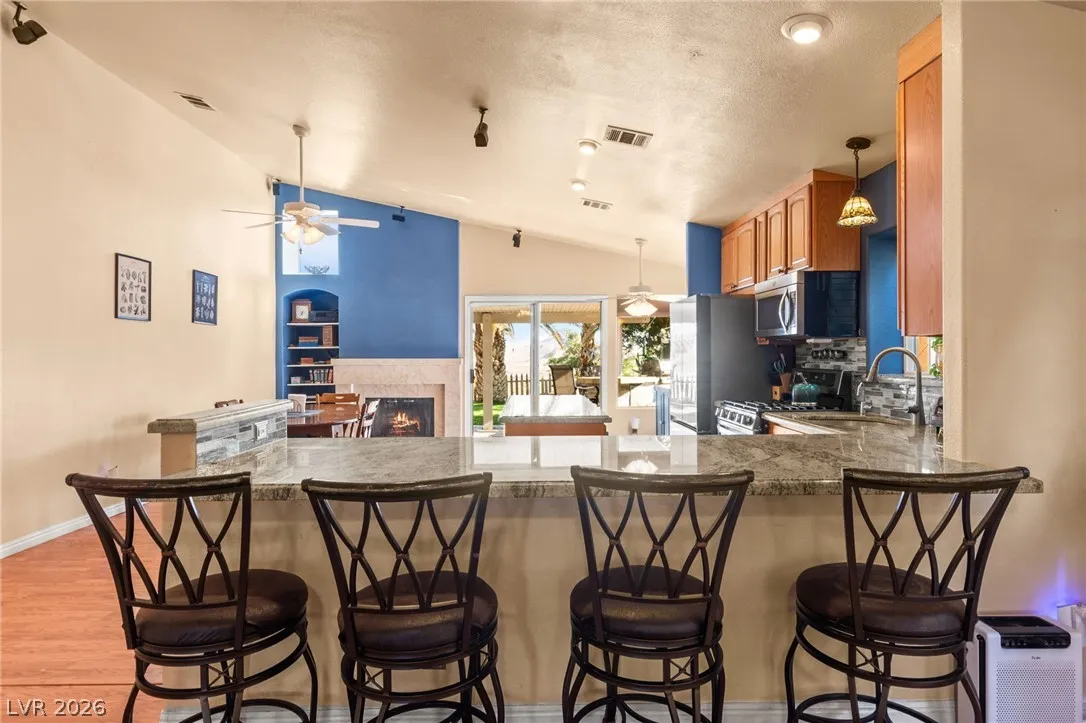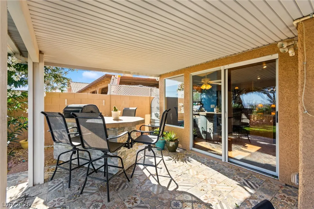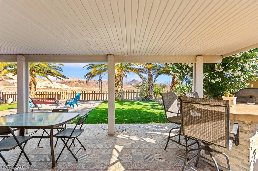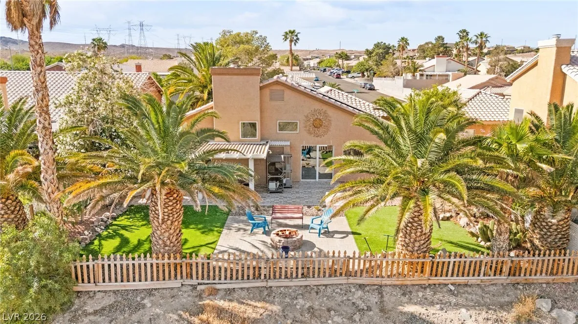 Unobstructed mountain views, NO HOA, no rear neighbors, and owned solar with low NV Energy bills. This 4-bedroom, 3-bath home includes a private en-suite bedroom—ideal for guests or multi-gen living. Vaulted ceilings and added windows bring in abundant natural light, complemented by wood flooring and surround sound. Step outside to your backyard oasis featuring a covered patio, built-in BBQ, firepit, pavers, faux grass, and mature landscaping. Inside, enjoy a cozy family room fireplace and a 3-car garage with built-in shelving. The spacious primary suite offers direct backyard access and a spa-like ensuite with vessel sinks, soaking tub, and separate shower. HVAC replaced in 2024.