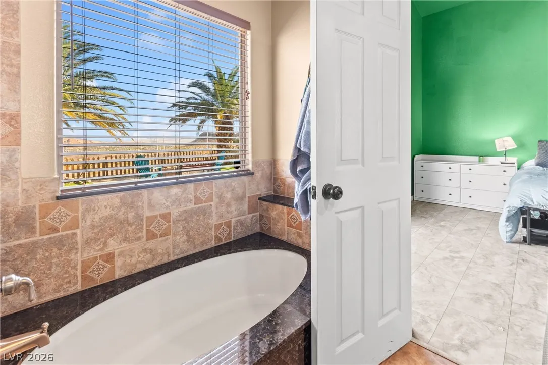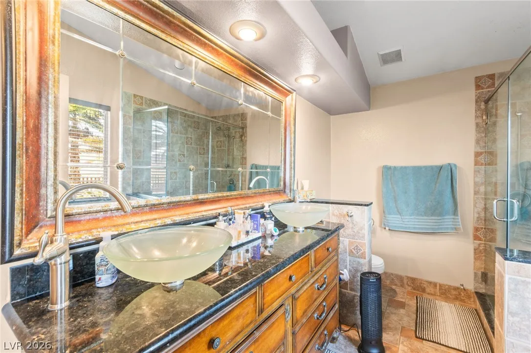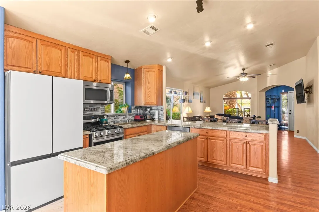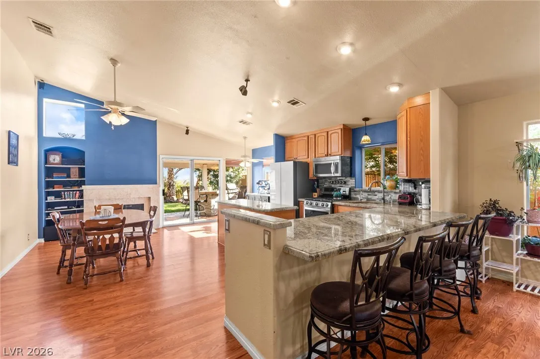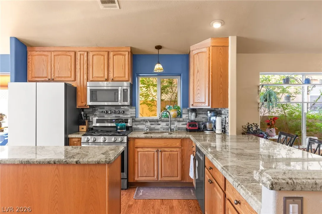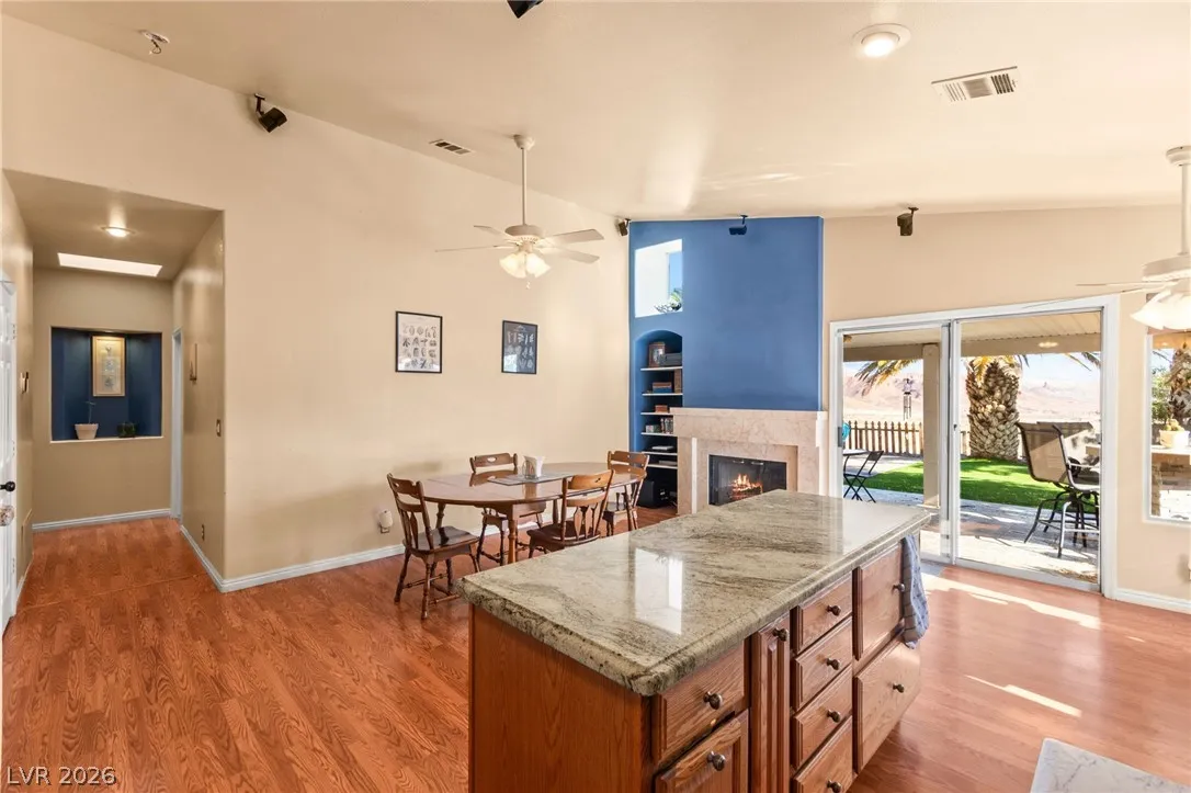 Unobstructed mountain views, NO HOA, no rear neighbors, and owned solar with low NV Energy bills. This 4-bedroom, 3-bath home includes a private en-suite bedroom—ideal for guests or multi-gen living. Vaulted ceilings and added windows bring in abundant natural light, complemented by wood flooring and surround sound. Step outside to your backyard oasis featuring a covered patio, built-in BBQ, firepit, pavers, faux grass, and mature landscaping. Inside, enjoy a cozy family room fireplace and a 3-car garage with built-in shelving. The spacious primary suite offers direct backyard access and a spa-like ensuite with vessel sinks, soaking tub, and separate shower. HVAC replaced in 2024.