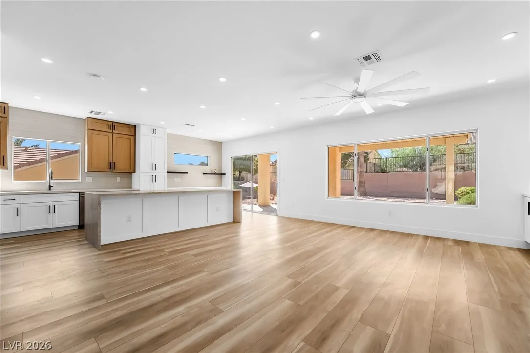 Experience this Immaculate Remodeled Single-Story in the heart of Sun City Anthem. Step inside to an airy, Open-Concept layout defined by seamless Luxury Vinyl Plank flooring. The Living Room draws you in with a custom Accent Wall featuring a built-in Electric Fireplace and brand-new 75” Smart TV. Transition into the showstopper Kitchen, boasting American-Made double-stacked cabinetry, Stainless Steel appliances, and a breathtaking dual-waterfall Taj Mahal Quartz island.