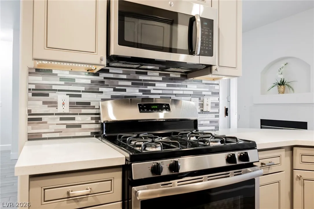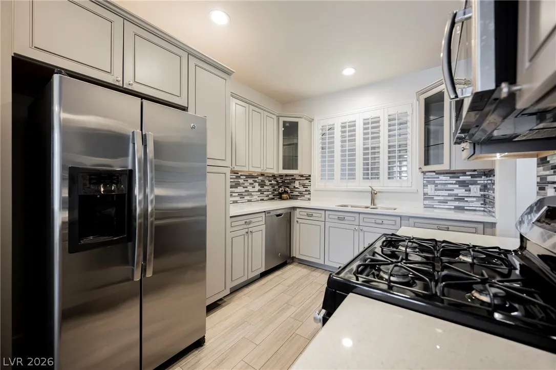 Resort-style living at its best in the guard-gated Resort Villas community of Green Valley. The inviting living room features a stylish fireplace and flows seamlessly into the open-concept layout. Freshly updated with new paint, modern lighting, brand-new carpet, tile throughout, and a beautifully spacious, updated modern kitchen, this stunning 3-bedroom, 2-bath condo offers both style and comfort. Plantation shutters thru out. Vaulted ceilings create a bright, airy atmosphere, complemented by a private balcony—accessible from both the living area and the primary bedroom via a sliding glass door—perfect for relaxing or entertaining. Residents enjoy exceptional amenities including a pool, spa, tennis courts, fitness center, clubhouse, and BBQ areas. The condo also includes an attached garage and is conveniently located near shopping, dining, and the Green Valley Ranch area.