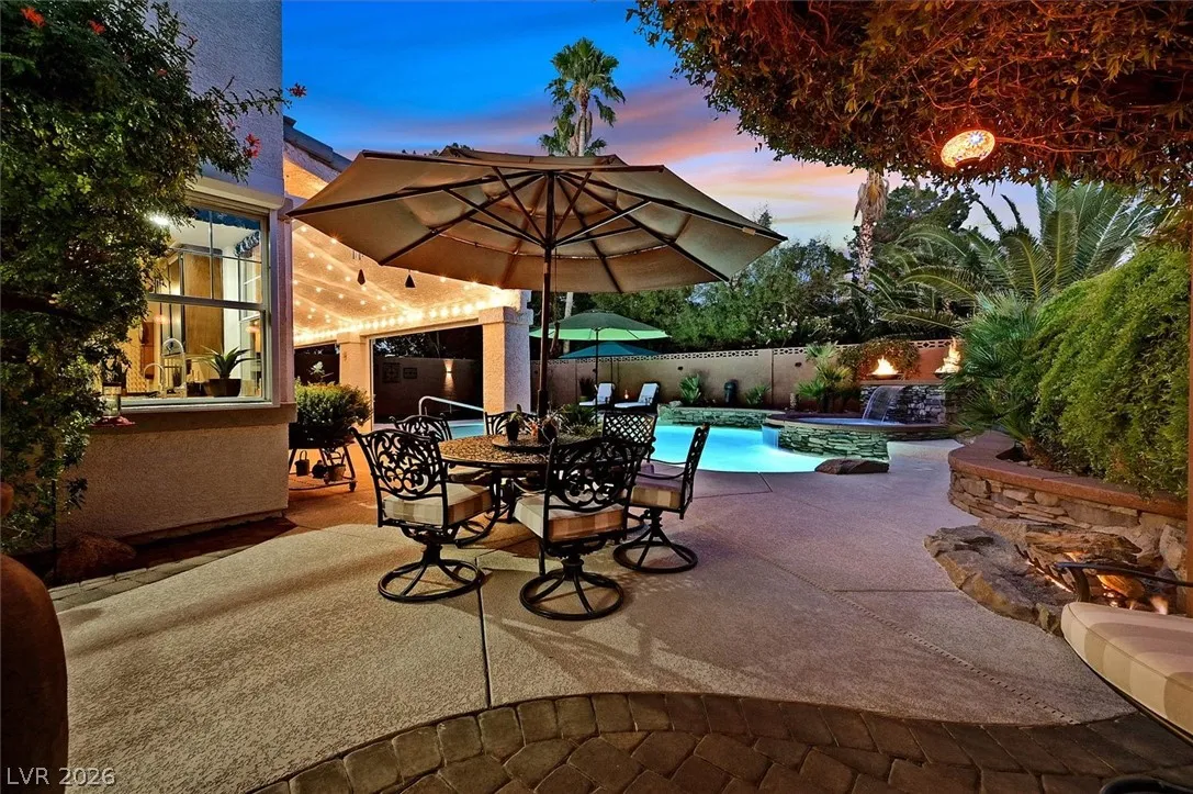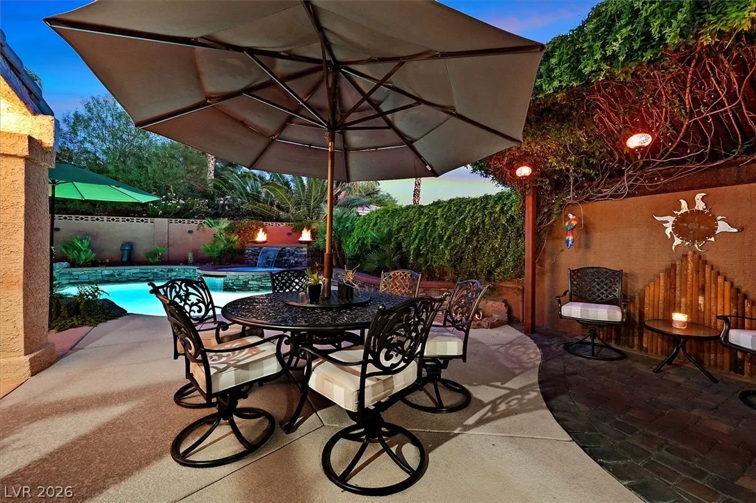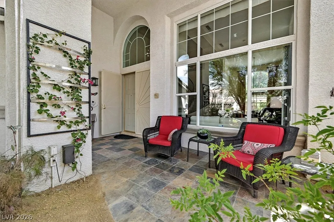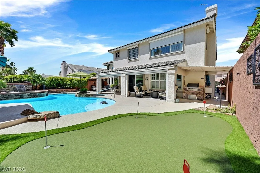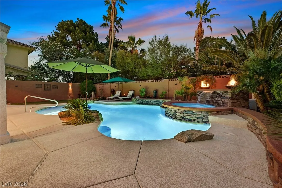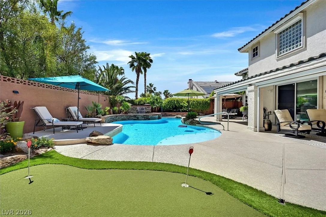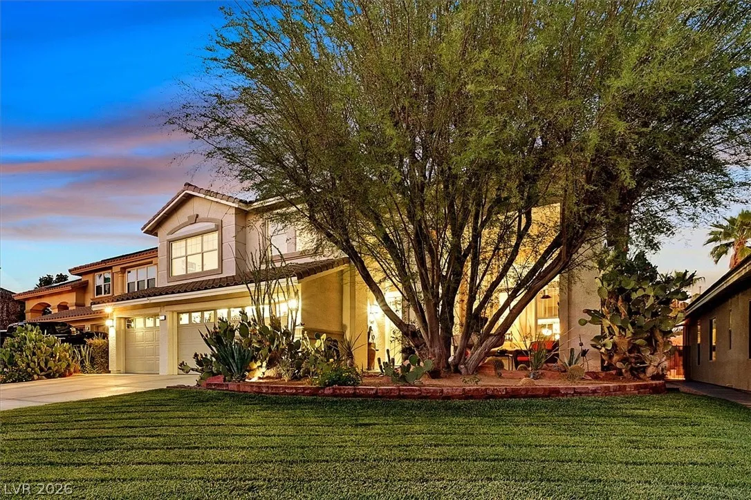 Located in the gated community of Tahoe Estates, 3734 Broadmead is a private desert retreat blending thoughtful upgrades with timeless charm. This gated home welcomes you through an enchanting courtyard with mature cacti, hummingbirds, and a tranquil fountain. Meticulously maintained, the home features soaring 19-ft ceilings and a striking chandelier in the grand entry. The updated chef’s kitchen with garden window flows seamlessly into the main living areas. A modern fireplace anchors the living room, while a stylish bar just off the family room creates an ideal space for entertaining. The backyard offers a resort-style pool and spa with waterfalls, stunning when illuminated at night. The front yard features lush, manicured natural grass—rare and inviting. Pride of ownership shines throughout this move-in-ready home, offering comfort, elegance, and exceptional indoor-outdoor living.