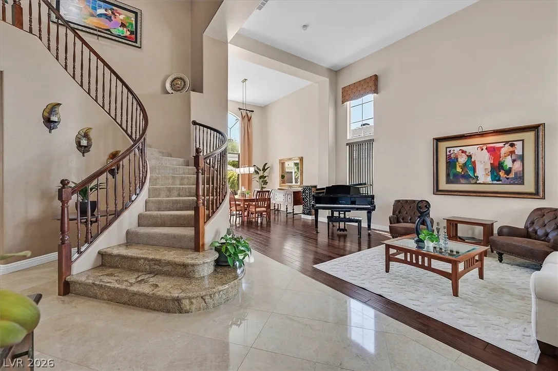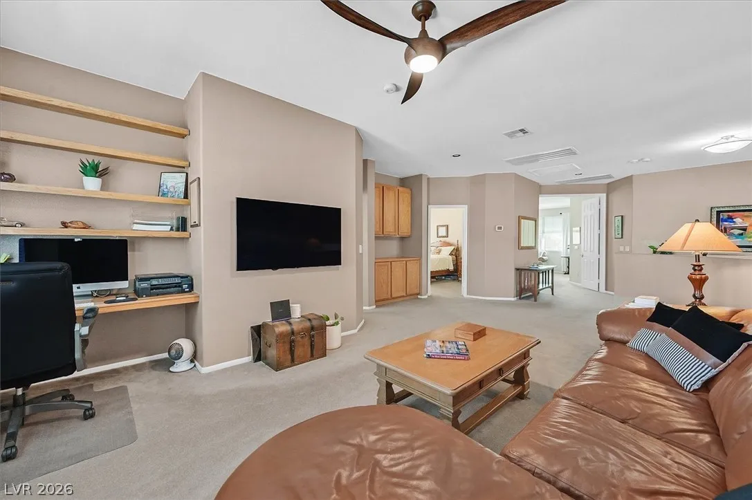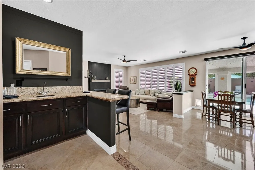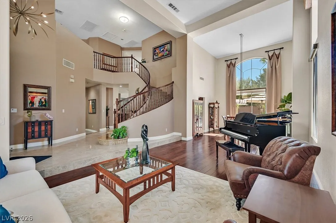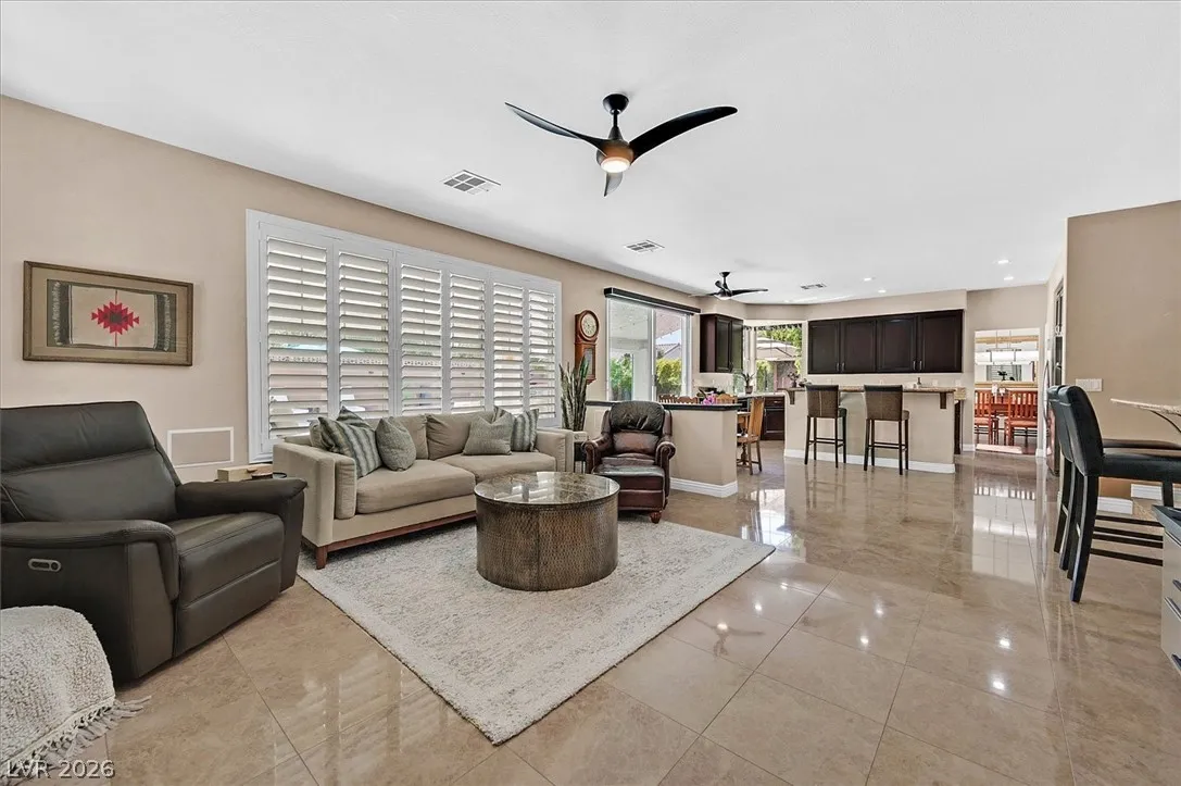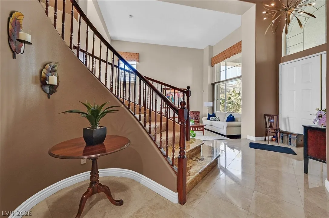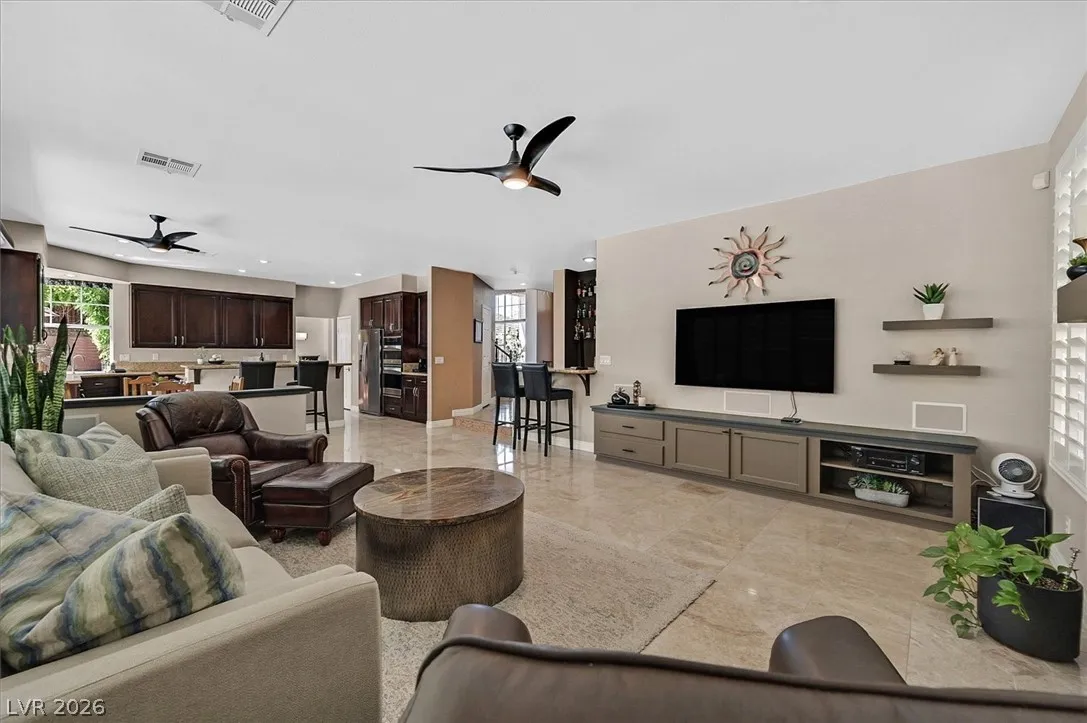 Located in the gated community of Tahoe Estates, 3734 Broadmead is a private desert retreat blending thoughtful upgrades with timeless charm. This gated home welcomes you through an enchanting courtyard with mature cacti, hummingbirds, and a tranquil fountain. Meticulously maintained, the home features soaring 19-ft ceilings and a striking chandelier in the grand entry. The updated chef’s kitchen with garden window flows seamlessly into the main living areas. A modern fireplace anchors the living room, while a stylish bar just off the family room creates an ideal space for entertaining. The backyard offers a resort-style pool and spa with waterfalls, stunning when illuminated at night. The front yard features lush, manicured natural grass—rare and inviting. Pride of ownership shines throughout this move-in-ready home, offering comfort, elegance, and exceptional indoor-outdoor living.