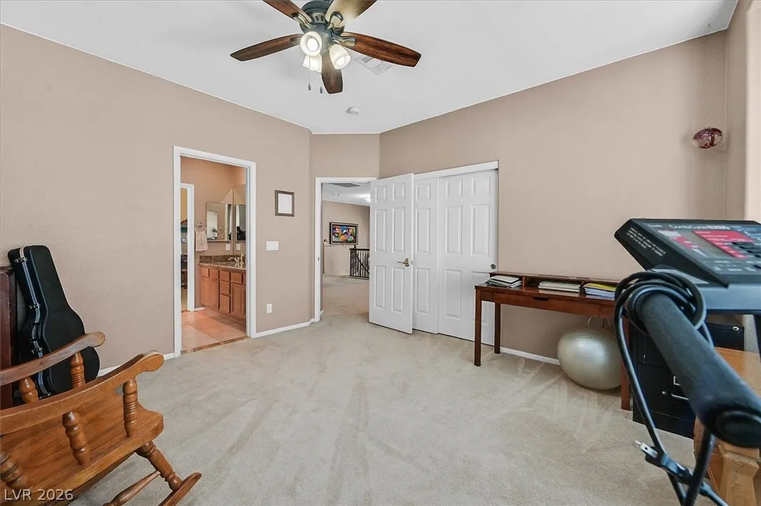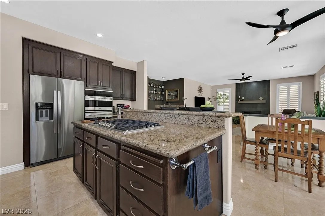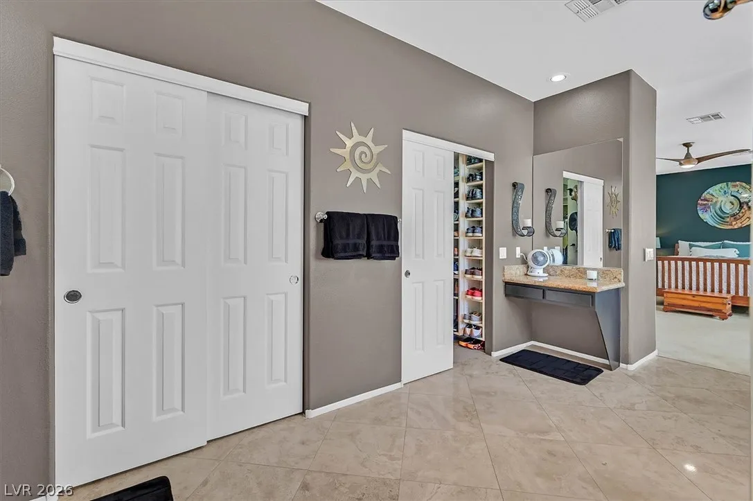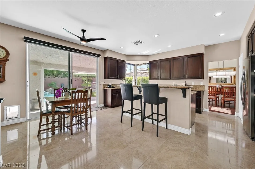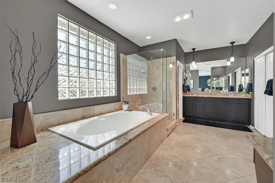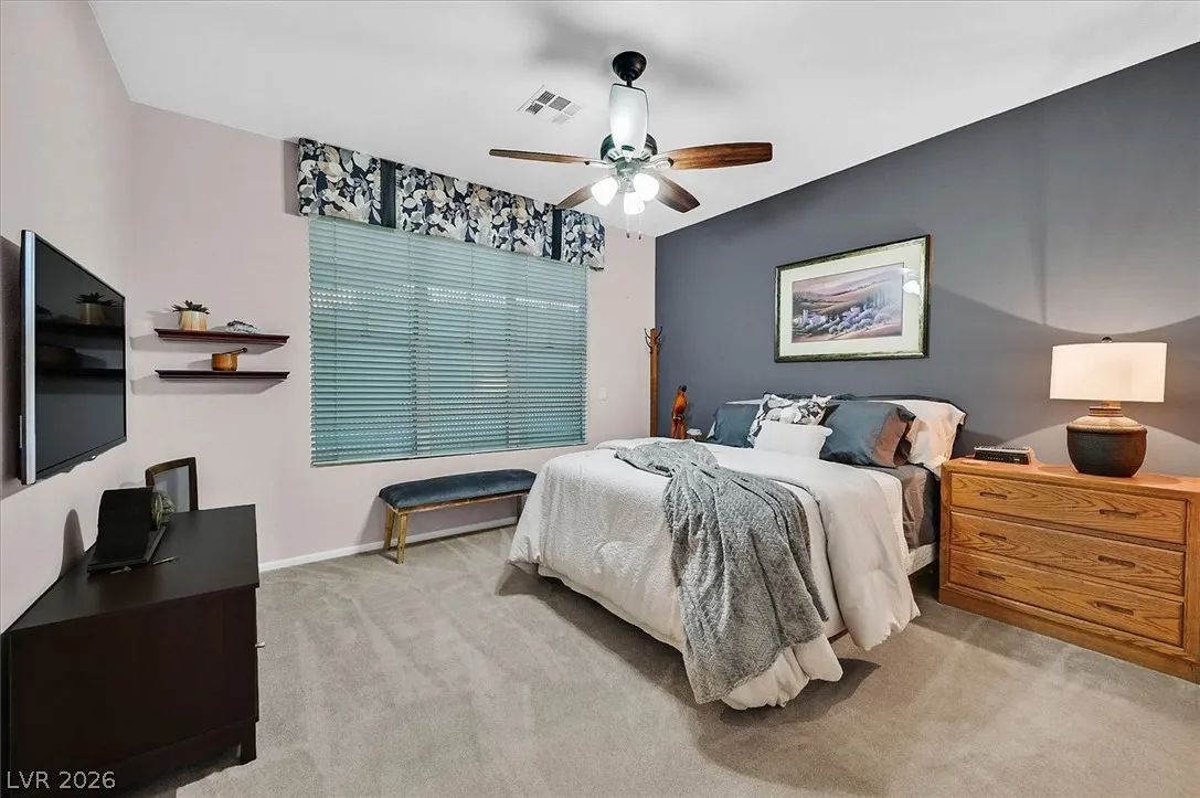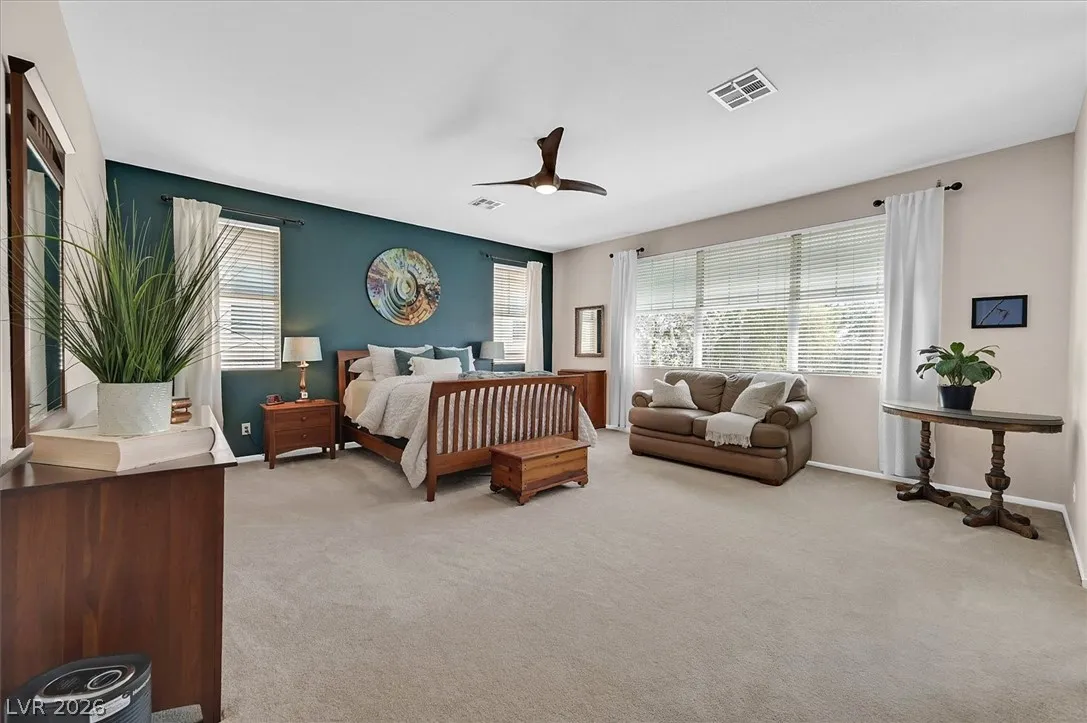 Located in the gated community of Tahoe Estates, 3734 Broadmead is a private desert retreat blending thoughtful upgrades with timeless charm. This gated home welcomes you through an enchanting courtyard with mature cacti, hummingbirds, and a tranquil fountain. Meticulously maintained, the home features soaring 19-ft ceilings and a striking chandelier in the grand entry. The updated chef’s kitchen with garden window flows seamlessly into the main living areas. A modern fireplace anchors the living room, while a stylish bar just off the family room creates an ideal space for entertaining. The backyard offers a resort-style pool and spa with waterfalls, stunning when illuminated at night. The front yard features lush, manicured natural grass—rare and inviting. Pride of ownership shines throughout this move-in-ready home, offering comfort, elegance, and exceptional indoor-outdoor living.