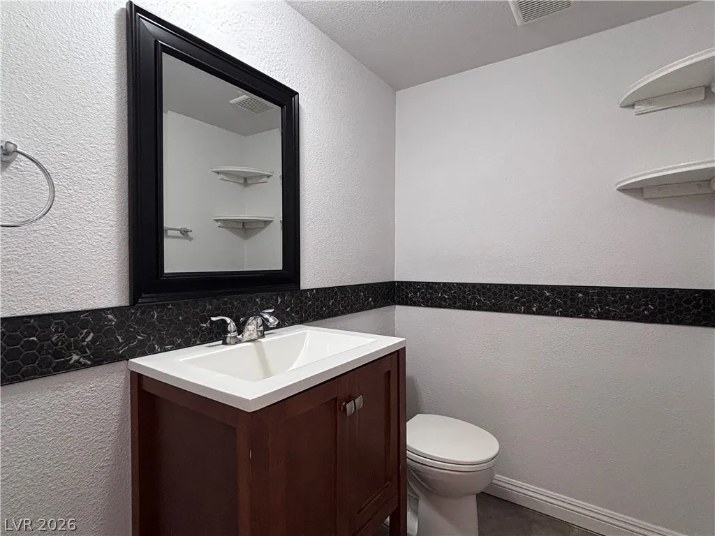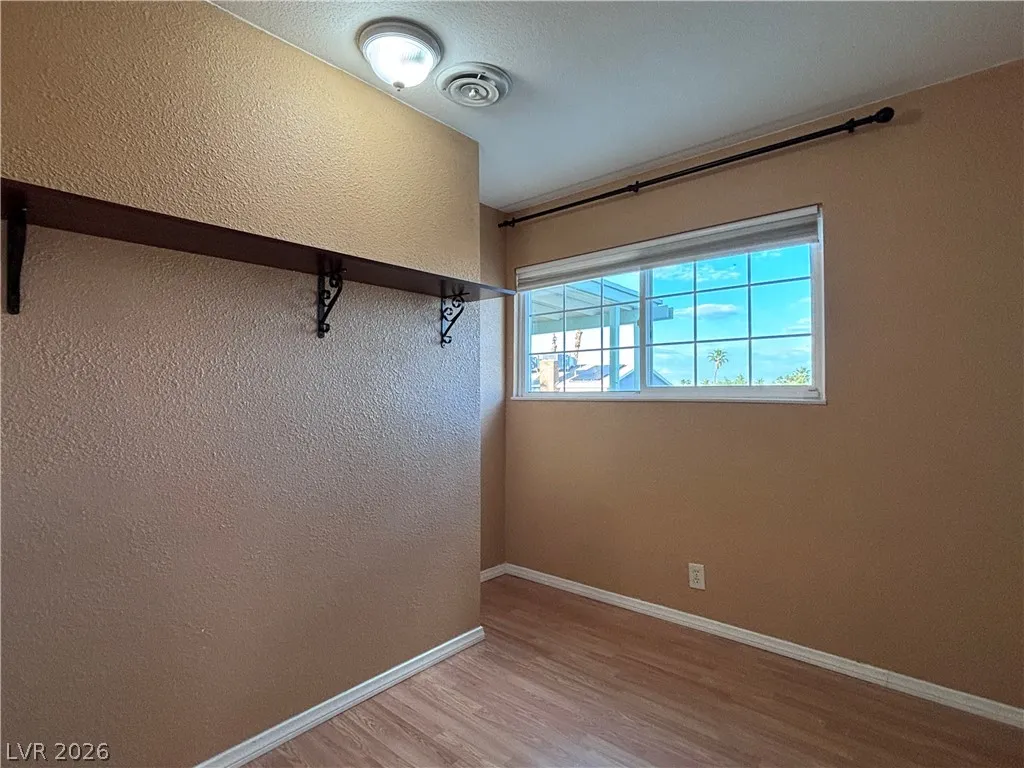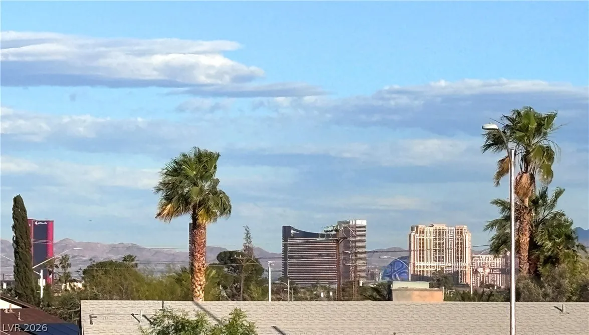 All three bedrooms are upstairs, including a generously sized primary suite with a private patio showcasing views of the Las Vegas Strip. The secondary bedrooms share a full bathroom.