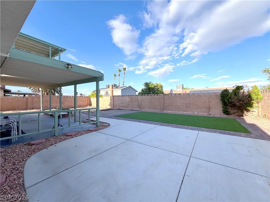The backyard is low-maintenance with artificial grass, space for gardening, and a covered patio for shade and outdoor enjoyment.