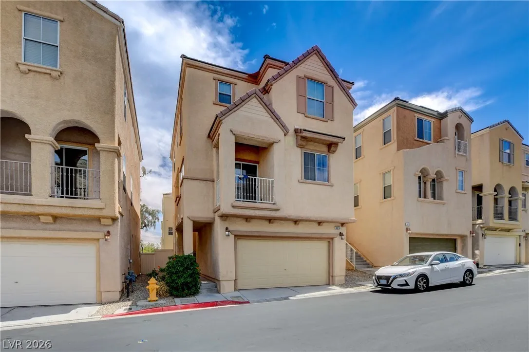 All three bedrooms are upstairs, including a generously sized primary suite with a private patio showcasing views of the Las Vegas Strip. The secondary bedrooms share a full bathroom.