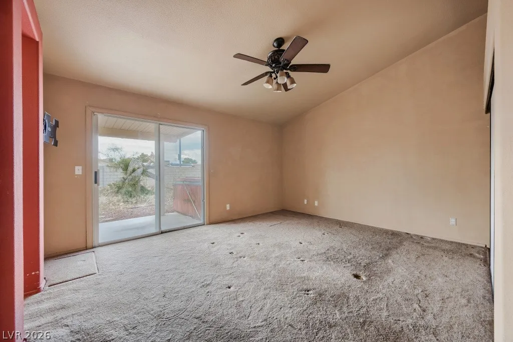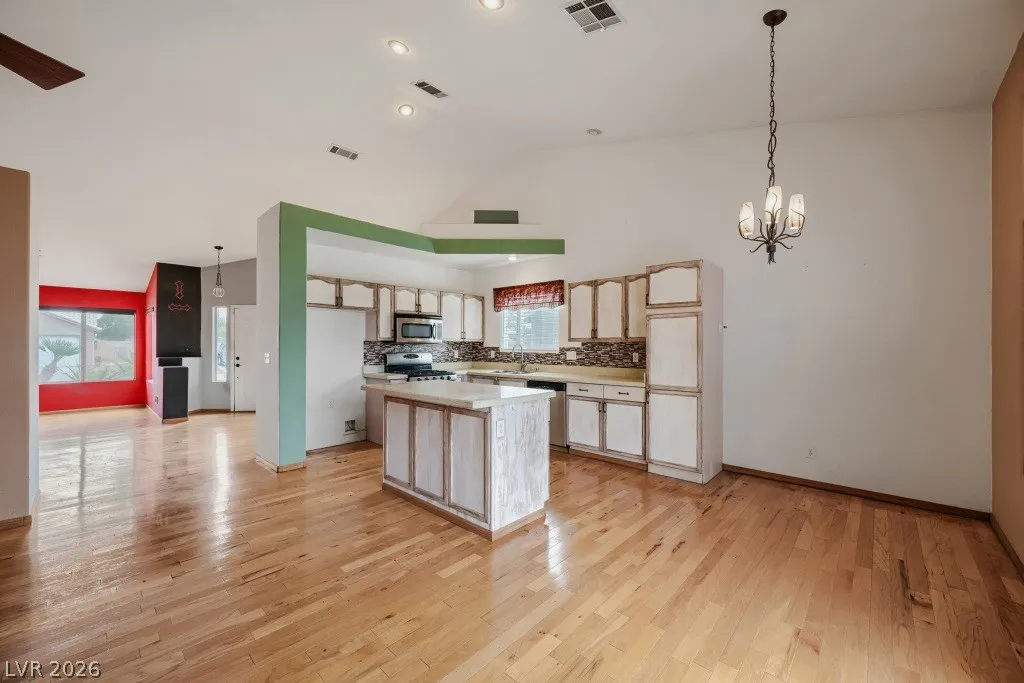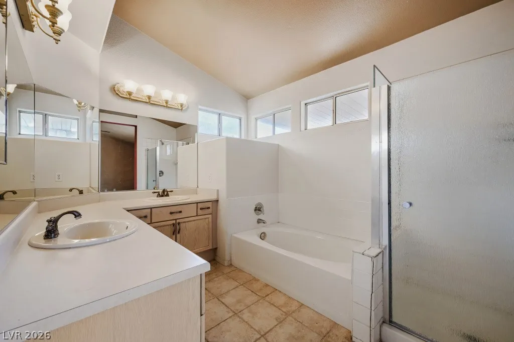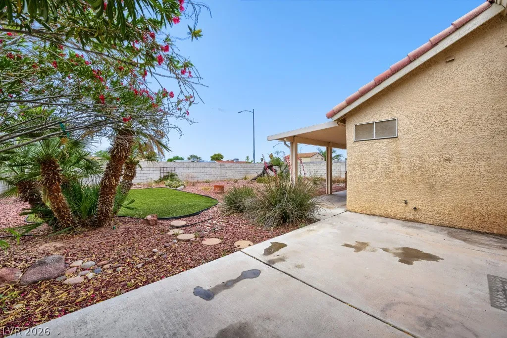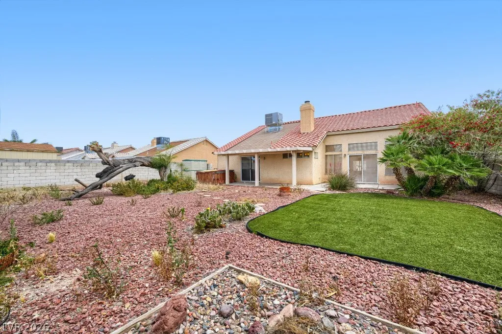Beautiful single-story home located within the guard-gated Palm Gardens community, offering 3 bedrooms, 2 full bathrooms, & an open, airy layout enhanced by vaulted ceilings throughout. With no rear neighbors, the backyard feels private & inviting—complete with synthetic grass, mature landscaping, & two patio areas, including a spacious covered patio accessible directly from the primary suite. Inside, the living room features a cozy fireplace, while the kitchen offers solid-surface countertops, an island, pantry, garden window, & a charming breakfast nook. The vaulted-ceiling design continues into the primary bedroom, which includes two generous closets and an ensuite bath with a separate shower, large soaking tub, & dual vanities. The extra-deep 3-car garage provides excellent storage or room for a workbench. Community amenities include multiple grassy park areas, tennis courts, & basketball courts, creating a well-rounded lifestyle setting.