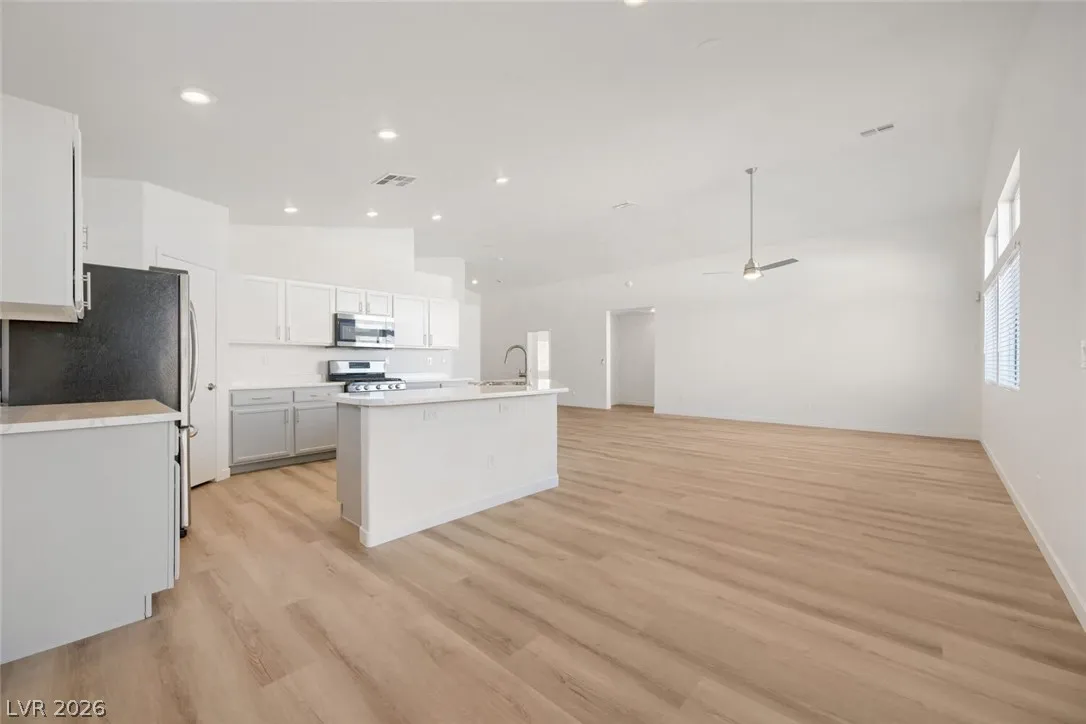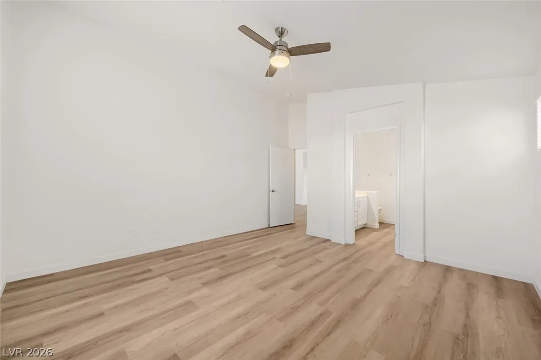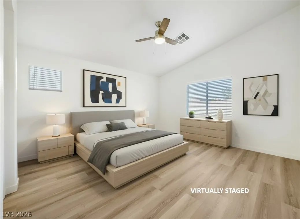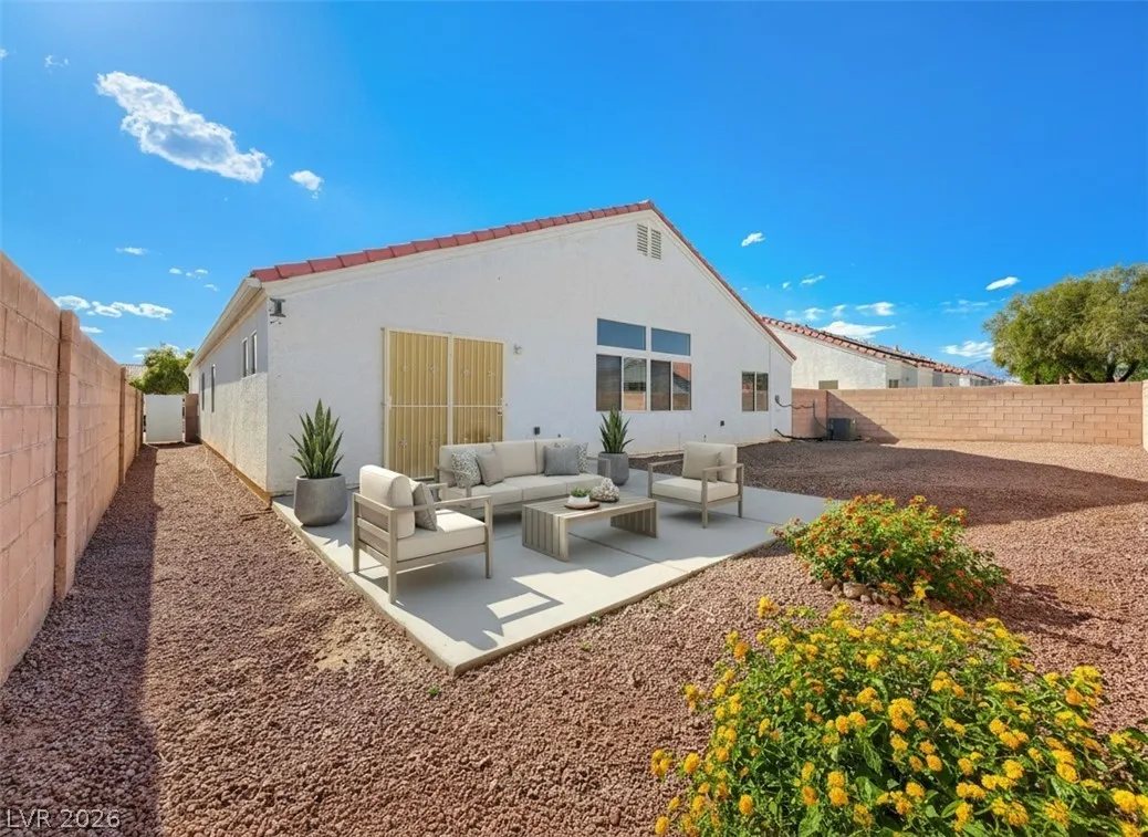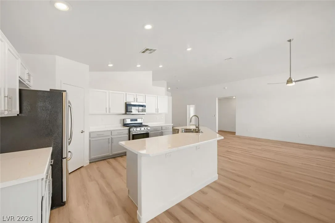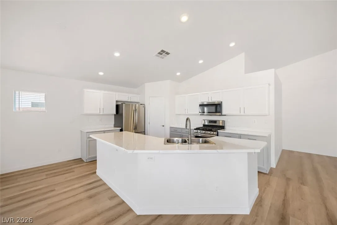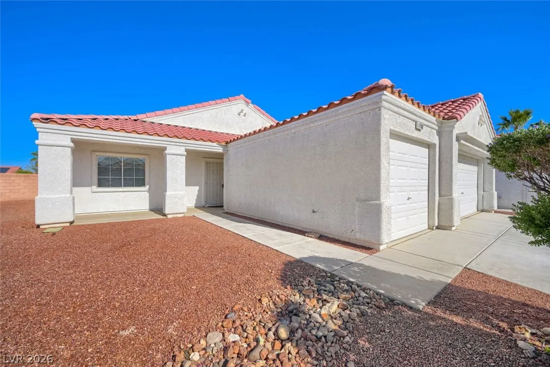 RARE SINGLE-STORY HOME WITH 4 BEDROOMS AND A 3- CAR GARAGE IN AN ALL-SINGLE-STORY COMMUNITY! Loaded with upgrades—brand new LVP flooring and baseboards, freshly painted interior and ceilings, new light fixtures, ceiling fans, epoxy kitchen counters, updated outlets and switches, freshly painted cabinets with new hardware, and new blinds throughout. Open floor plan with vaulted ceilings and abundant natural light. Kitchen features a large island, dining nook, recessed lighting, and step-in pantry. Spacious primary suite offers vaulted ceilings, dual sinks, separate tub and shower, and large walk-in closet. Three additional bedrooms plus guest bath with tub/shower combo. Laundry room with cabinets provides extra storage. Low-maintenance backyard with patio and rock landscaping. Security doors on front and back create a refreshing cross breeze—move-in ready and a must-see!