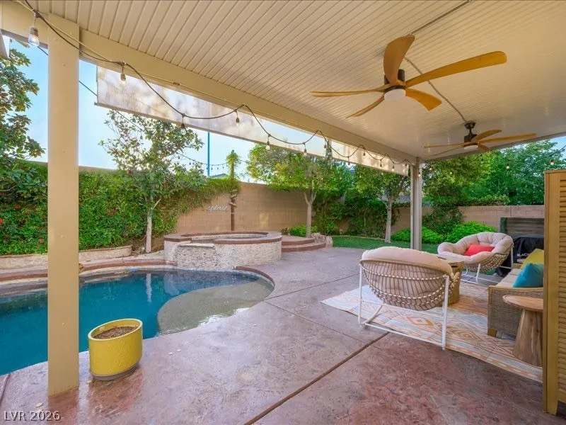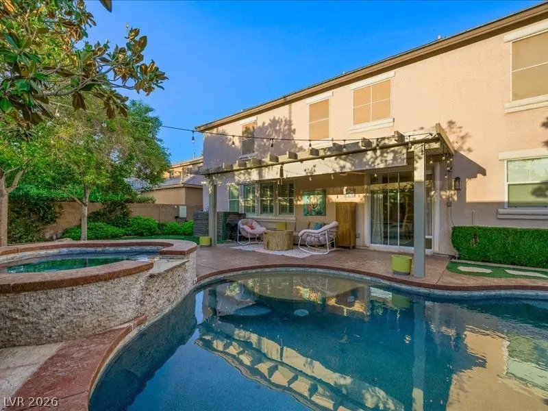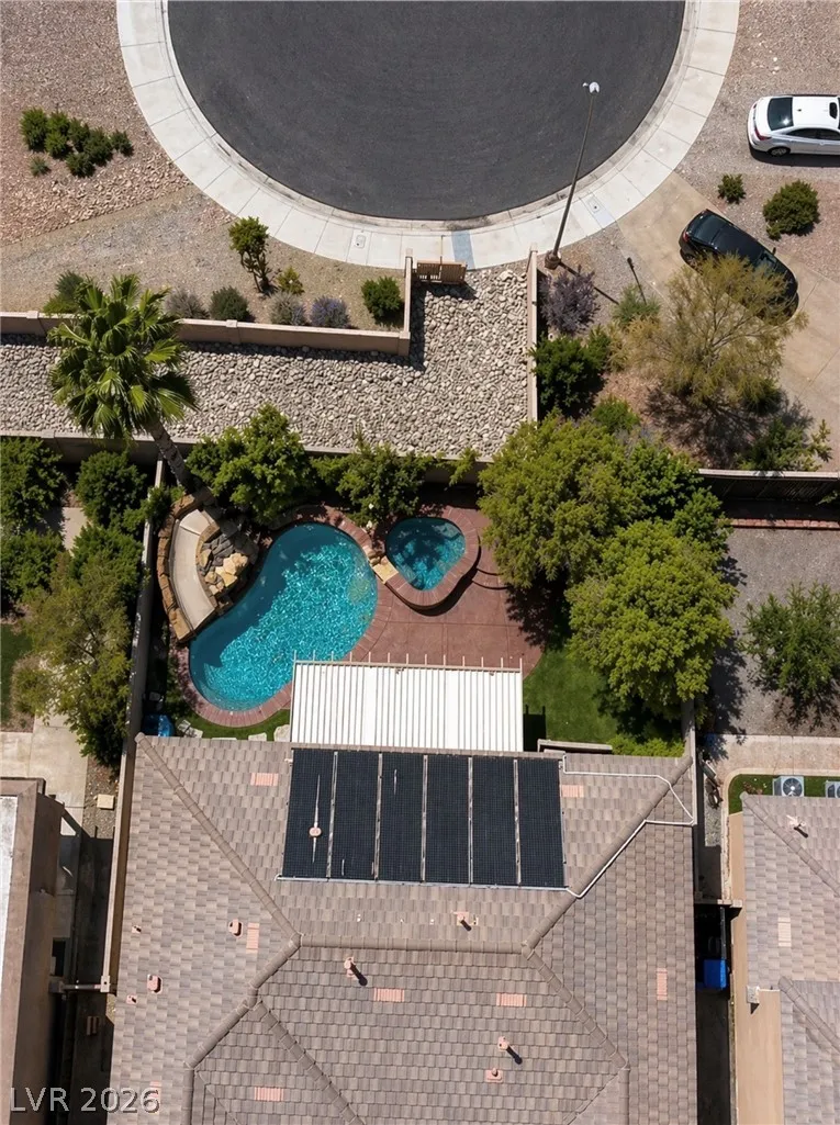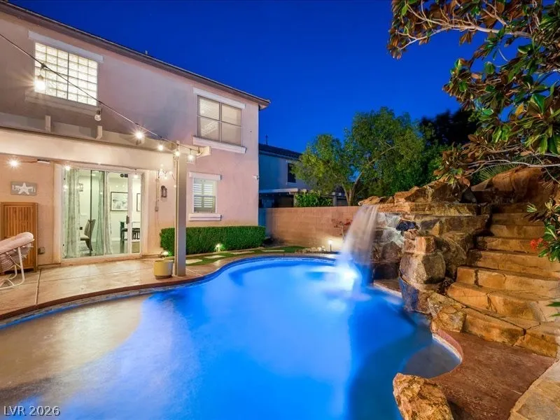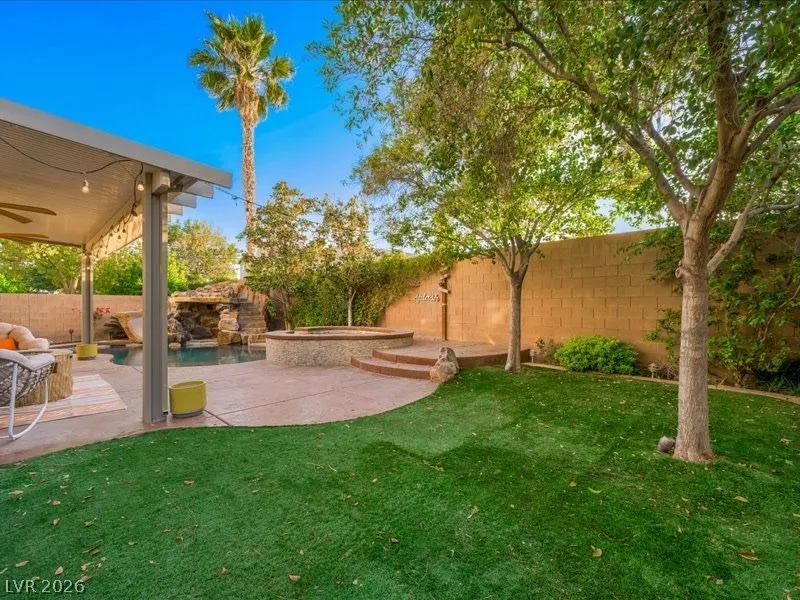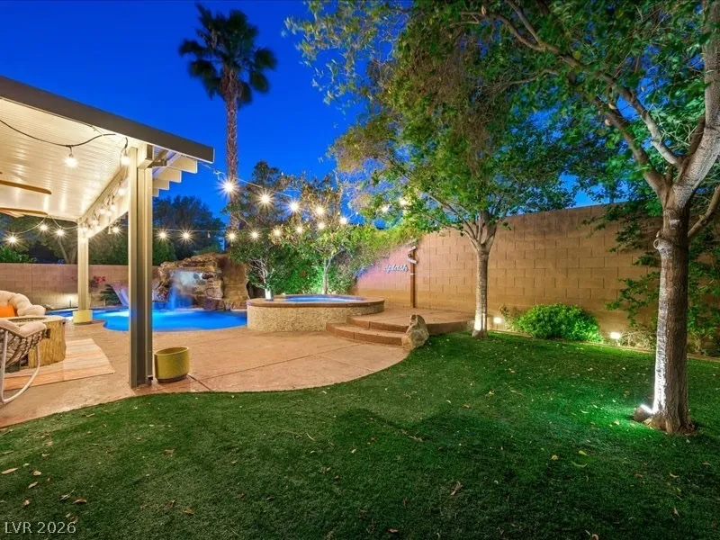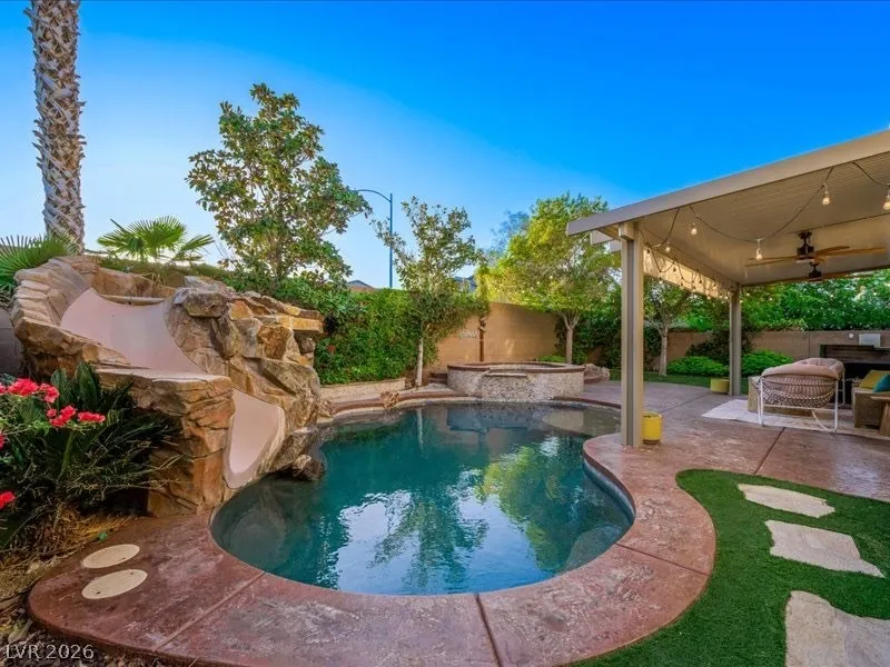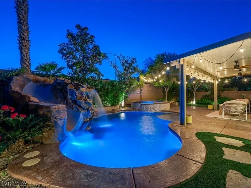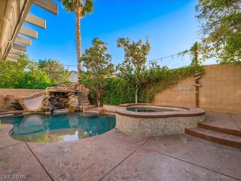 Fully renovated and truly move-in ready, this stunning 4 bed, 2.5 bath home w/ a den and a loft, blends luxury, function, and lifestyle. The expansive 4-car tandem garage features a built-in workbench and abundant overhead storage, perfect for hobbies, toys, or extra space. Step into your private tropical oasis with a resort-style backyard showcasing an inground pool and spa, rock slide, and natural stone grotto, all solar-heated and app-controlled for effortless enjoyment. Mature landscaping includes two beautiful magnolia trees, complemented by a large covered patio and low-maintenance artificial turf. Inside, every detail has been upgraded, including a designer kitchen and a spa-inspired primary bath with marble tile floors and surround. Smart home features include Alexa-controlled switches, smart thermostat, and permanent Jellyfish exterior lighting with customizable designs. Lovingly maintained by the original owners, this home is filled with warmth, style, and modern convenience.