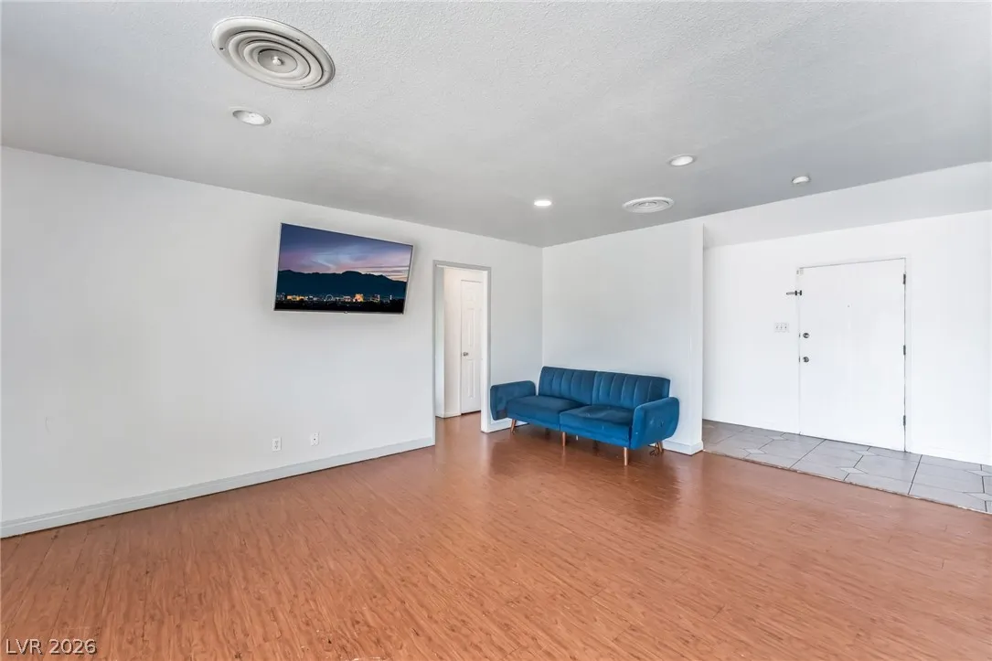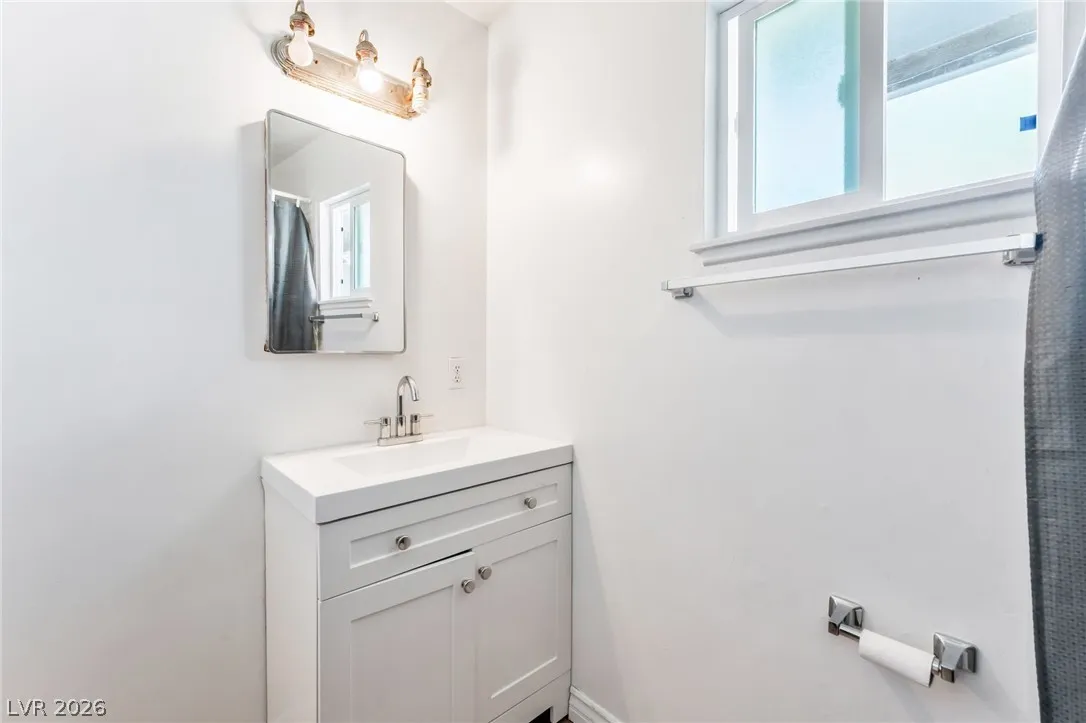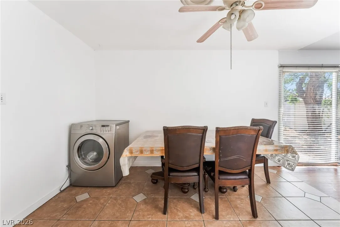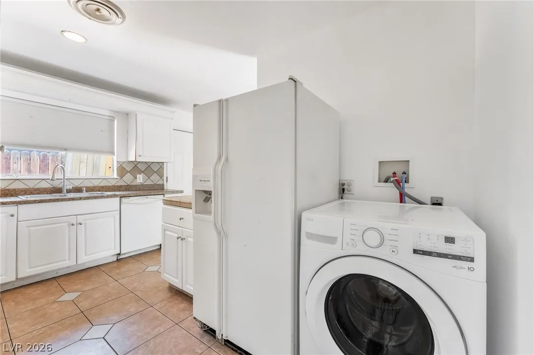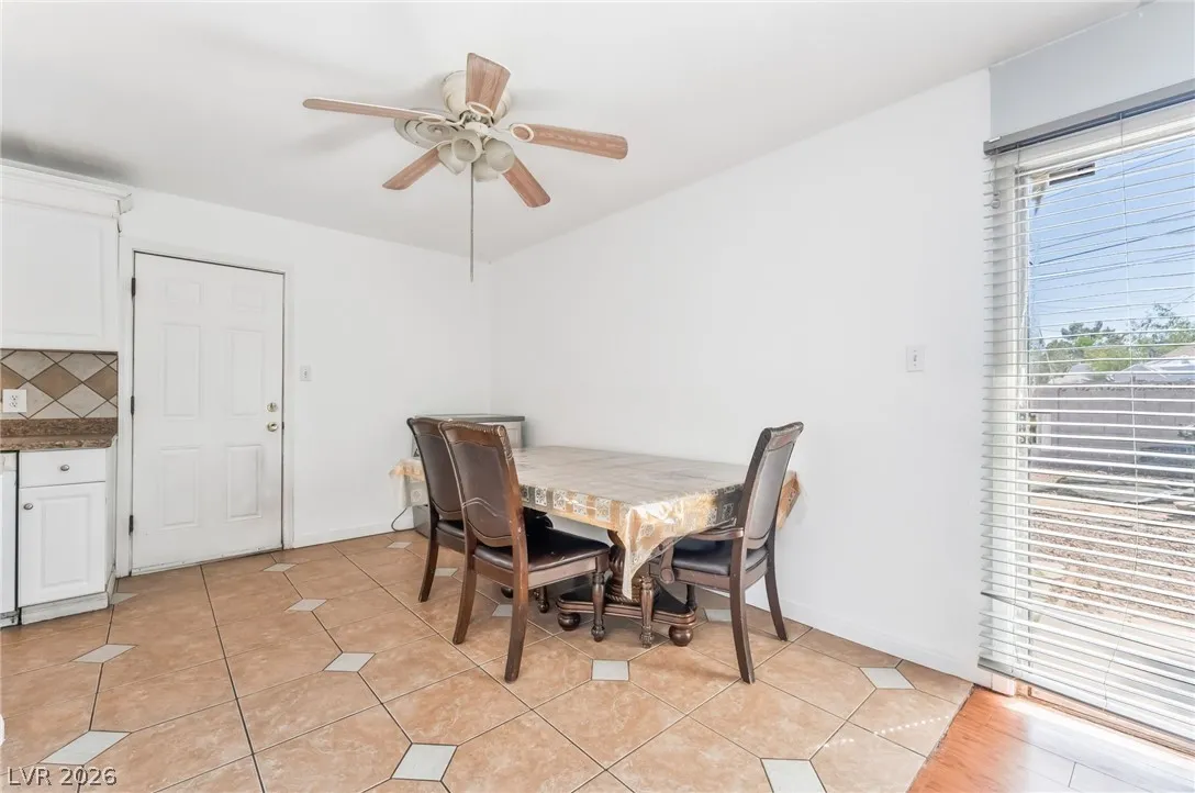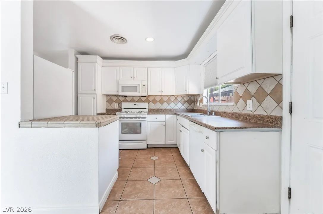This house offers a design and updated finishes throughout its functional floor plan. The interior is defined by a mix of durable wood style laminate and large format tile flooring, providing a cohesive and low maintenance aesthetic across all living areas. In the kitchen, crisp white cabinetry is paired with classic tile backsplashes and a wrap around counter that includes a breakfast bar for casual dining. The bathrooms are thoughtfully refreshed with modern vanities, including a clean pedestal sink in the powder room and updated cabinetry in the full baths, all complemented by bright neutral tones. The outdoor space is exceptionally spacious, featuring a large gravel backyard designed for versatility and ease of care, alongside a sizeable covered carport that provides sheltered parking and additional storage potential. With its clean lines and move in ready condition.