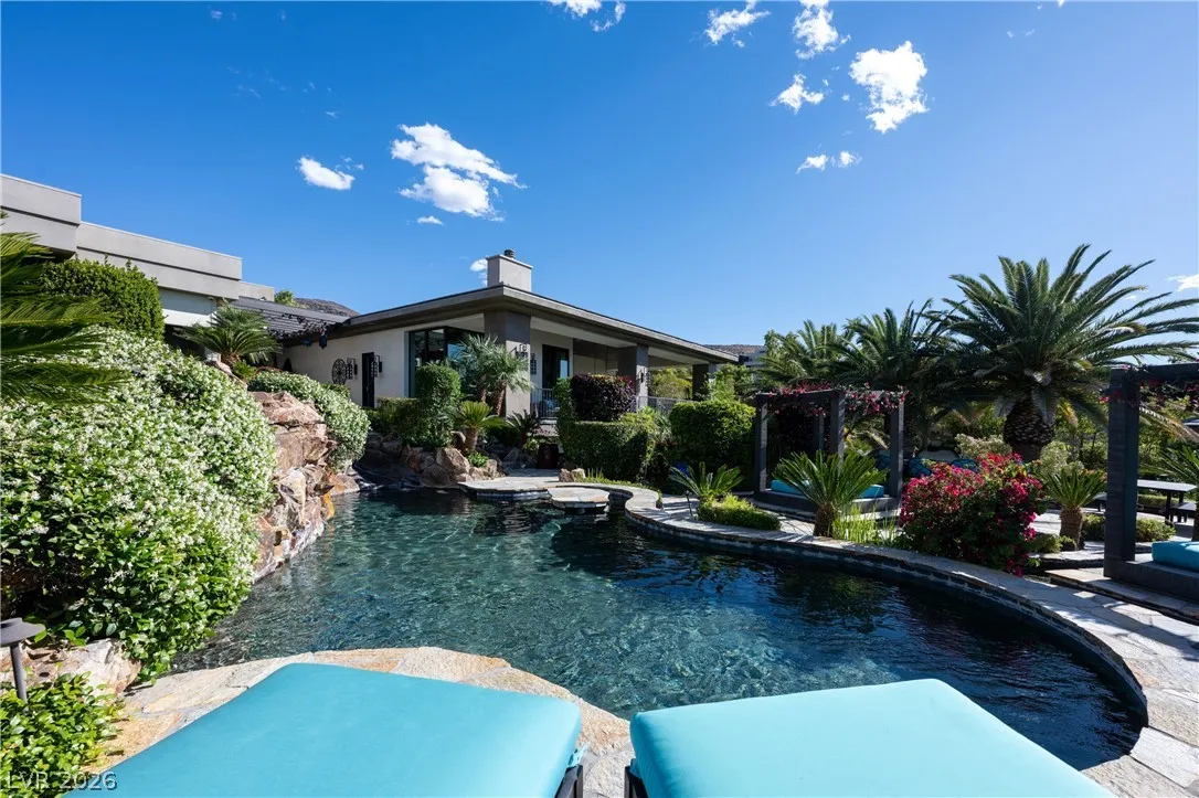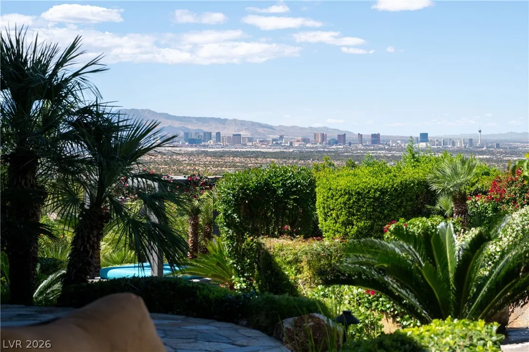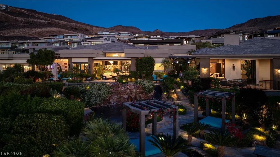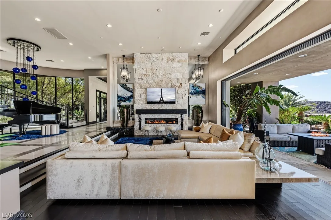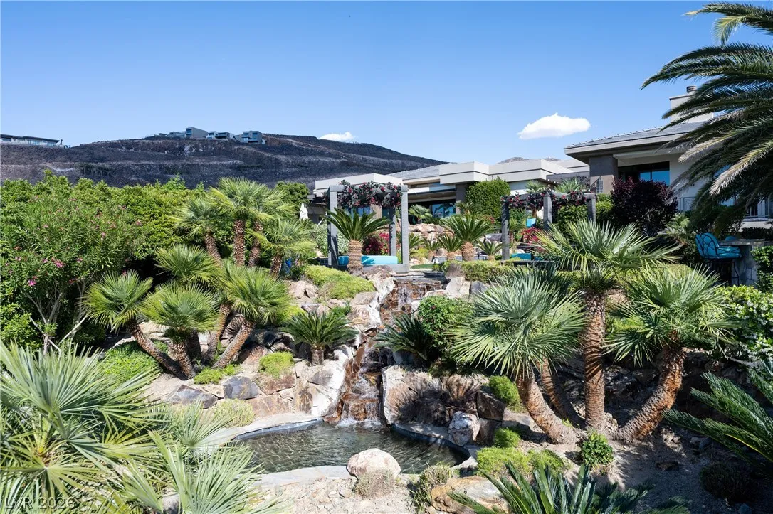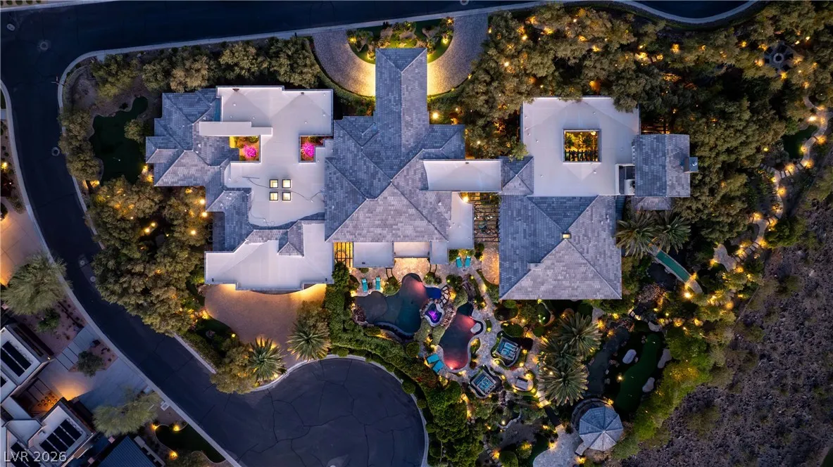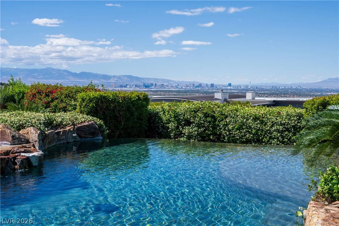 Step into a realm where luxury meets the sky. This 6-bedroom masterpiece frames unobstructed Las Vegas Strip views through floor-to-ceiling retractable glass, merging indoor elegance with an outdoor oasis. A grand staircase and sacred Tibetan stone fireplace anchor the living space, while the gourmet kitchen — with its extended island, butler’s pantry, and cocktail bar — invites culinary artistry. Retreat to the primary suite, featuring a private coffee bar, fireside sitting area, and panoramic balcony. Outside, a resort awaits: 2 pools, 2 spas, 7 cascading waterfalls, and an outdoor kitchen. Indulge in the 12-seat theater, wellness wing with steam/sauna, gym, and wine grotto. Set within the prestigious, guard-gated MacDonald Highlands, this estate offers an exclusive lifestyle defined by privacy, security, and world-class amenities. Opportunities to own a sanctuary of this magnitude, complete with a 7-car garage and multi-gen ensuites, are exceedingly rare. A true entertainer’s dream.