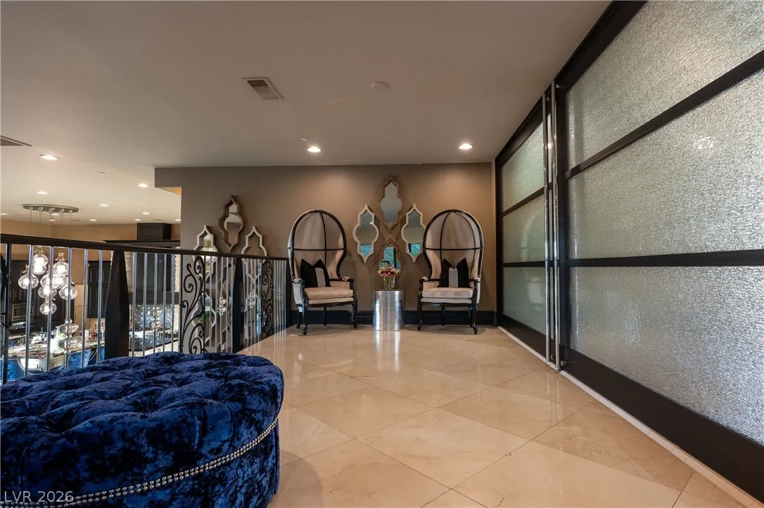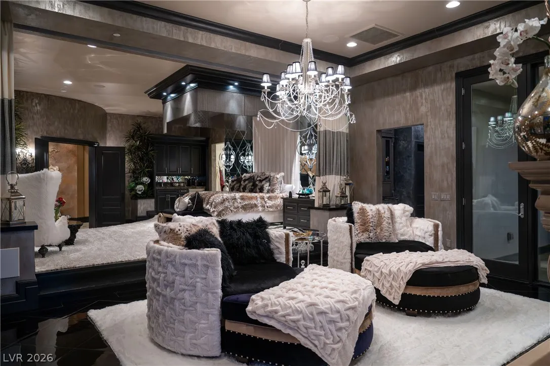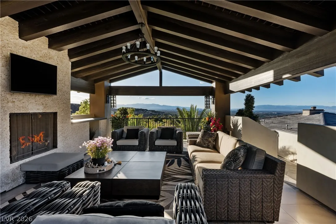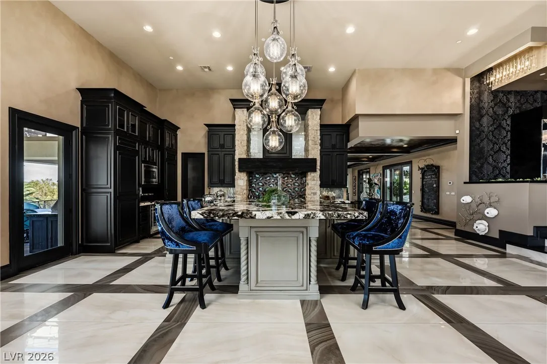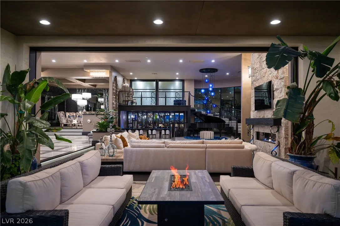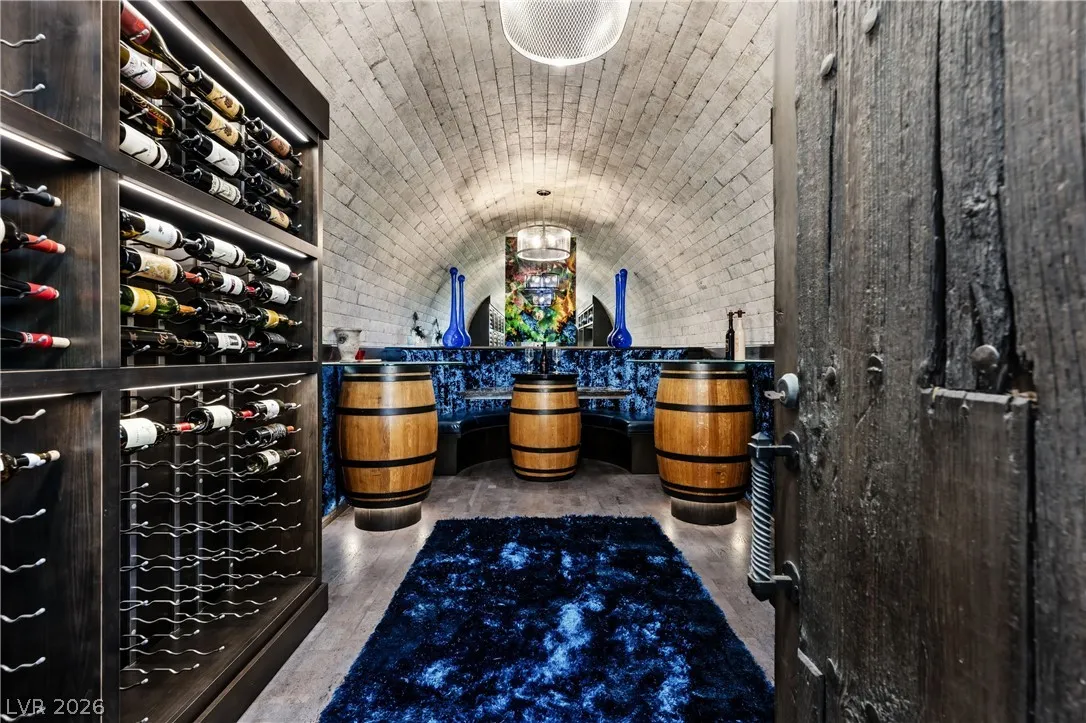 Step into a realm where luxury meets the sky. This 6-bedroom masterpiece frames unobstructed Las Vegas Strip views through floor-to-ceiling retractable glass, merging indoor elegance with an outdoor oasis. A grand staircase and sacred Tibetan stone fireplace anchor the living space, while the gourmet kitchen — with its extended island, butler’s pantry, and cocktail bar — invites culinary artistry. Retreat to the primary suite, featuring a private coffee bar, fireside sitting area, and panoramic balcony. Outside, a resort awaits: 2 pools, 2 spas, 7 cascading waterfalls, and an outdoor kitchen. Indulge in the 12-seat theater, wellness wing with steam/sauna, gym, and wine grotto. Set within the prestigious, guard-gated MacDonald Highlands, this estate offers an exclusive lifestyle defined by privacy, security, and world-class amenities. Opportunities to own a sanctuary of this magnitude, complete with a 7-car garage and multi-gen ensuites, are exceedingly rare. A true entertainer’s dream.